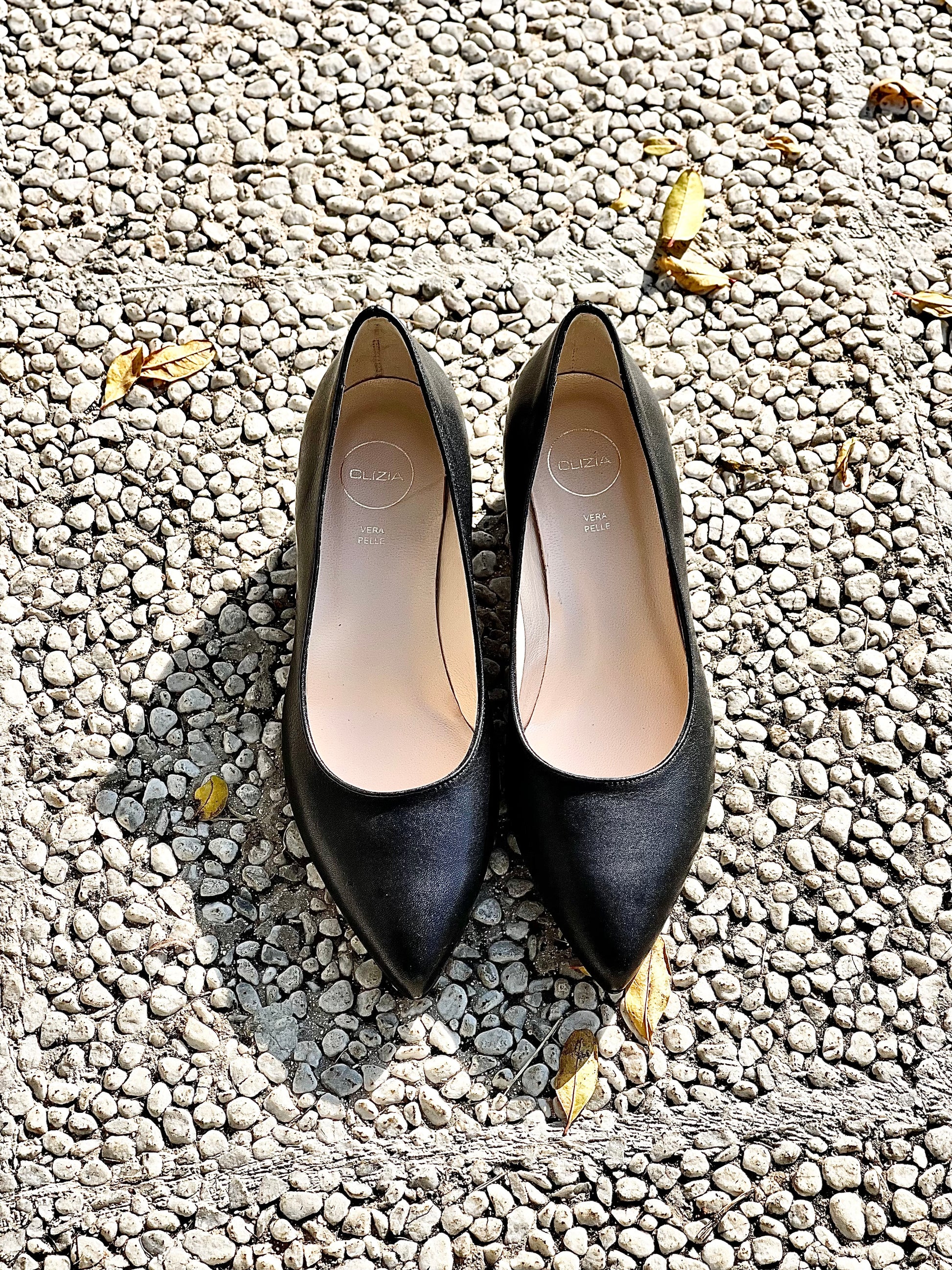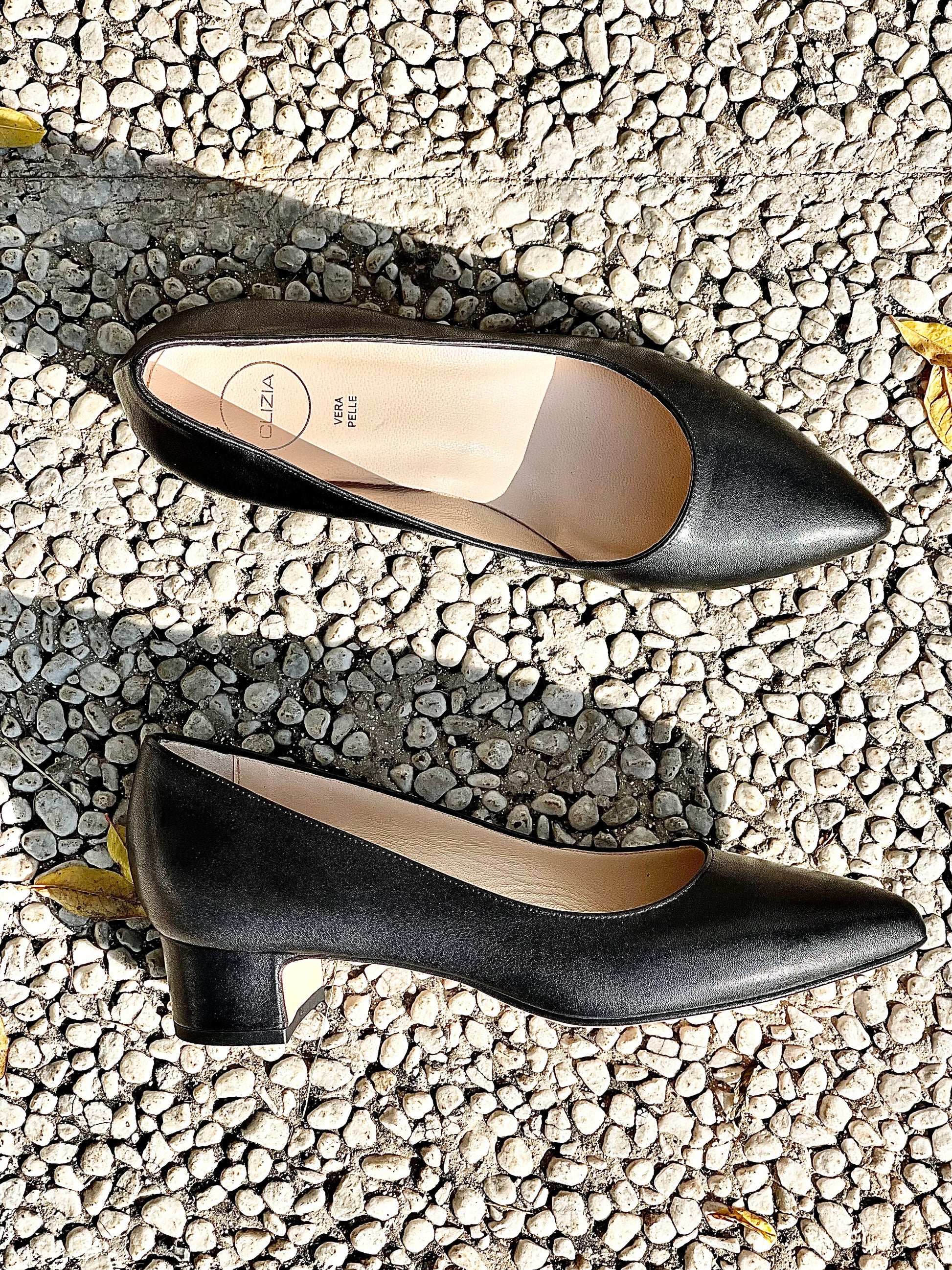 Escarpin à bout pointu en cuir à talon large de 35 mm.