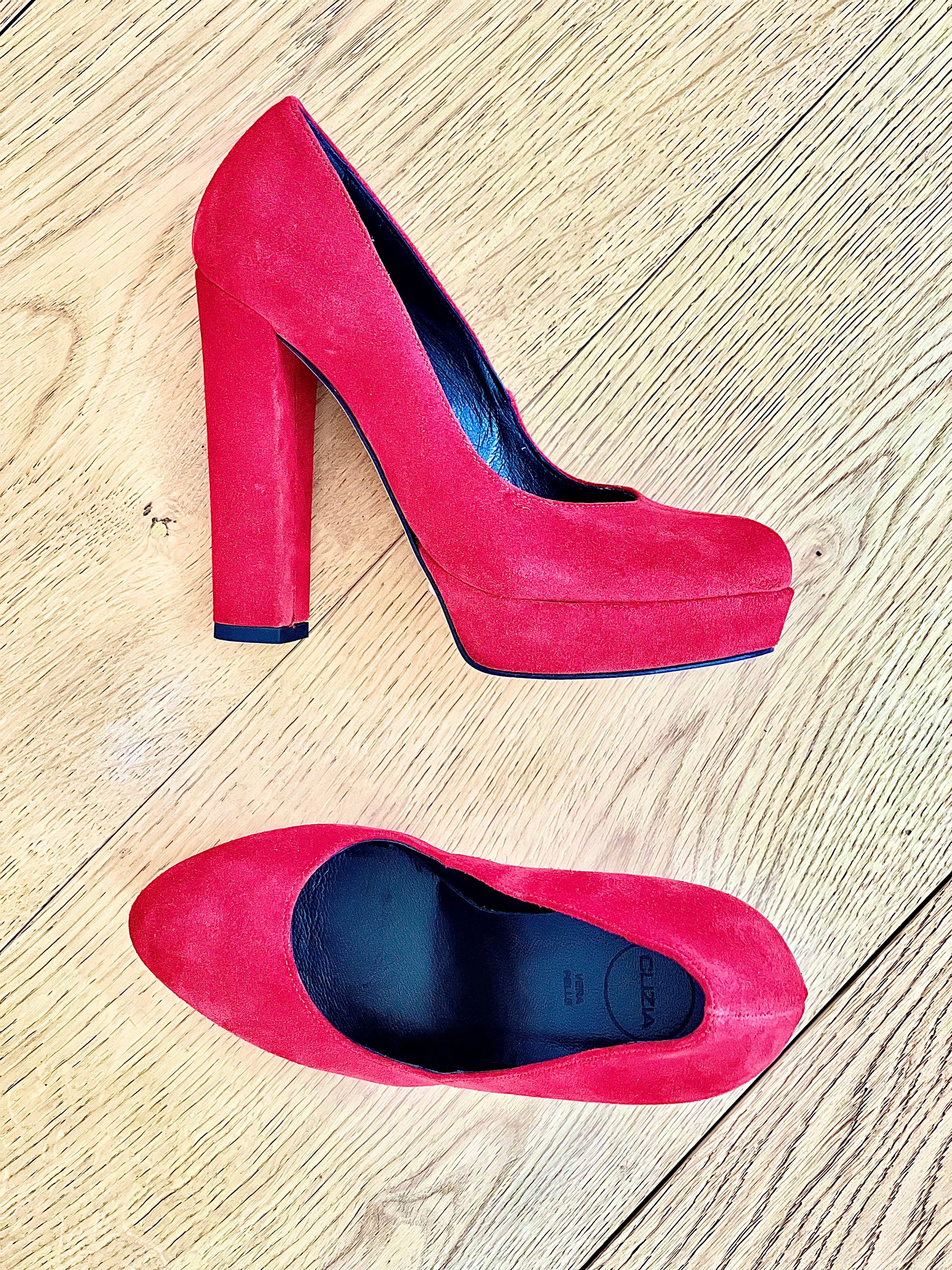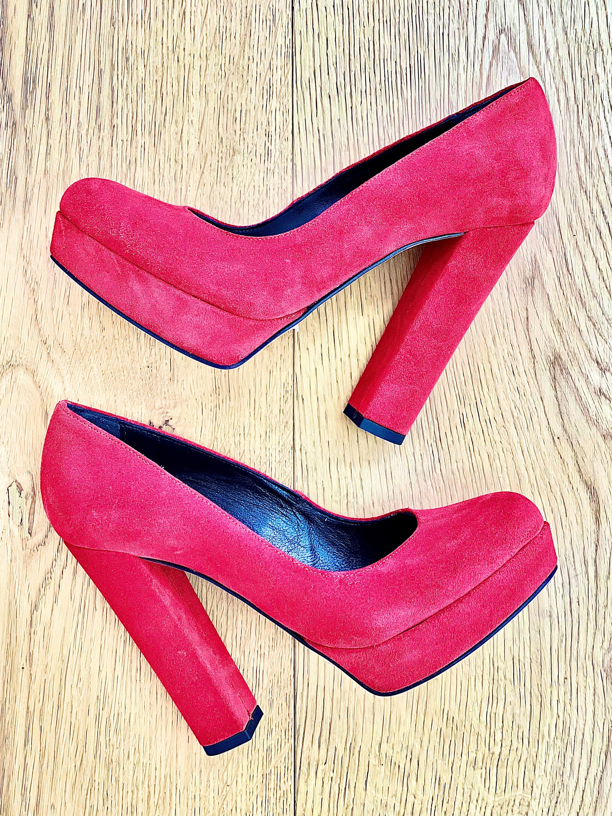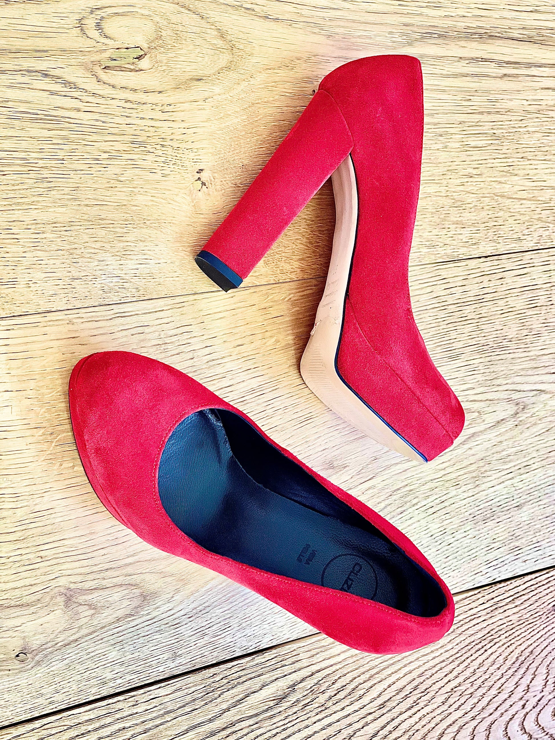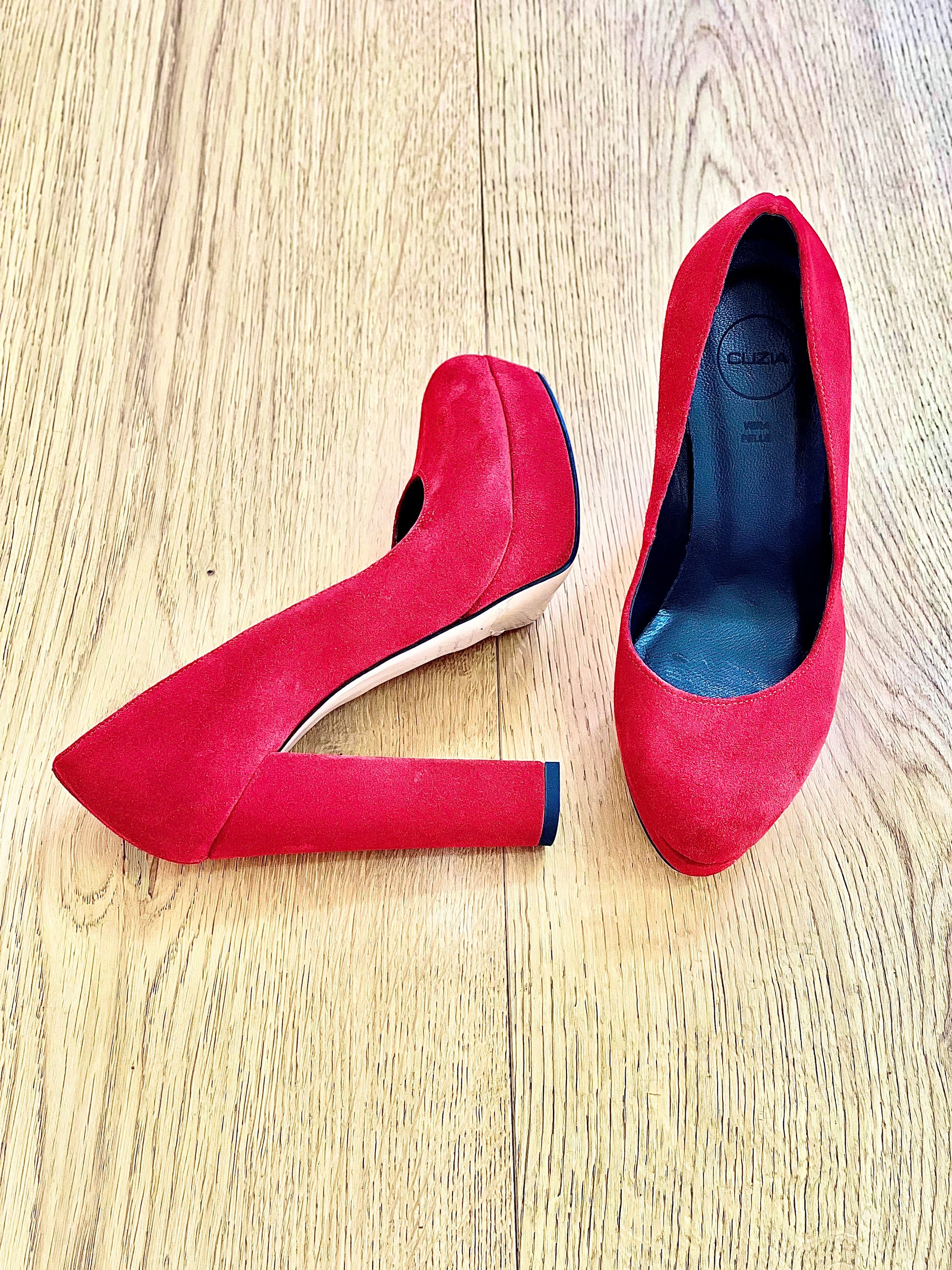 Décolleté en daim à bout rond, talon haut de 12 cm et plateforme de 3 cm.