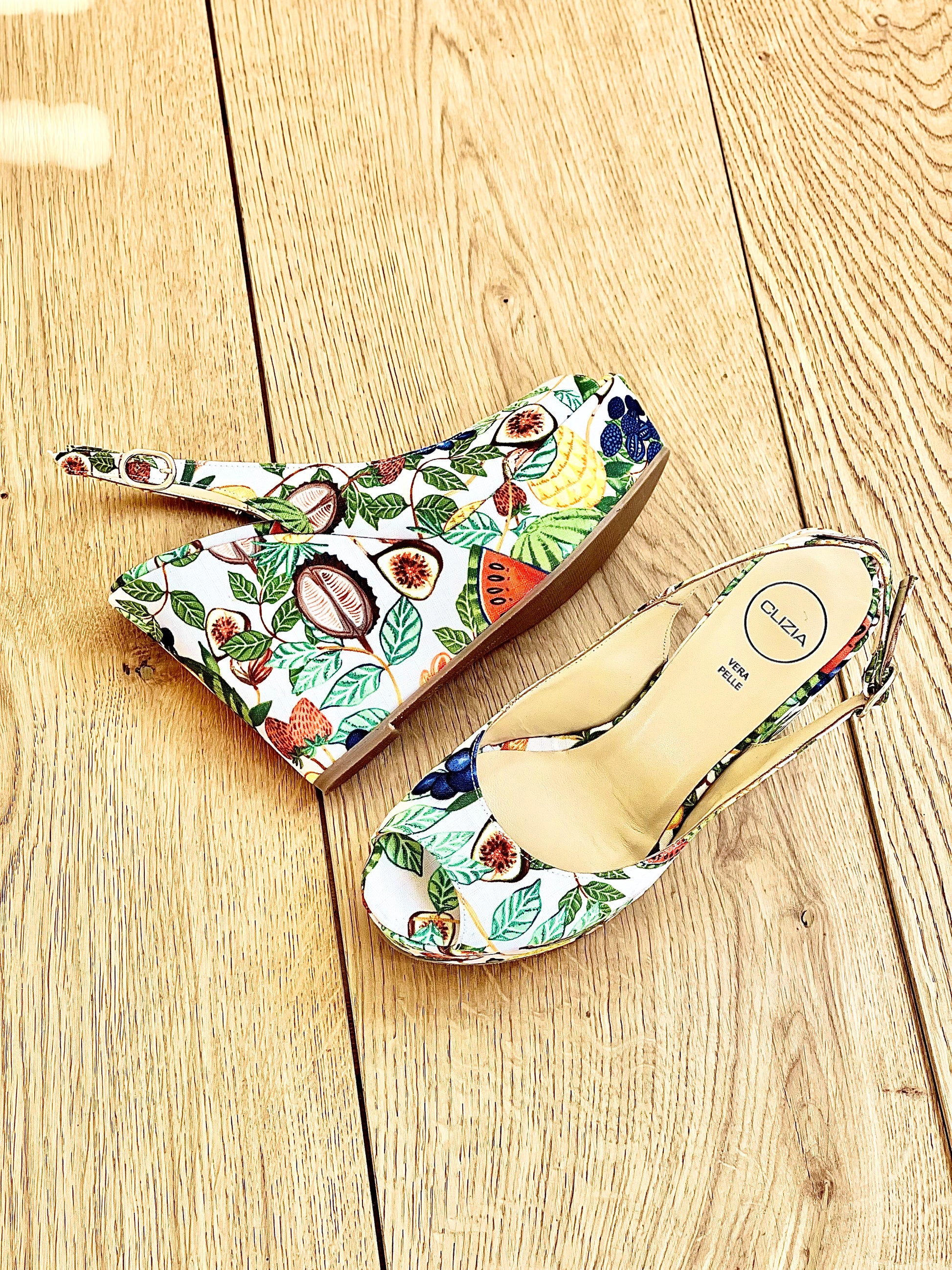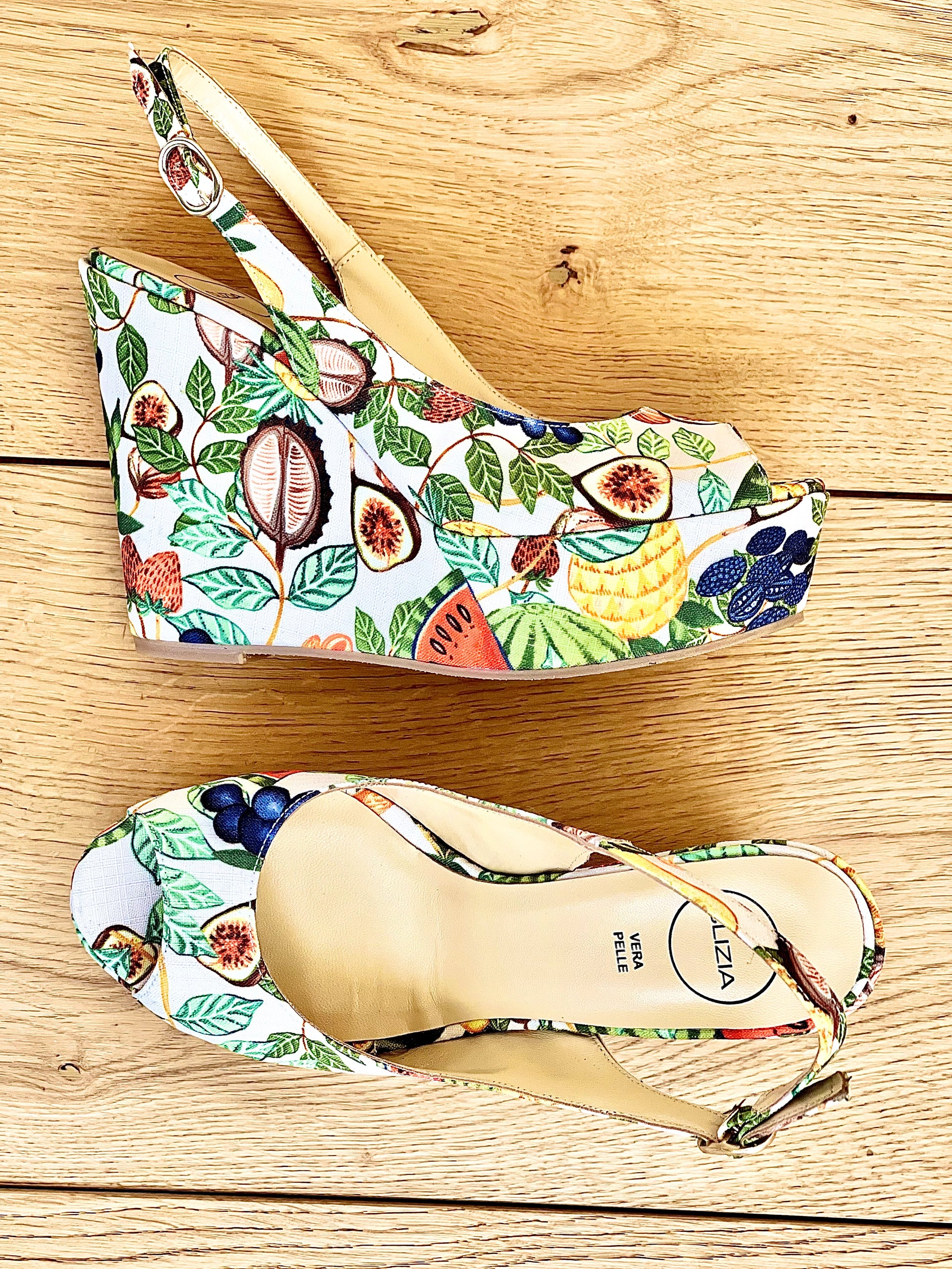 Escarpins multicolores à bout ouvert et à talon compensé.