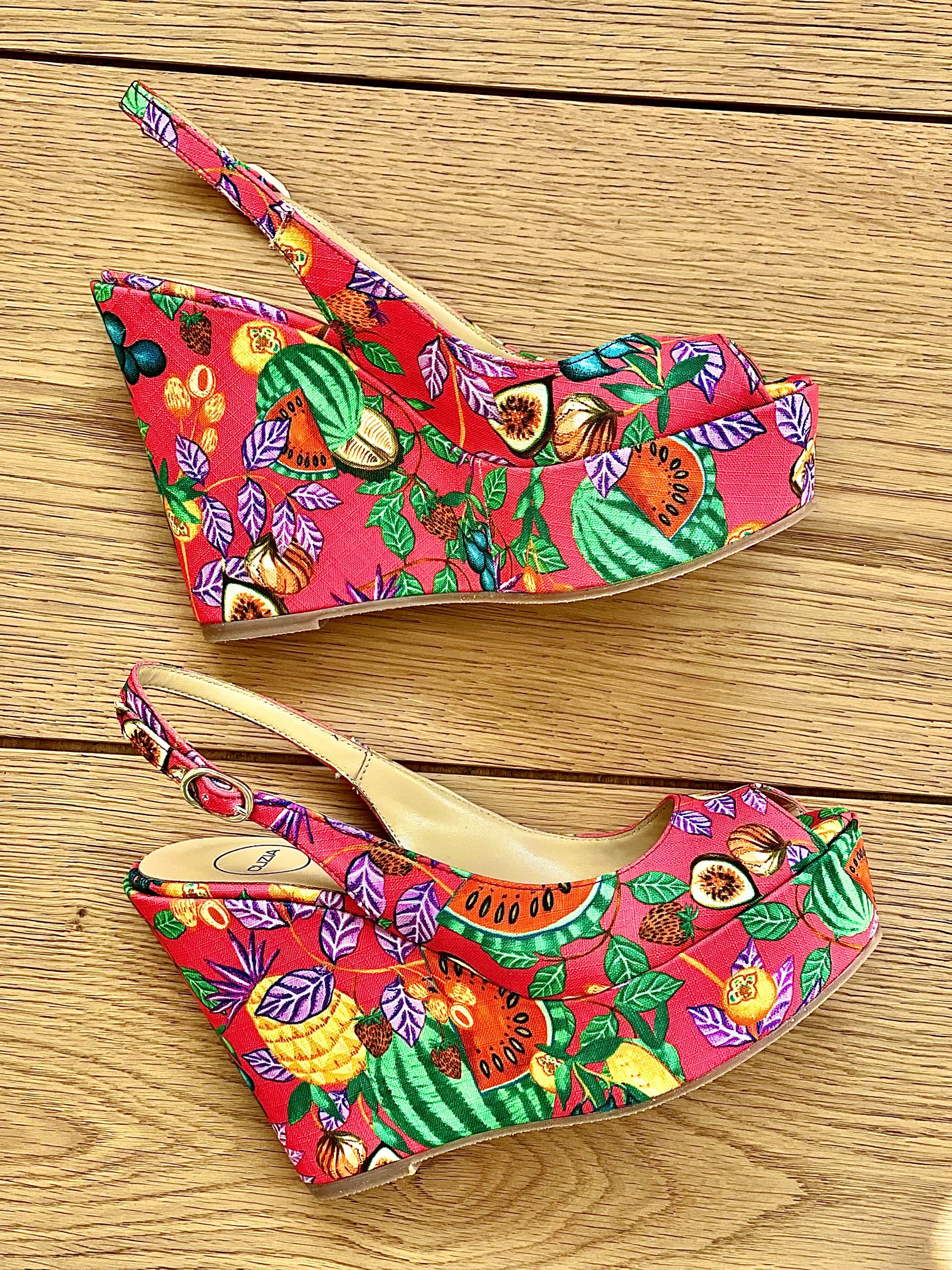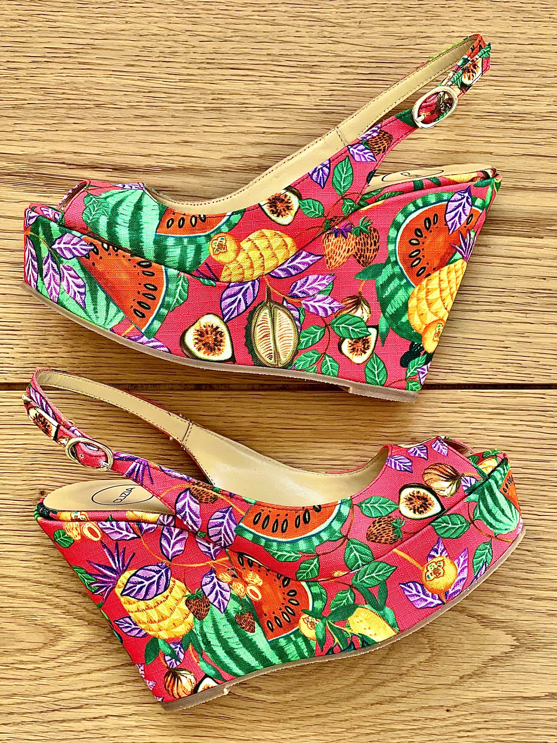 Escarpins multicolores à bout ouvert et à talon compensé.