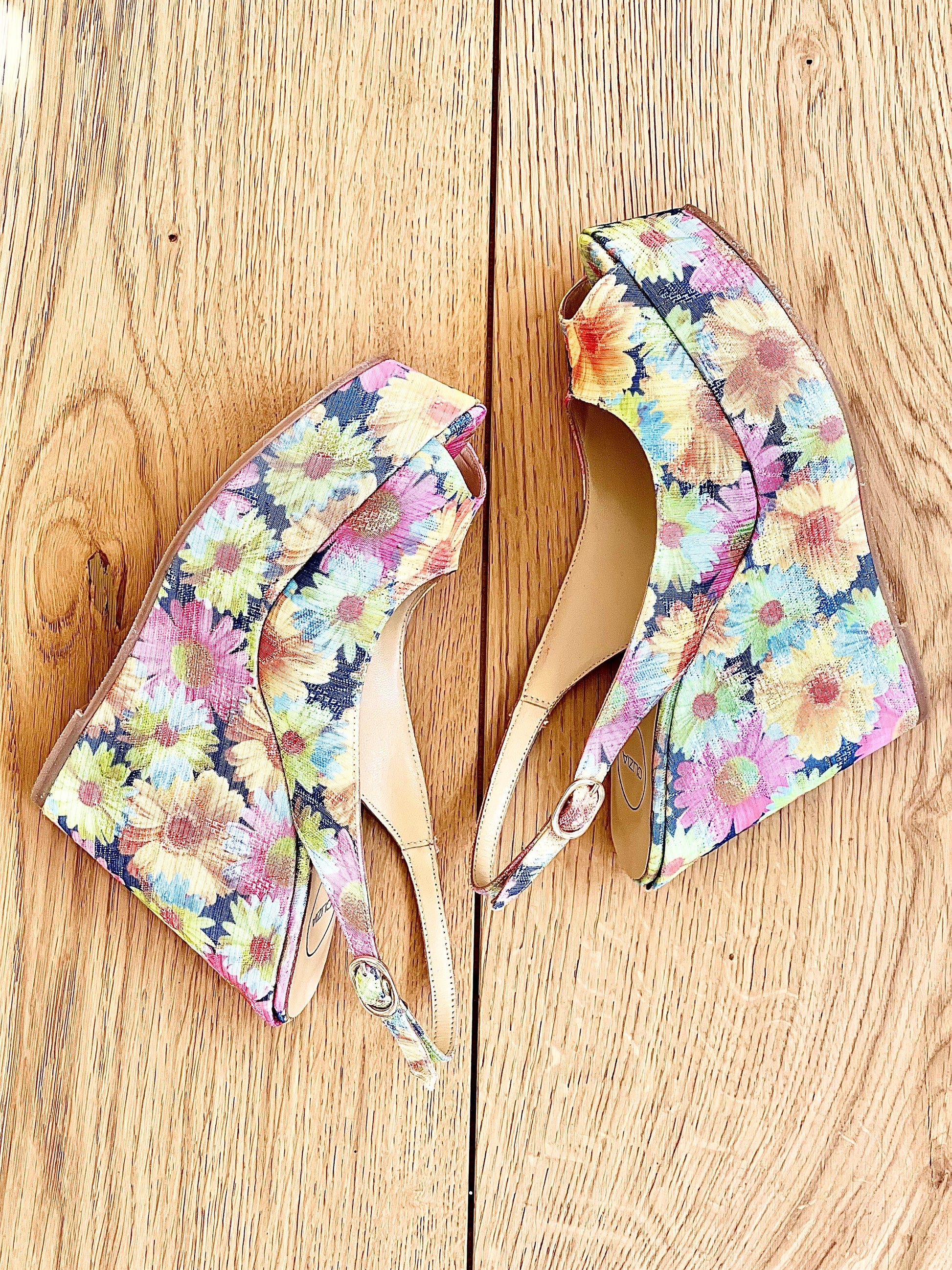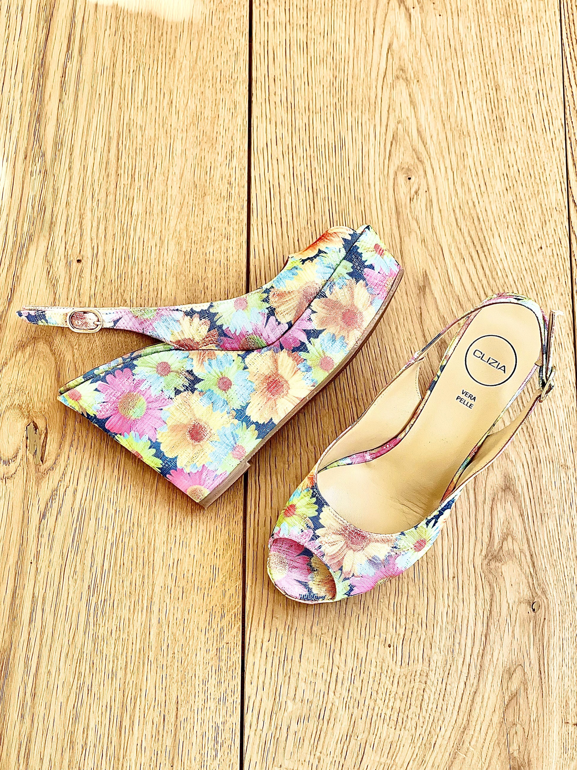 Escarpins à bout ouvert, à talon compensé et à fleurs multicolores.