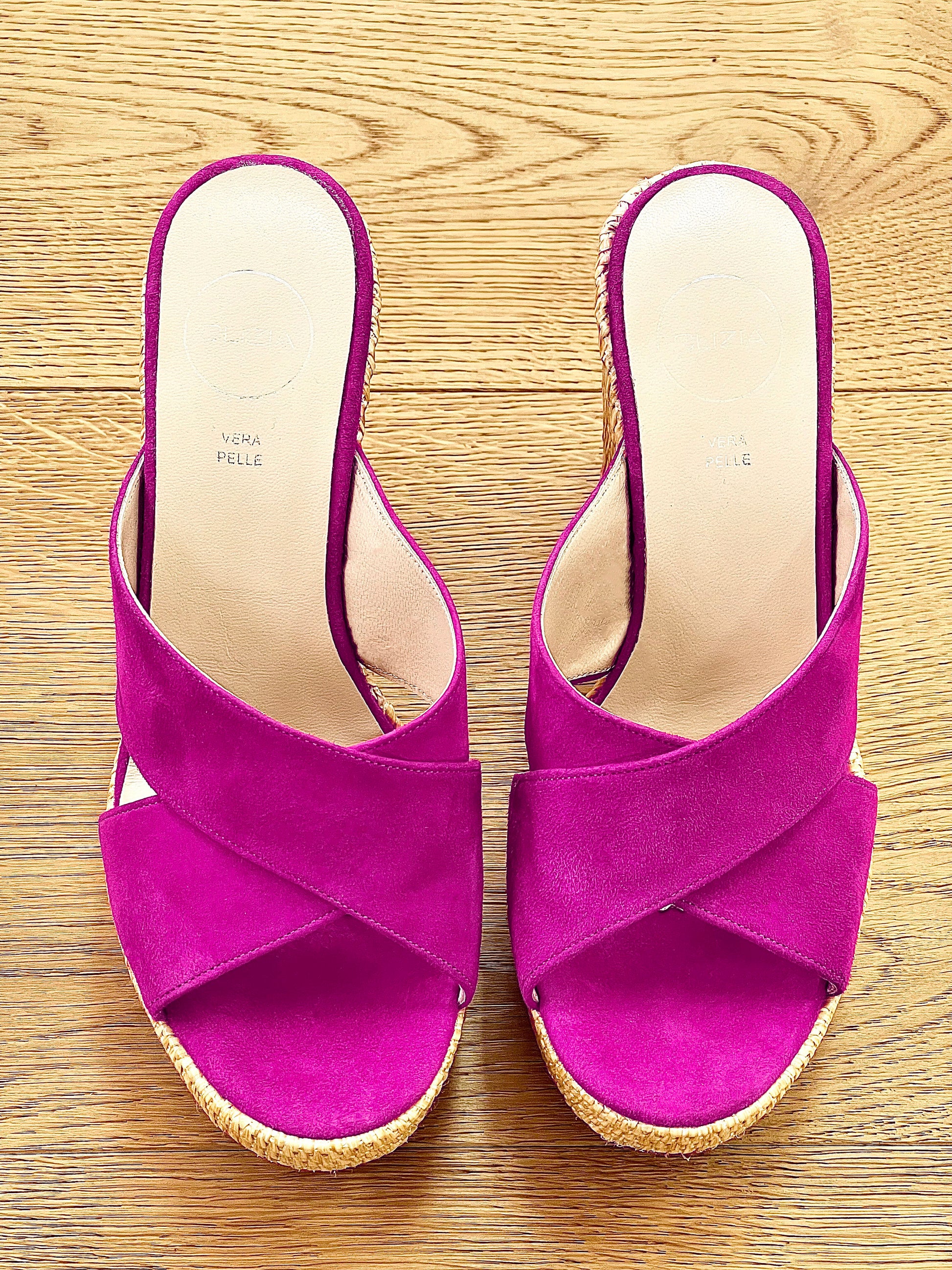 Sandales croisées à talon compensé en raphia.