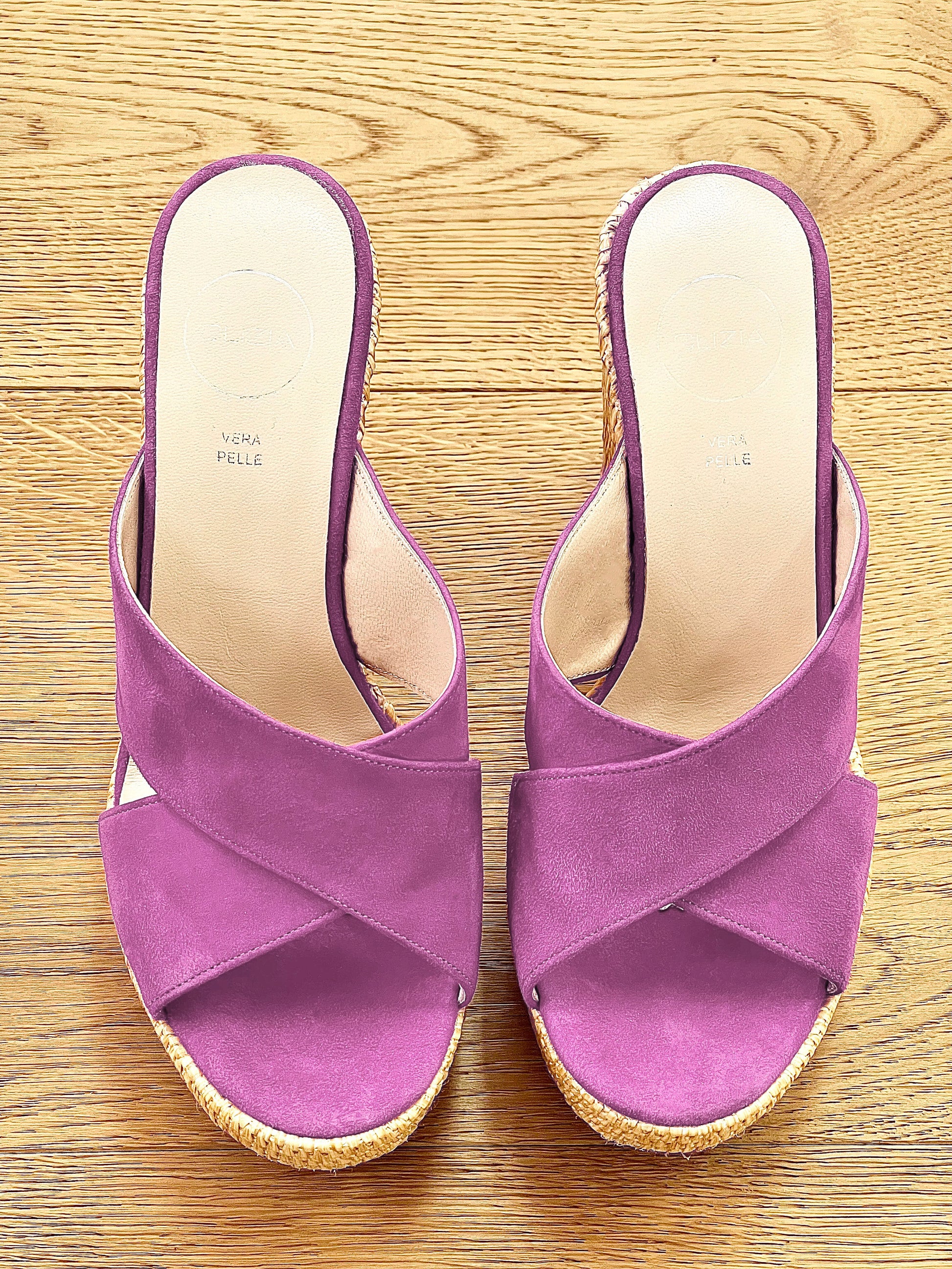 Sandales croisées à talon compensé en raphia.