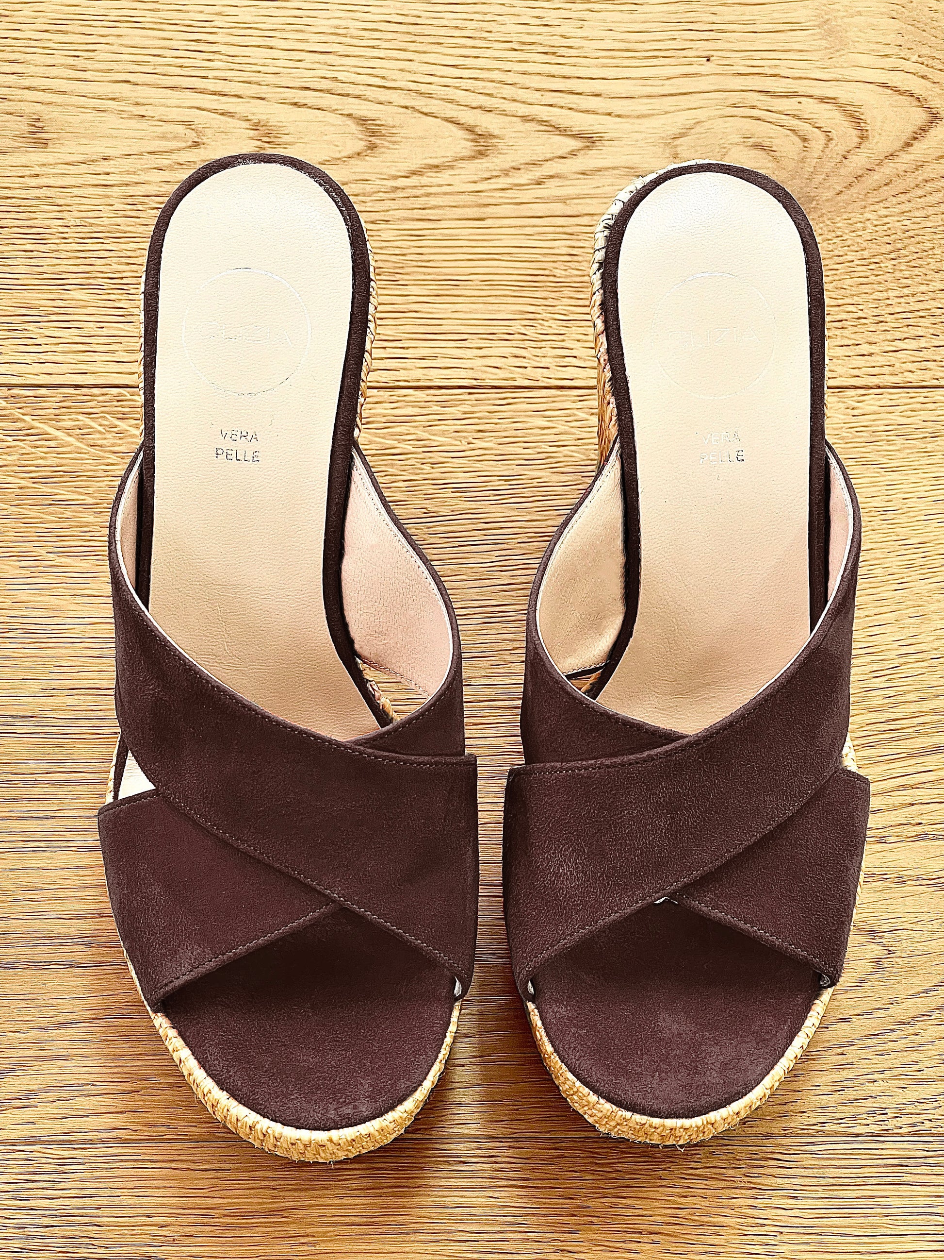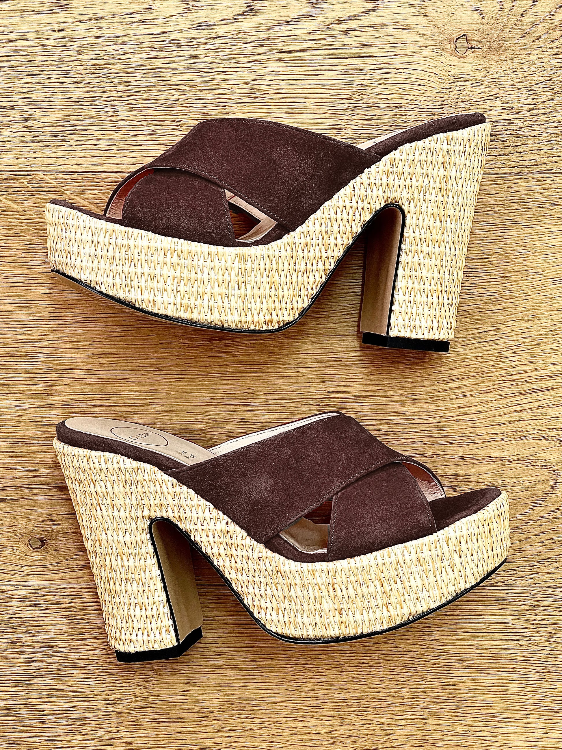 Sandales croisées à talon compensé en raphia.