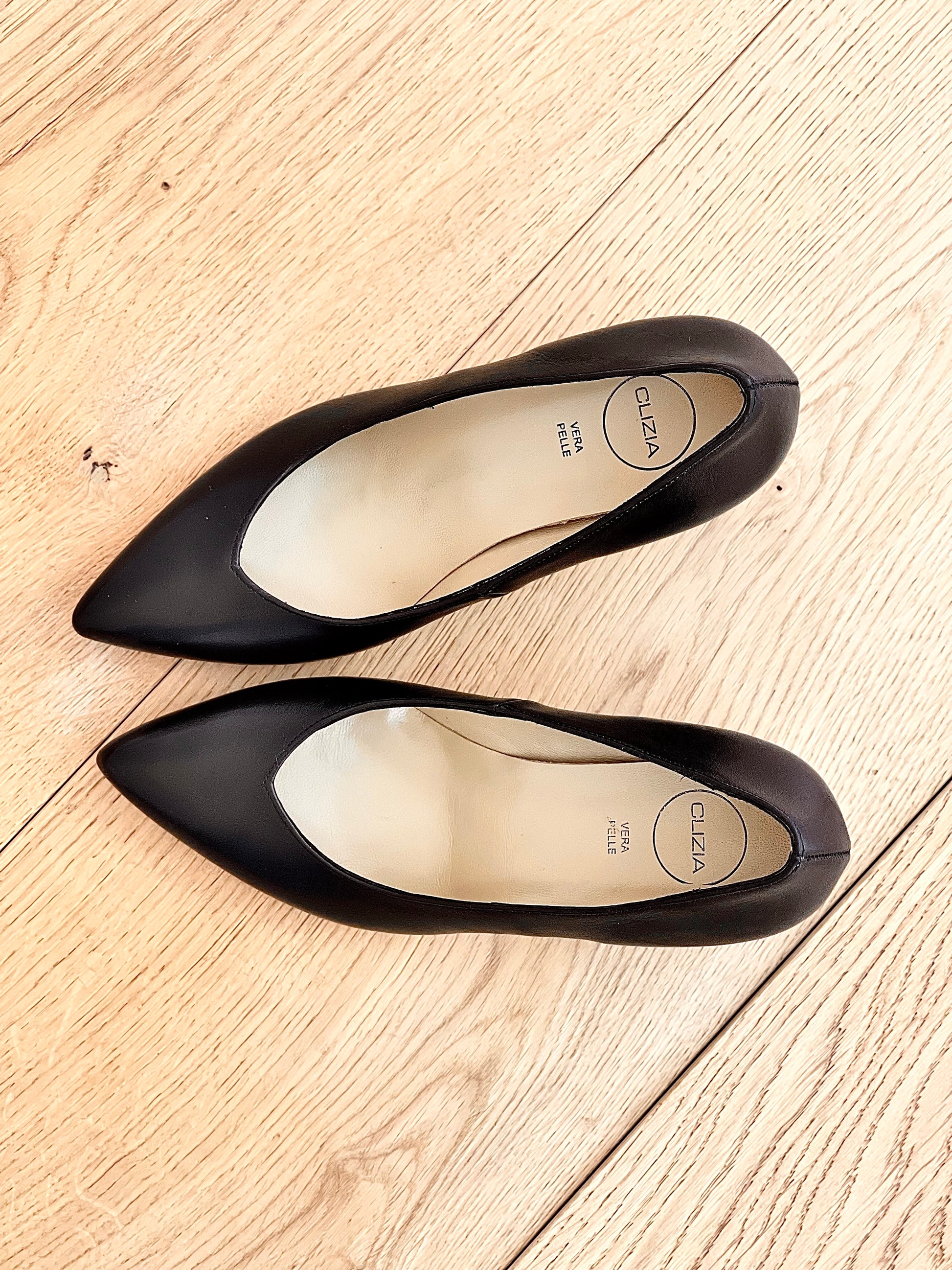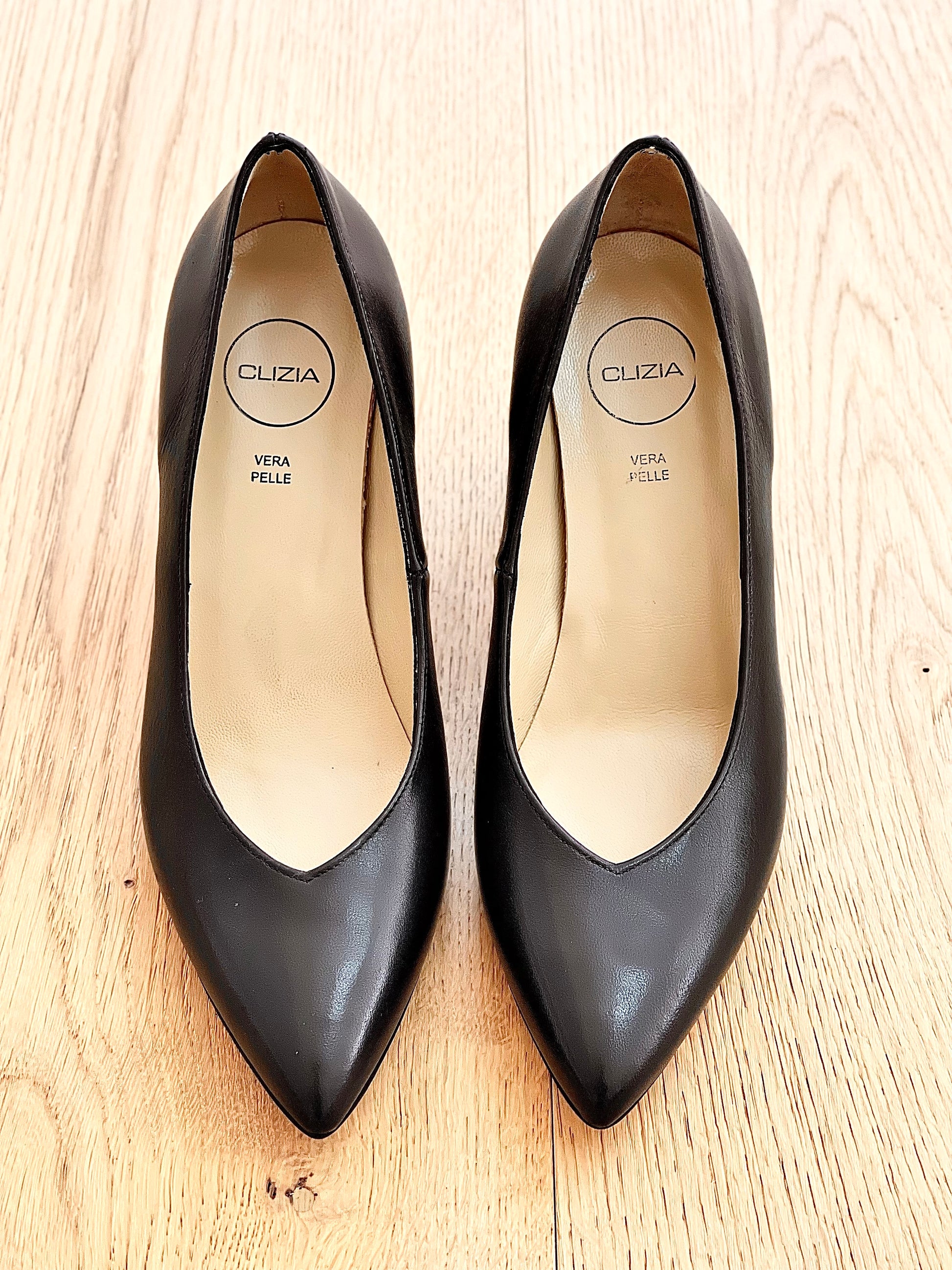 Escarpin à bout pointu et col en V en cuir à talon large.