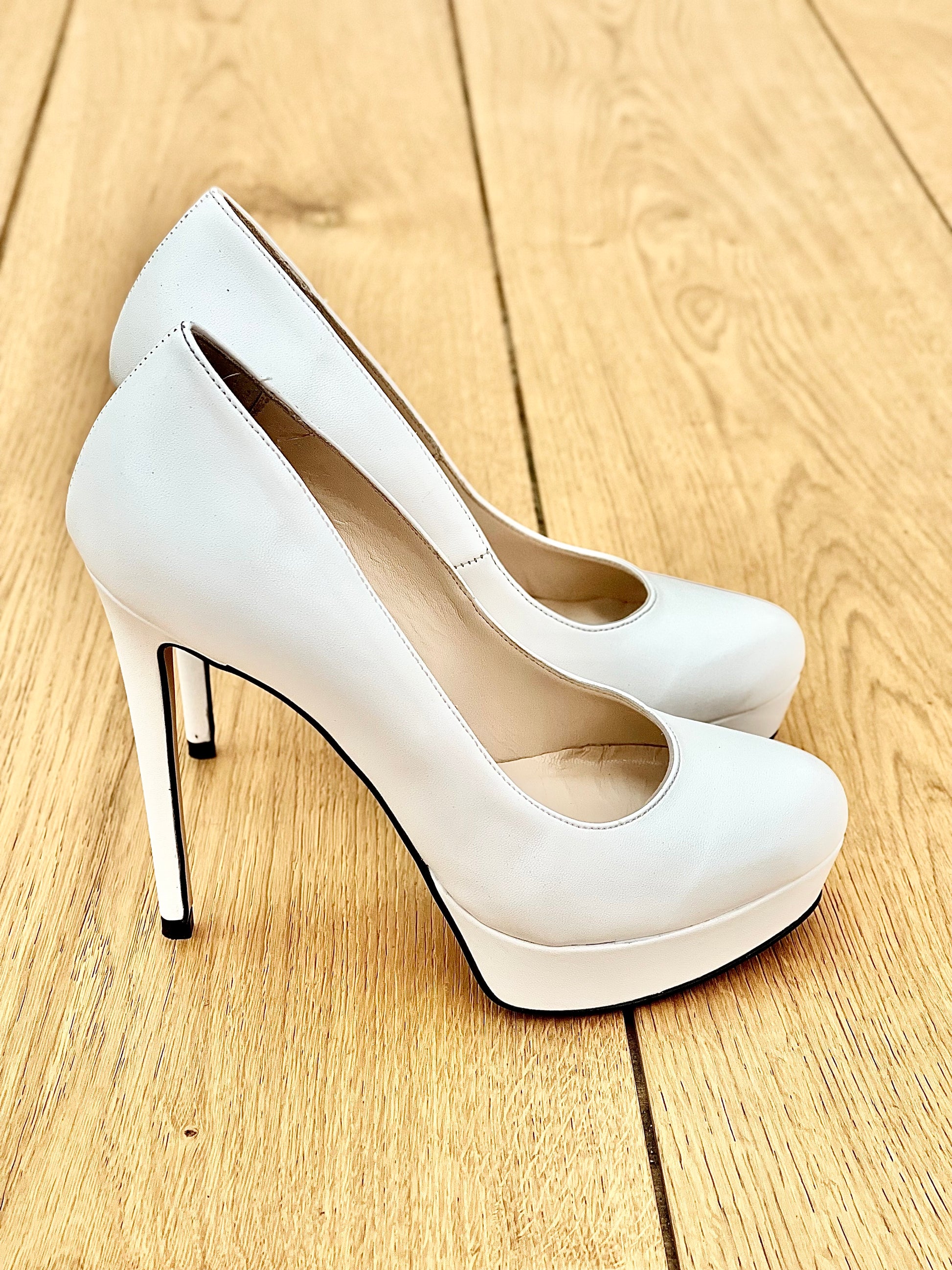 Escarpin à bout rond en cuir blanc avec talon aiguille de 12 cm et plateforme de 2 cm.