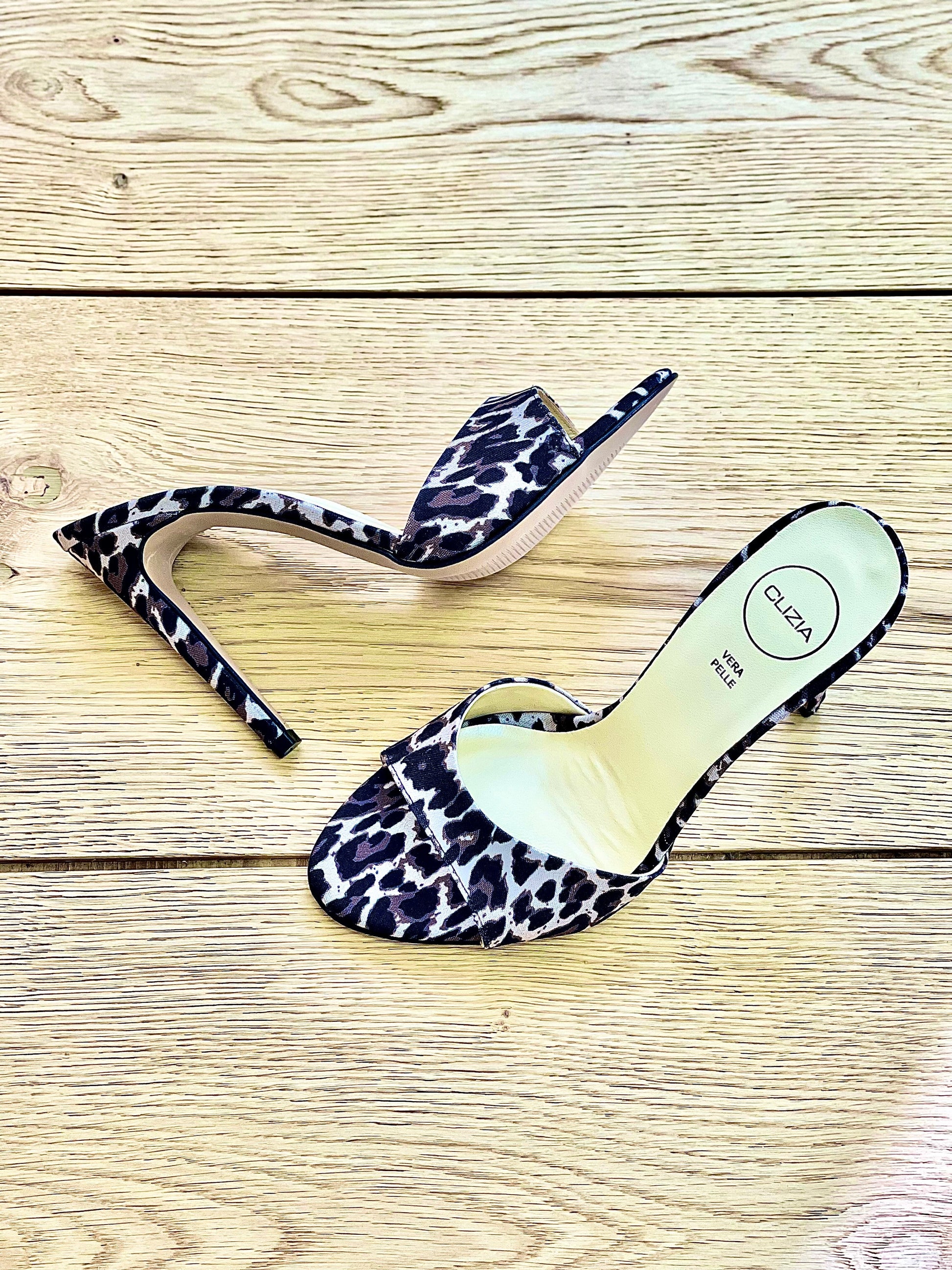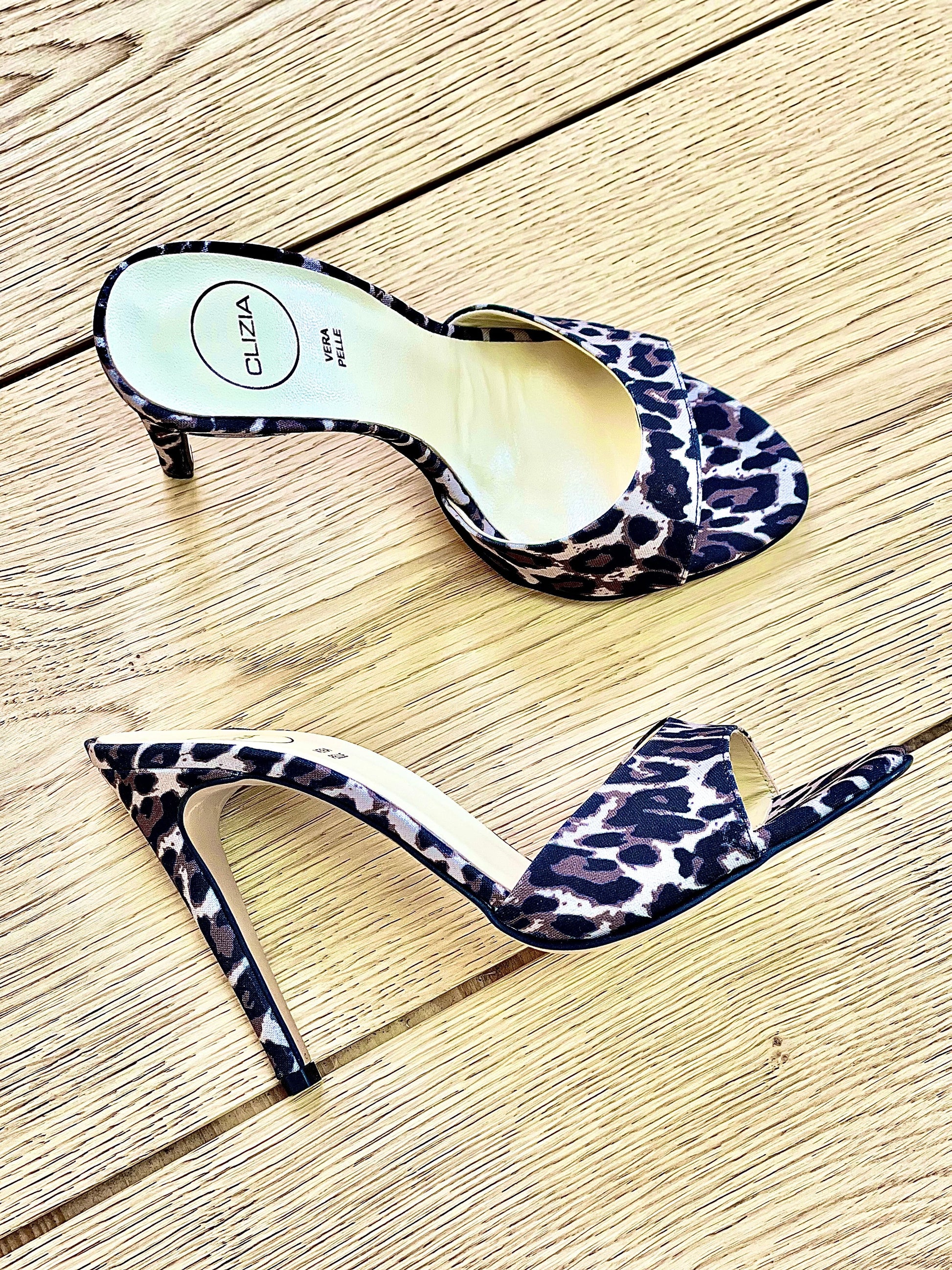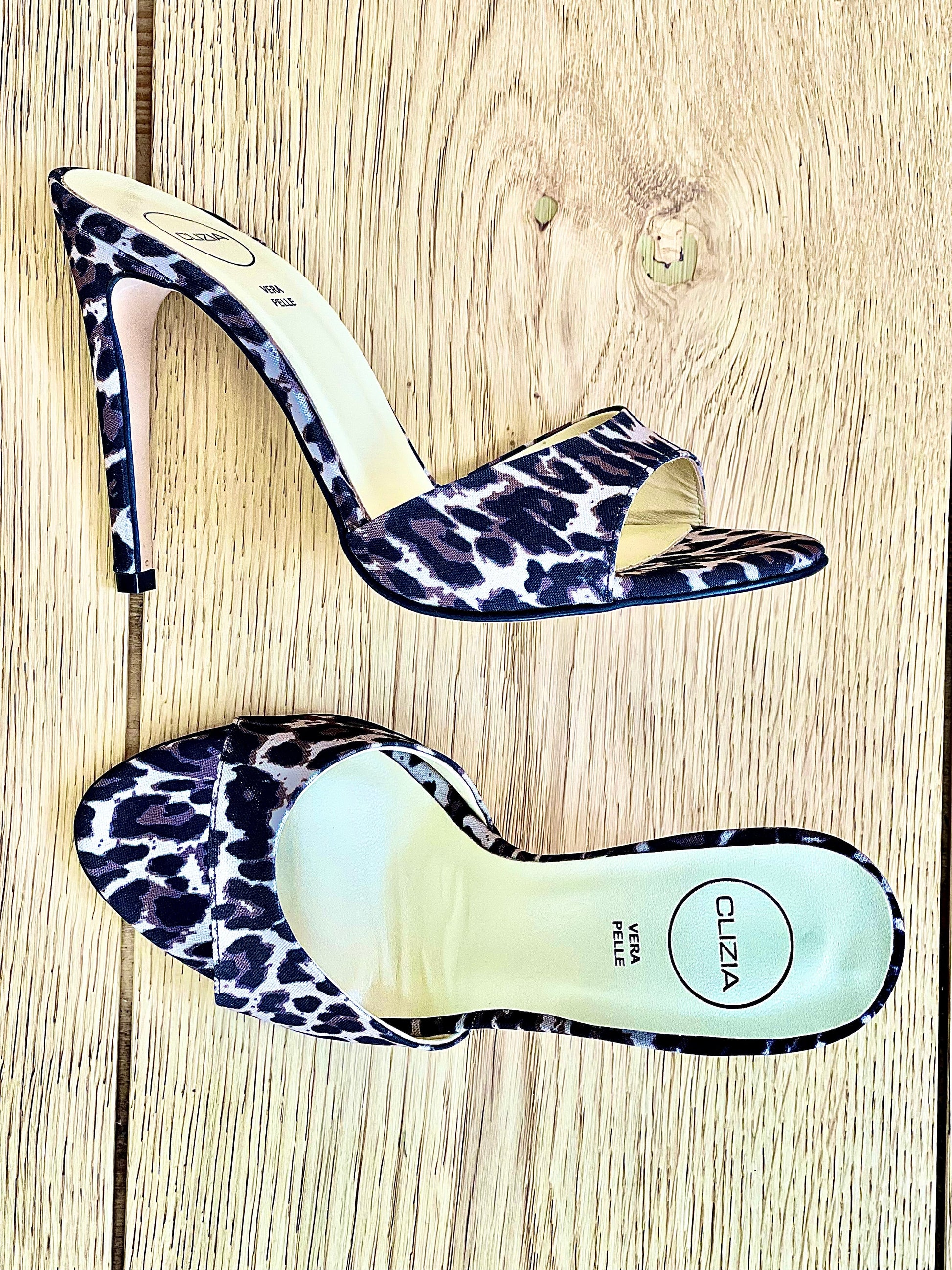 Sandales hautes mules, chausson animal, talon de 10cm.