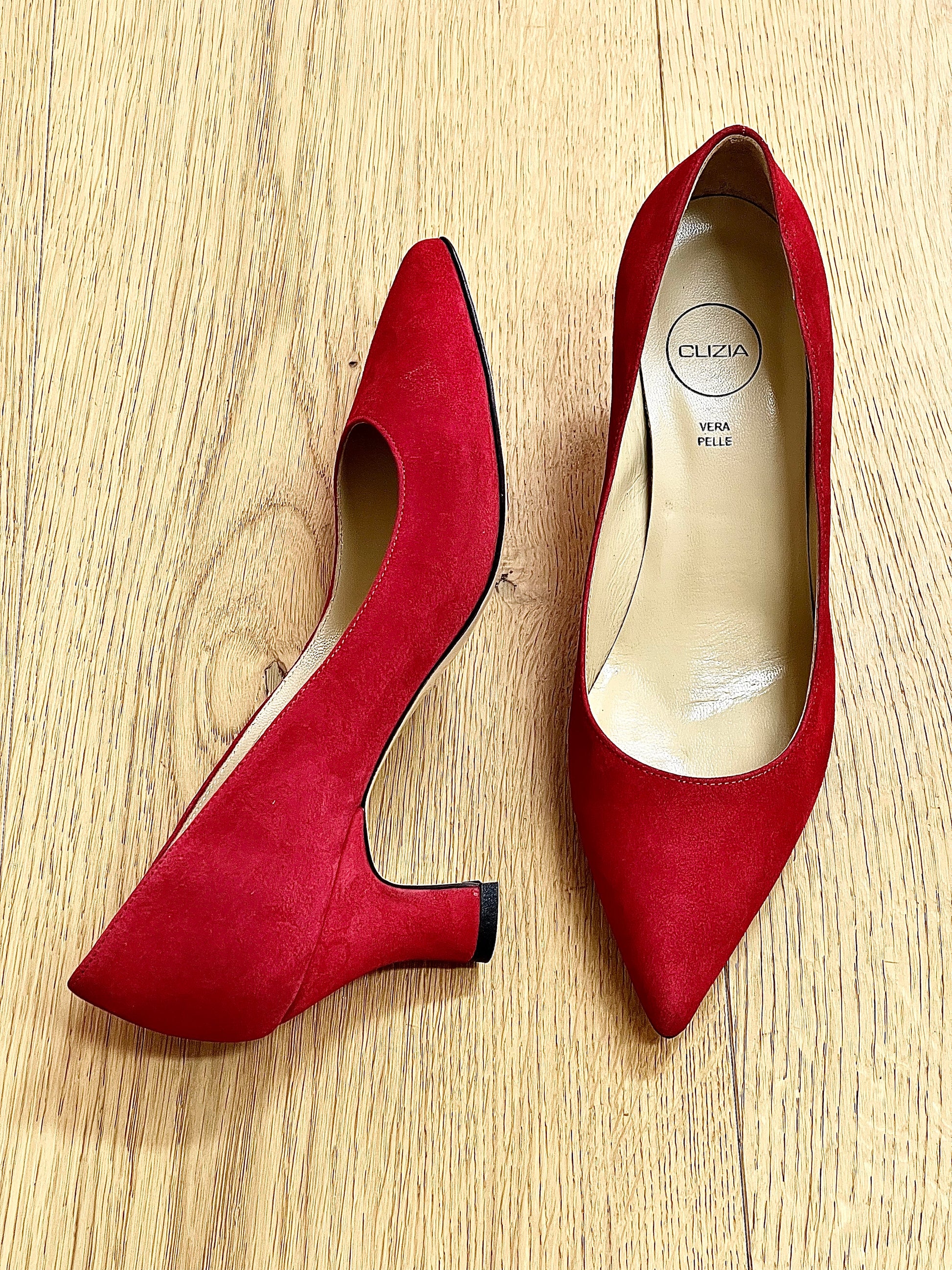 Escarpins en daim à bout pointu avec talon bobine de 6 cm.