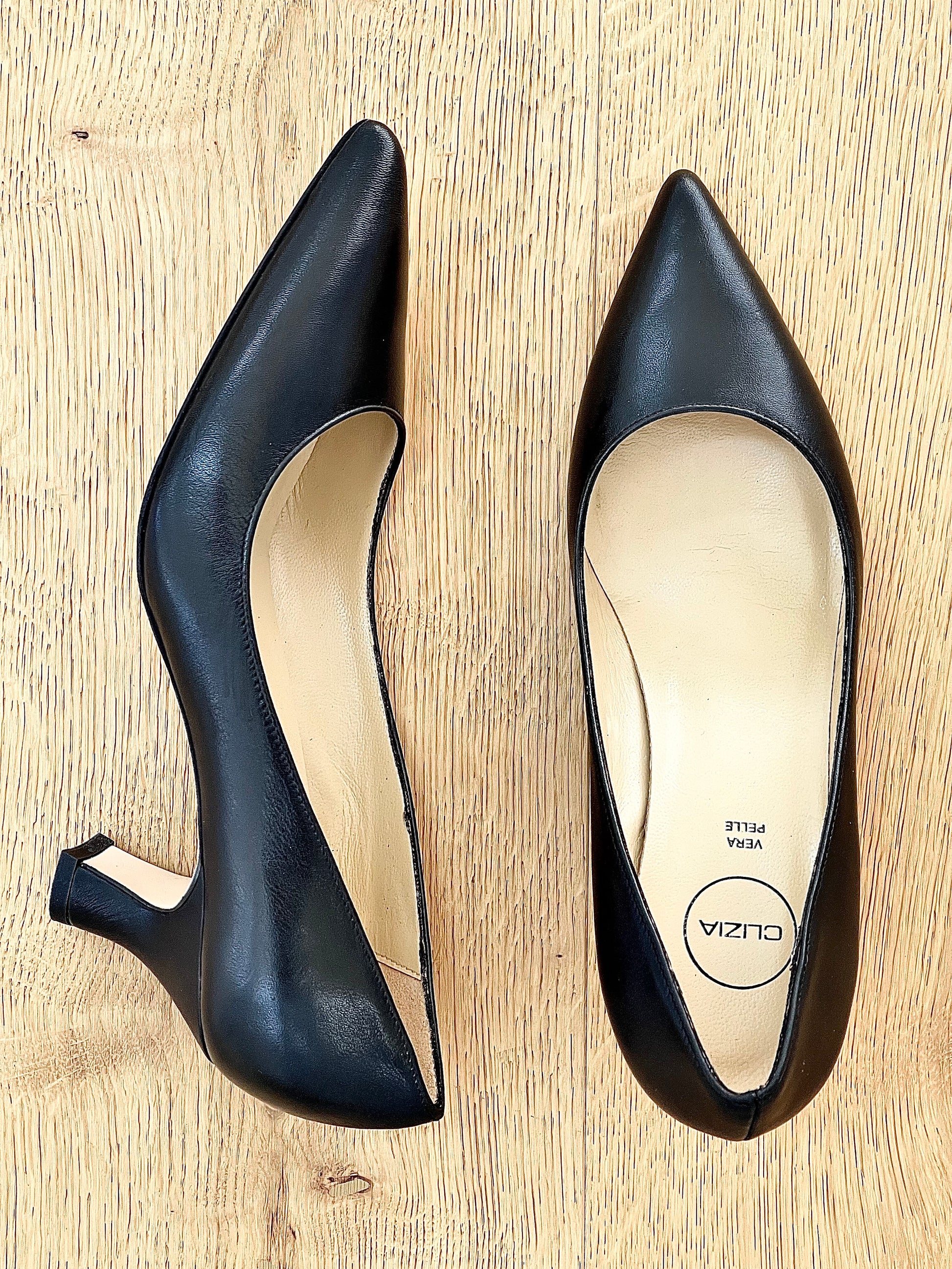 Escarpin à bout pointu en cuir talon bobine de 6 cm.