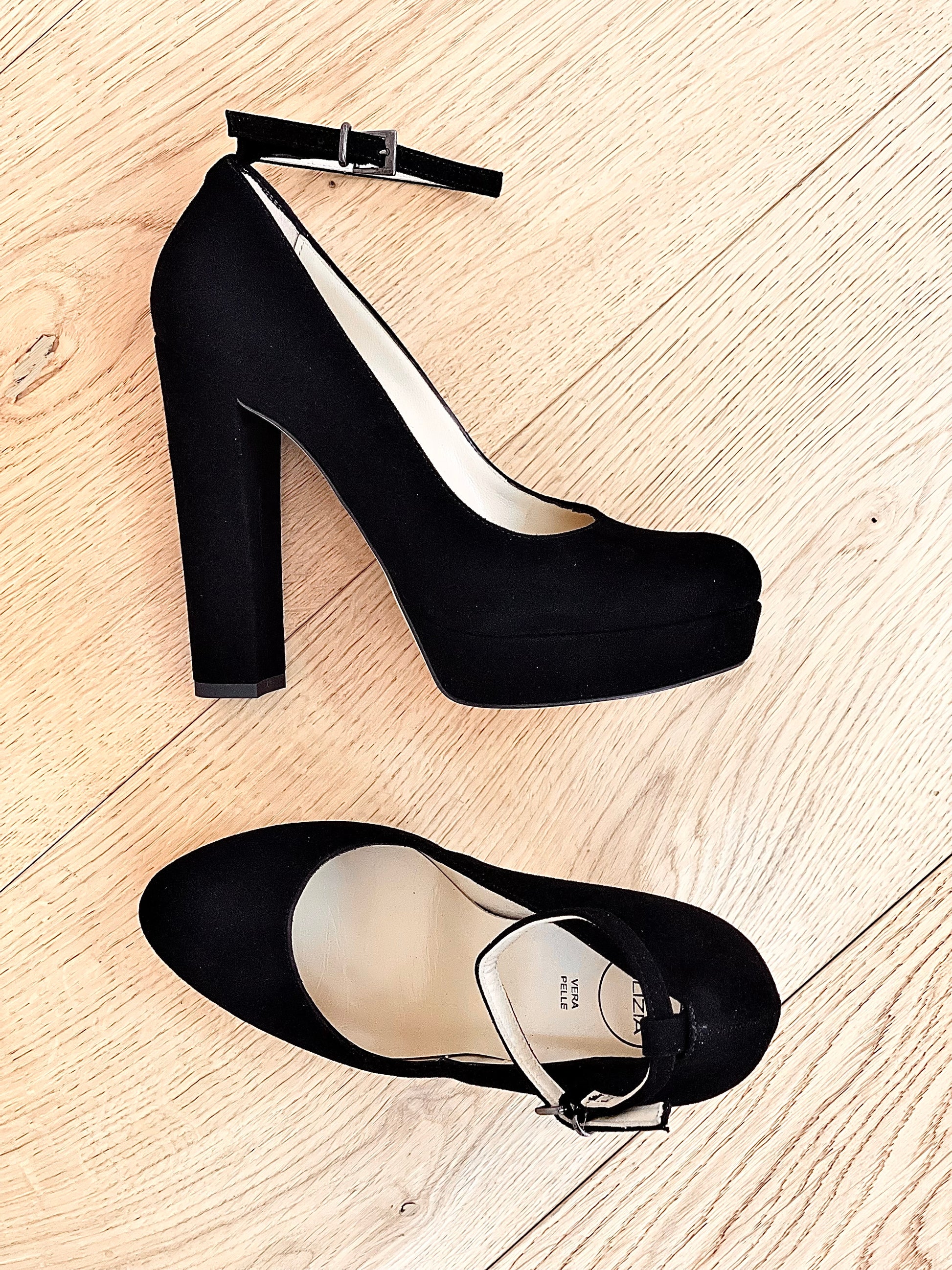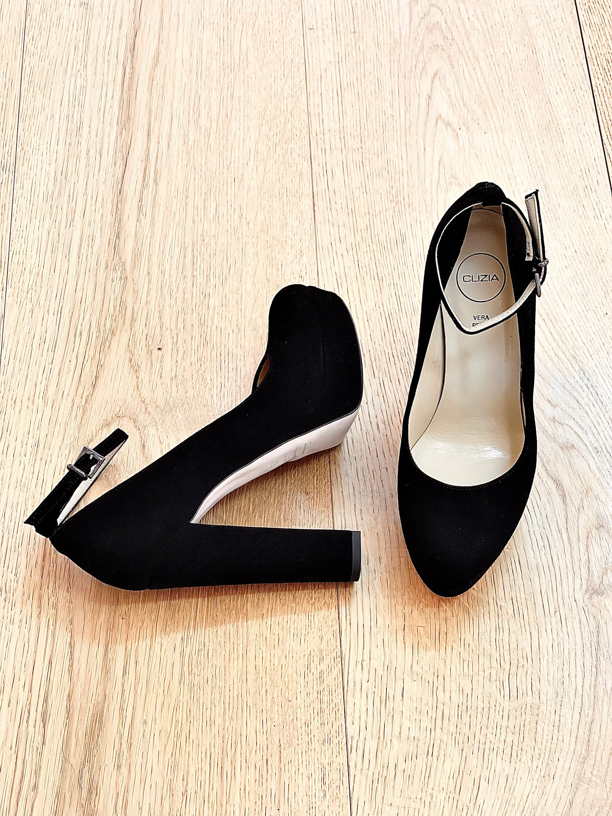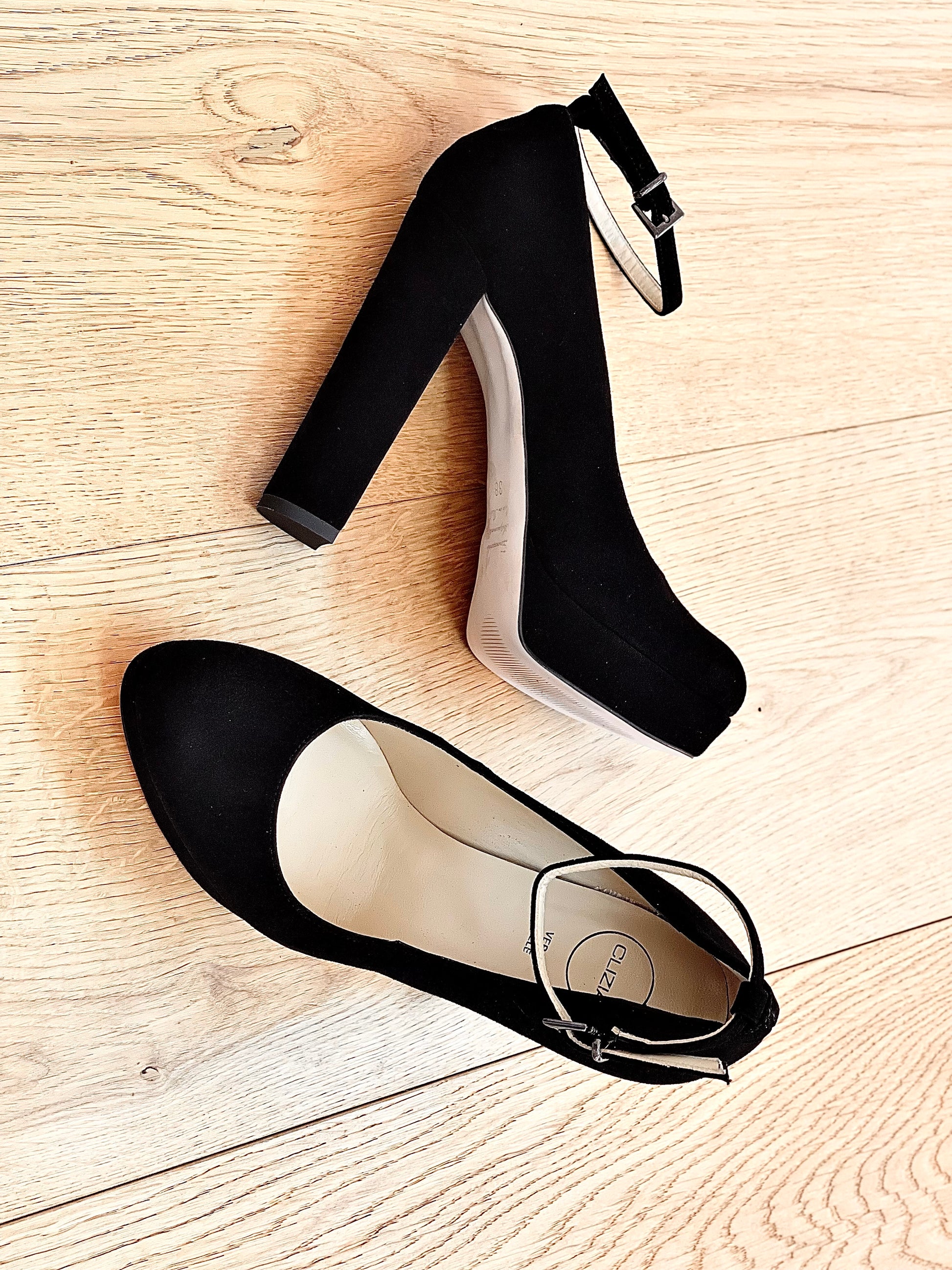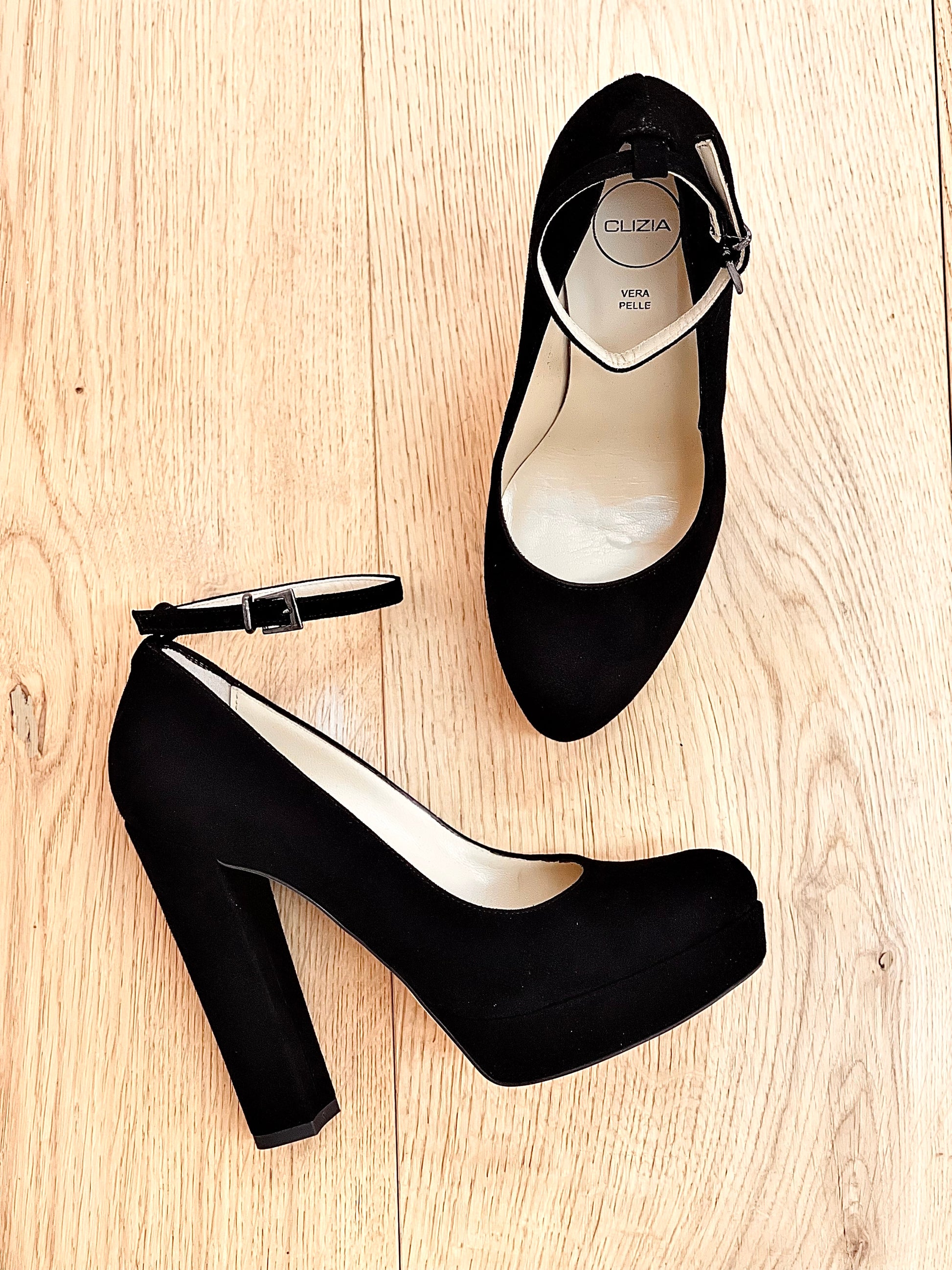 Escarpins en daim à plate-forme élevée avec une bride à la cheville.