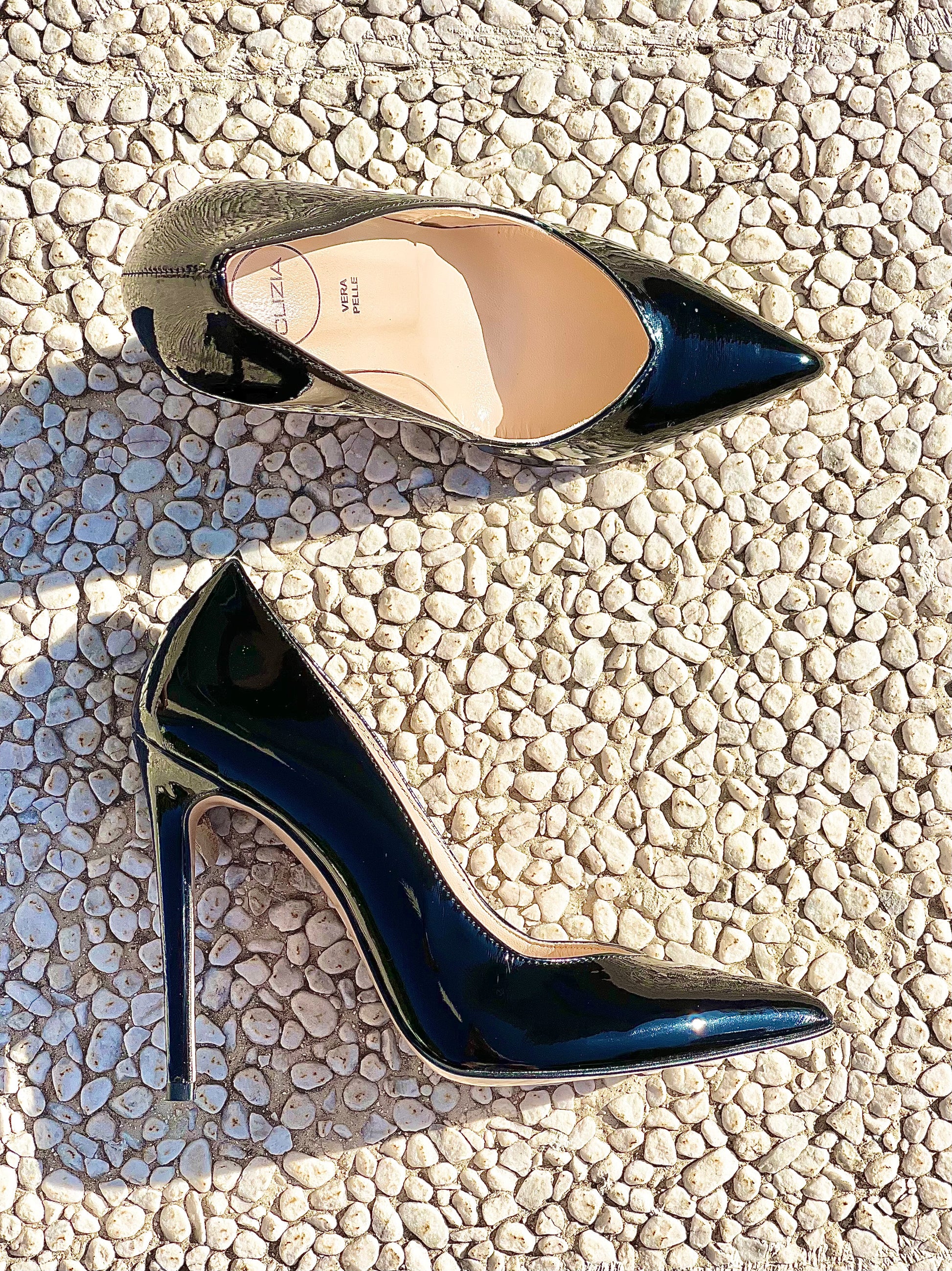 Escarpin à bout pointu et col en V en cuir verni avec talon aiguille.