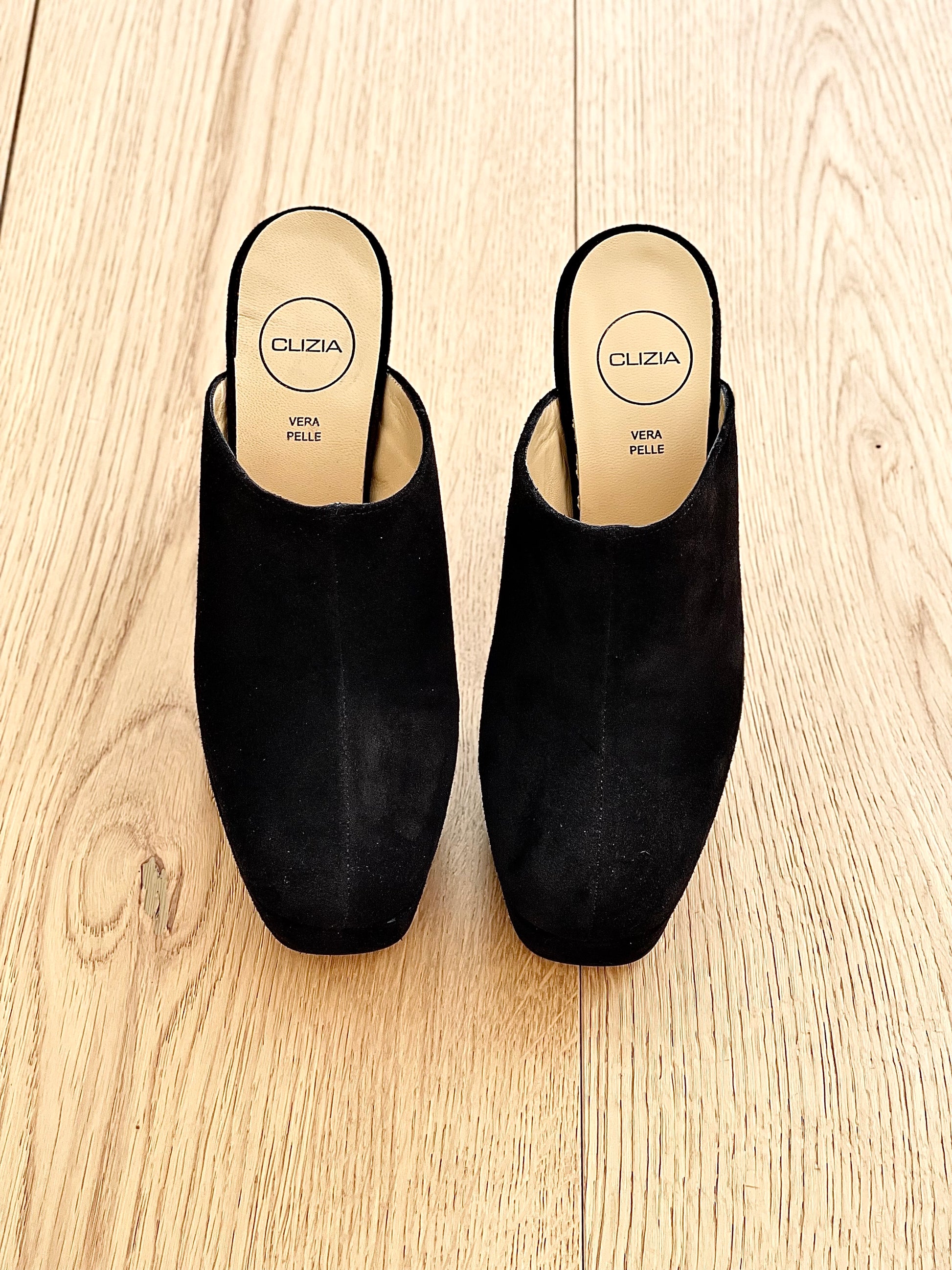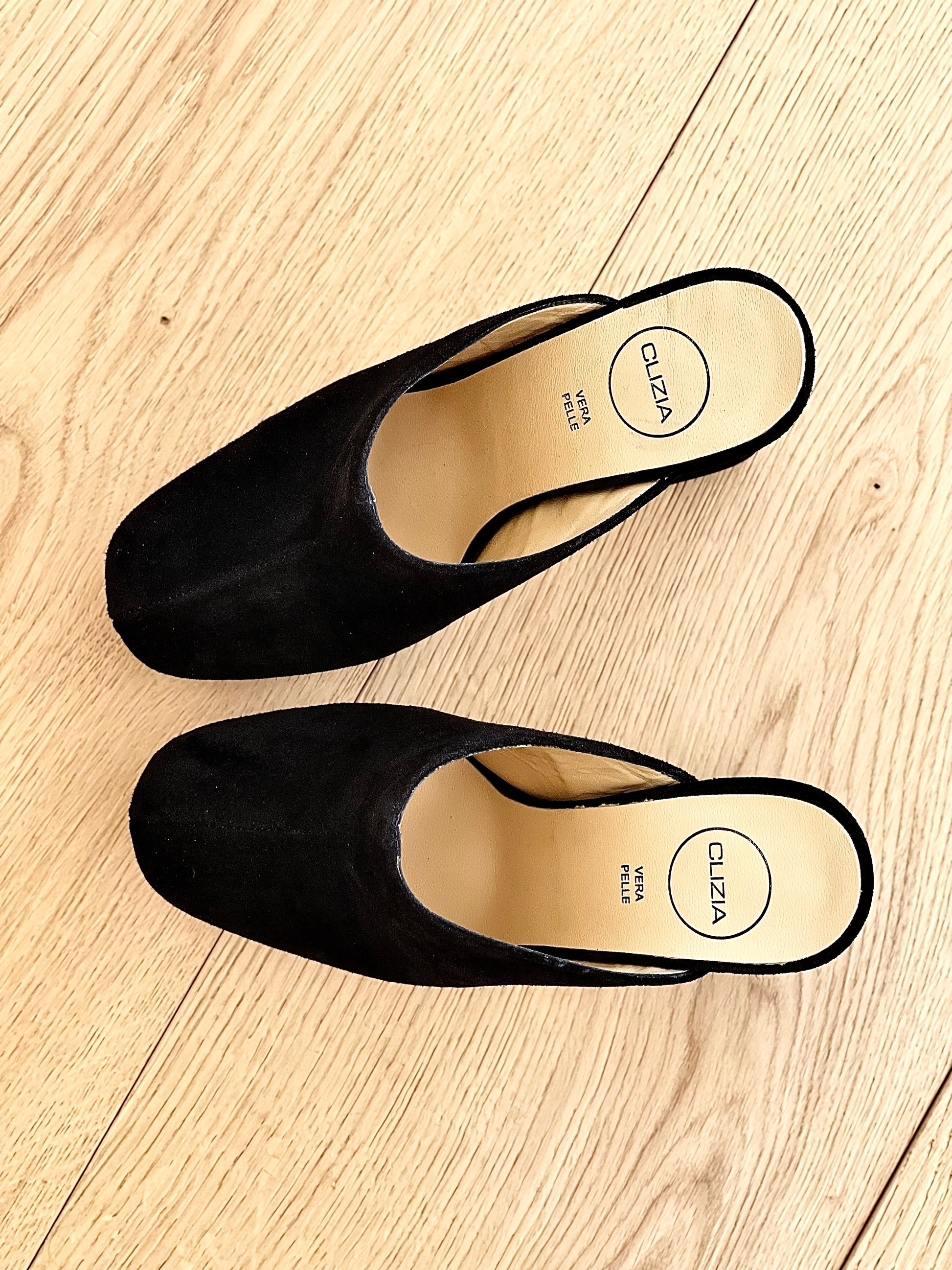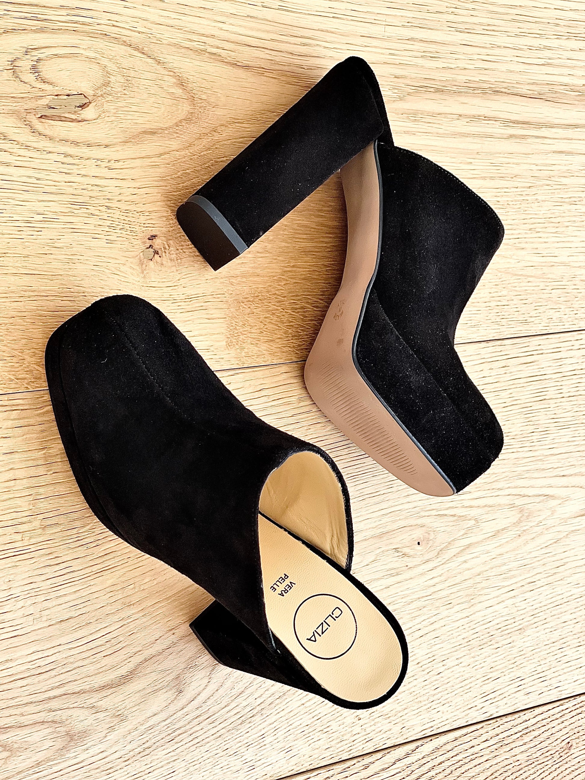 Sabot en daim à bout semi-carré avec un talon de 12 cm et une plateforme de 3 cm.