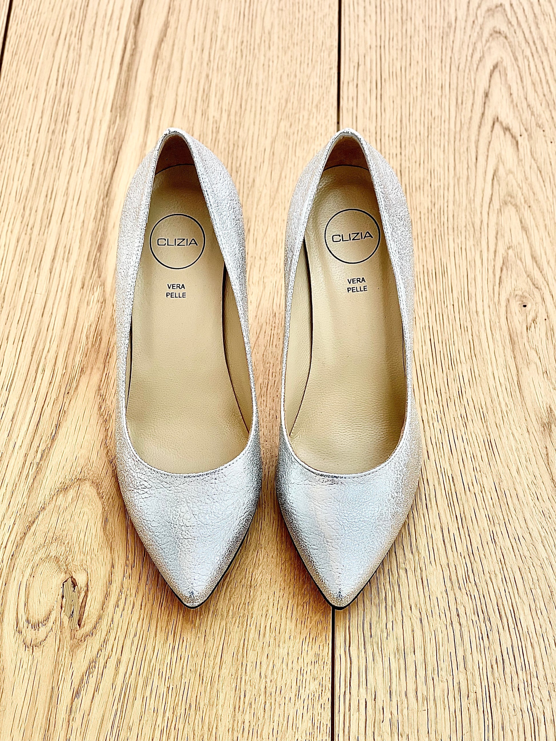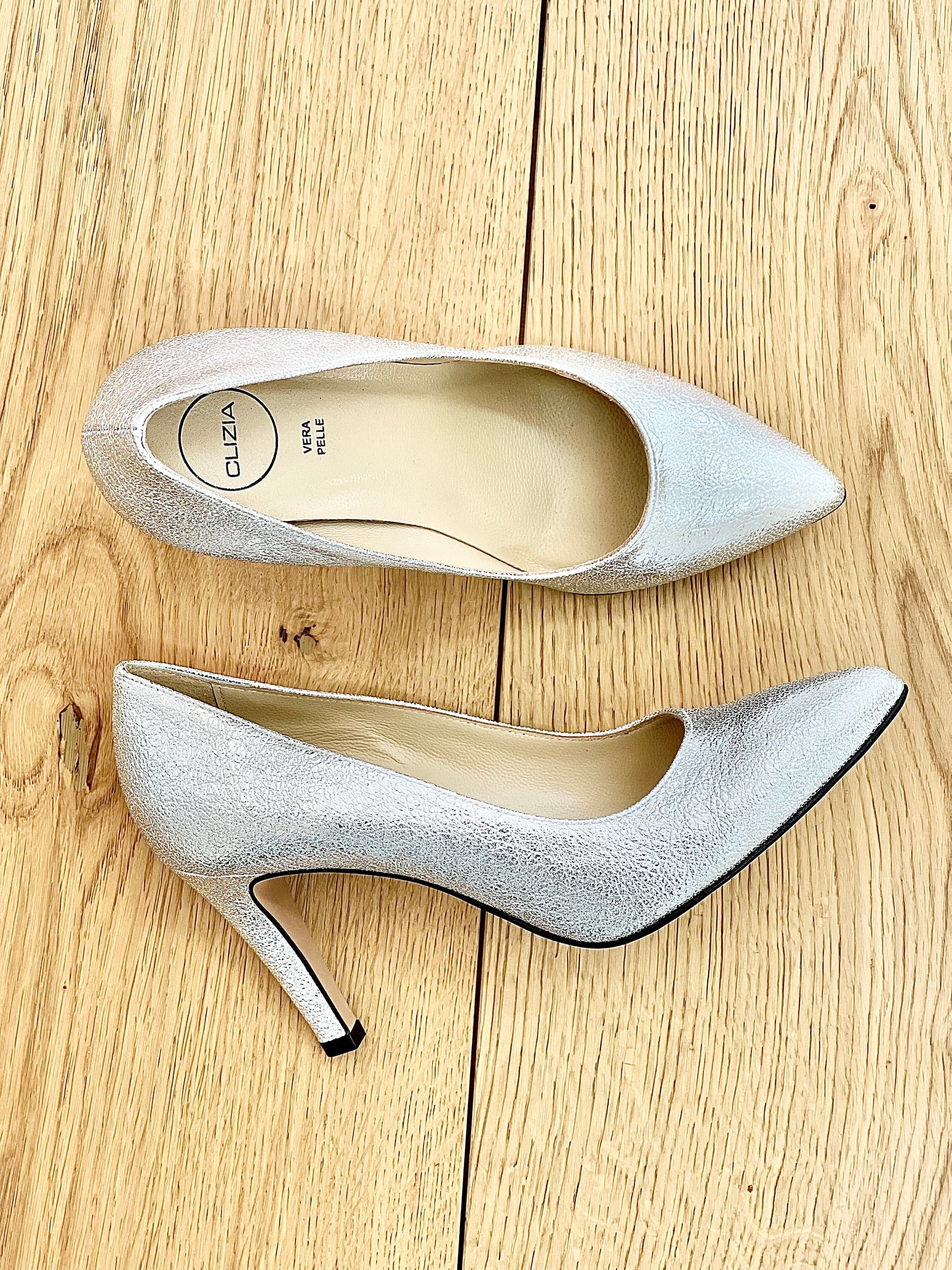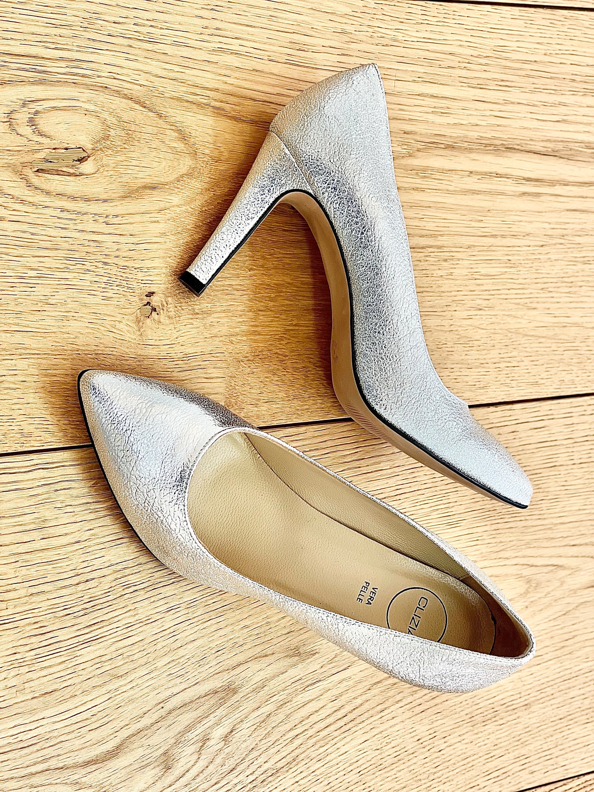 Escarpin à bout pointu en laminé avec un talon de 8 cm.