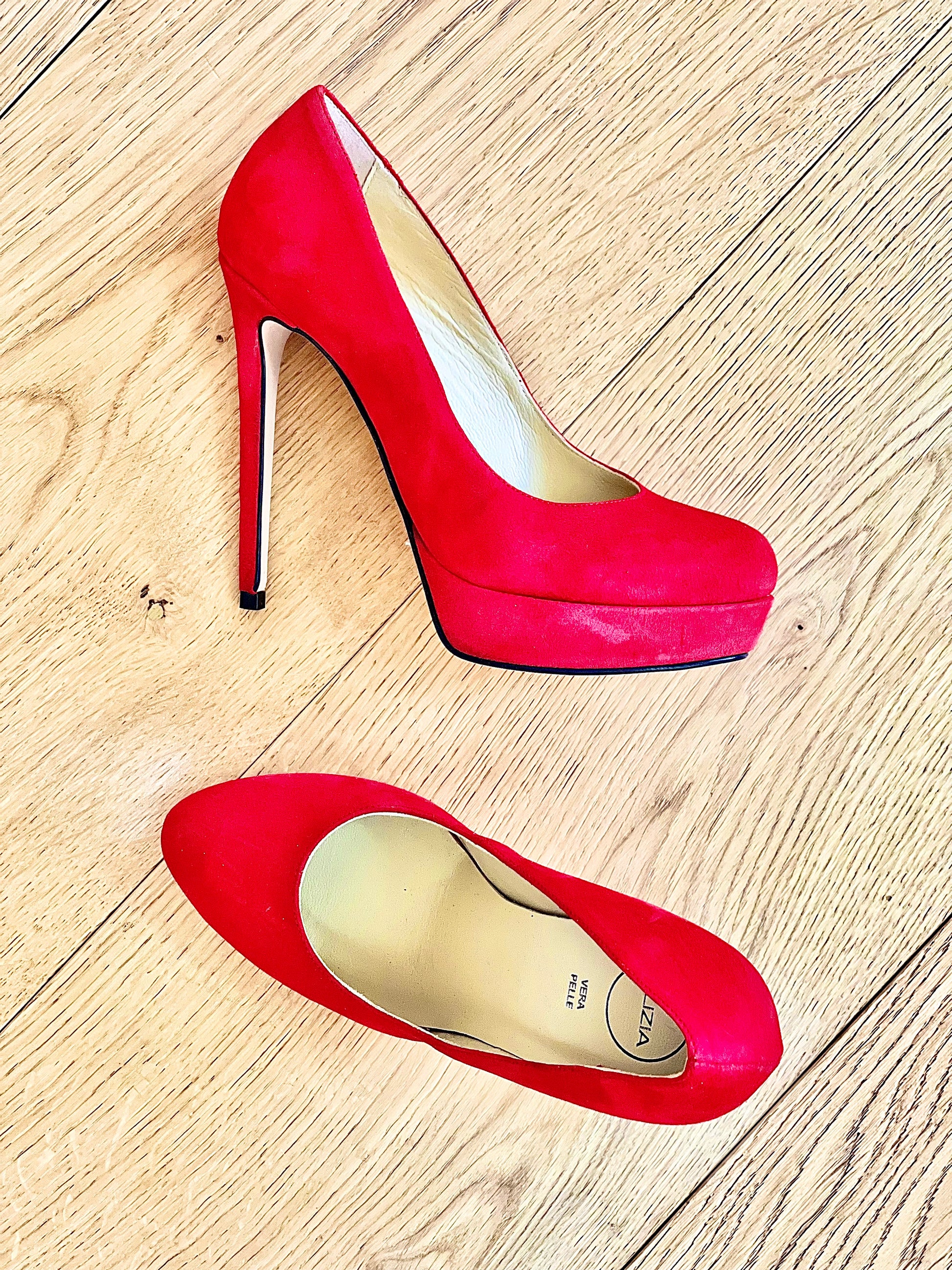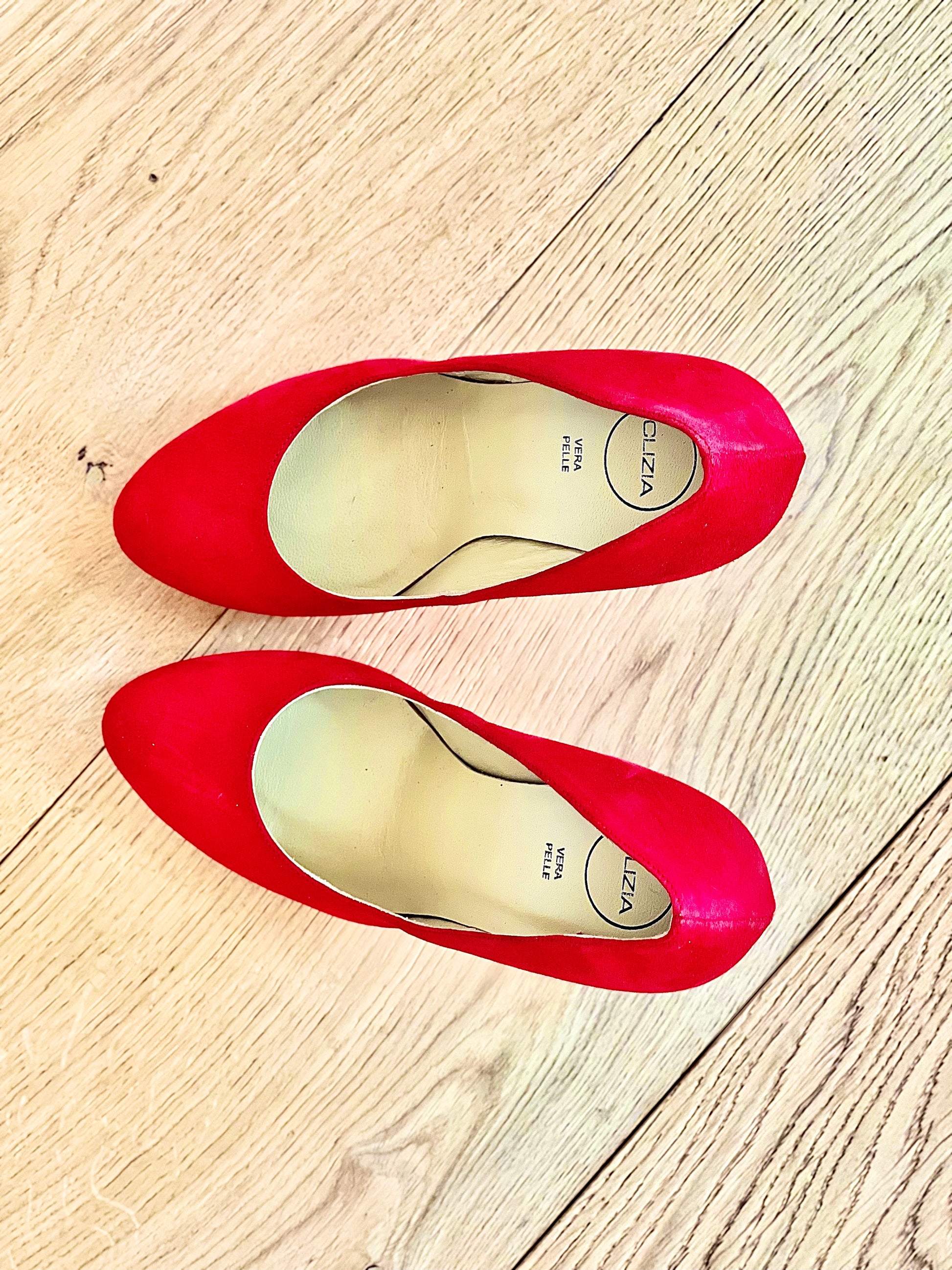 Escarpin en daim à bout rond avec un talon de 12 cm et une plateforme de 2 cm.