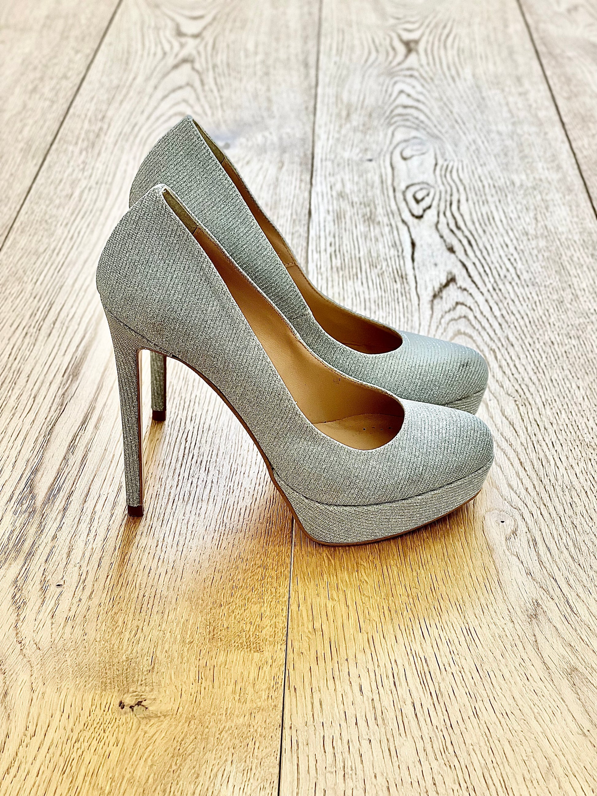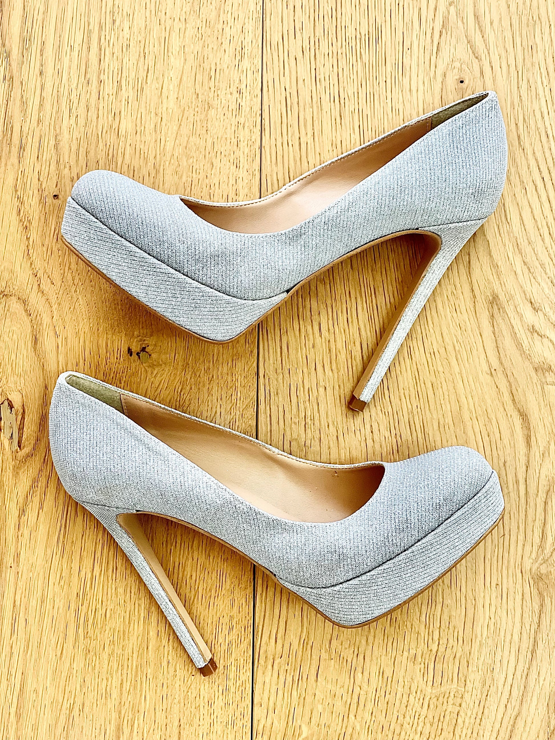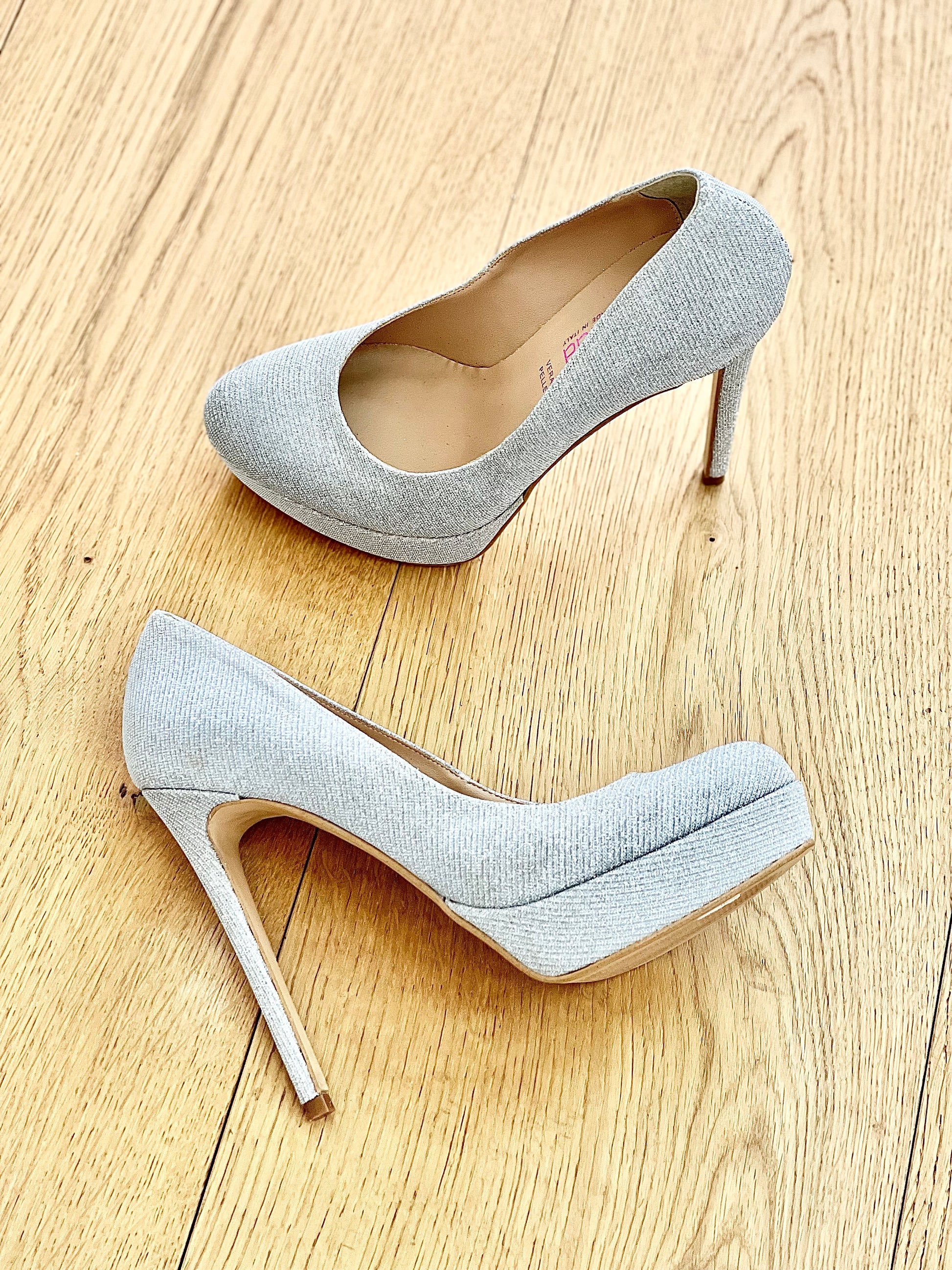 Élégants escarpins hauts à bouts ronds en paillettes, avec un talon de 12 cm et une plateforme de 2 cm.