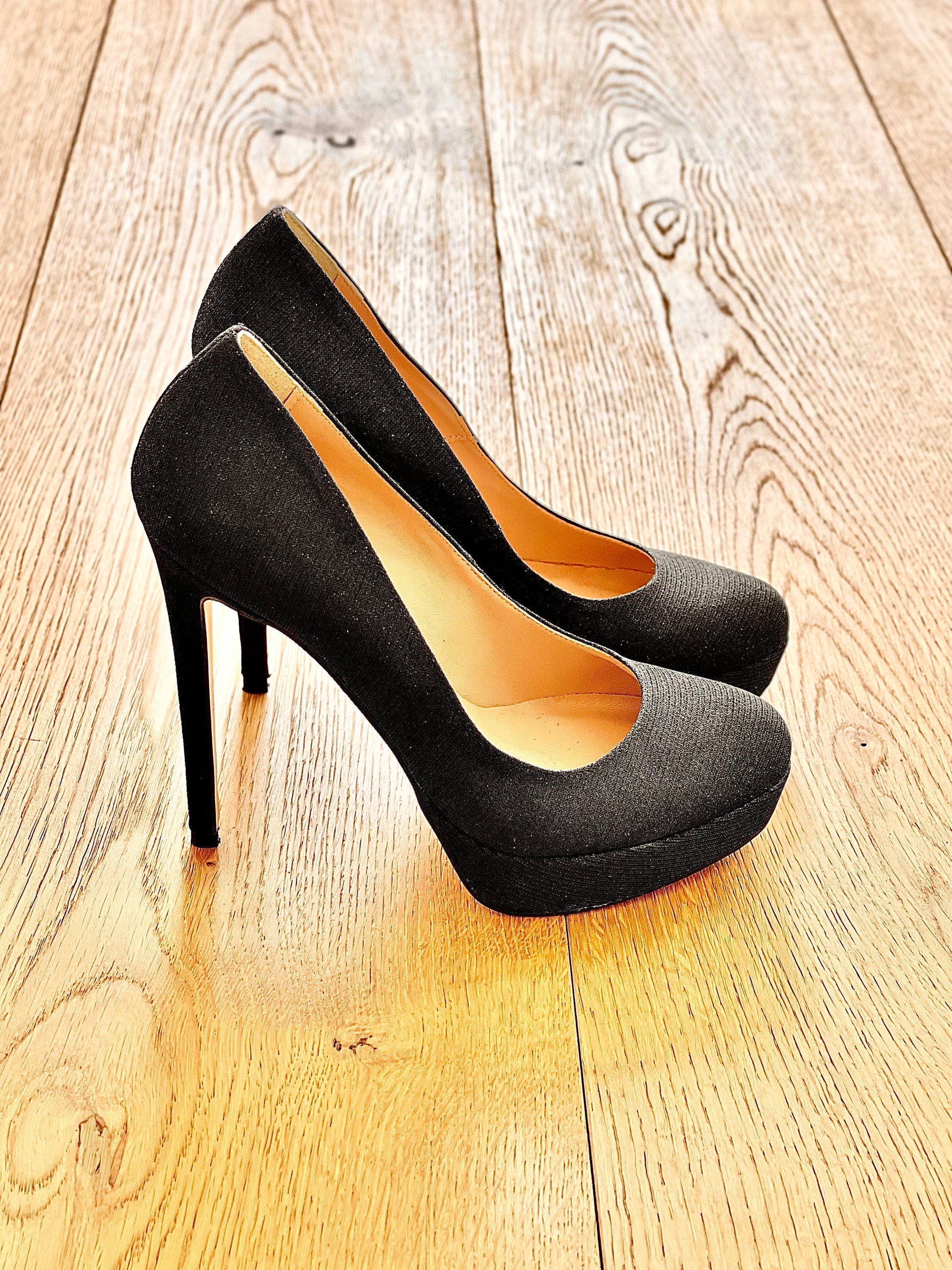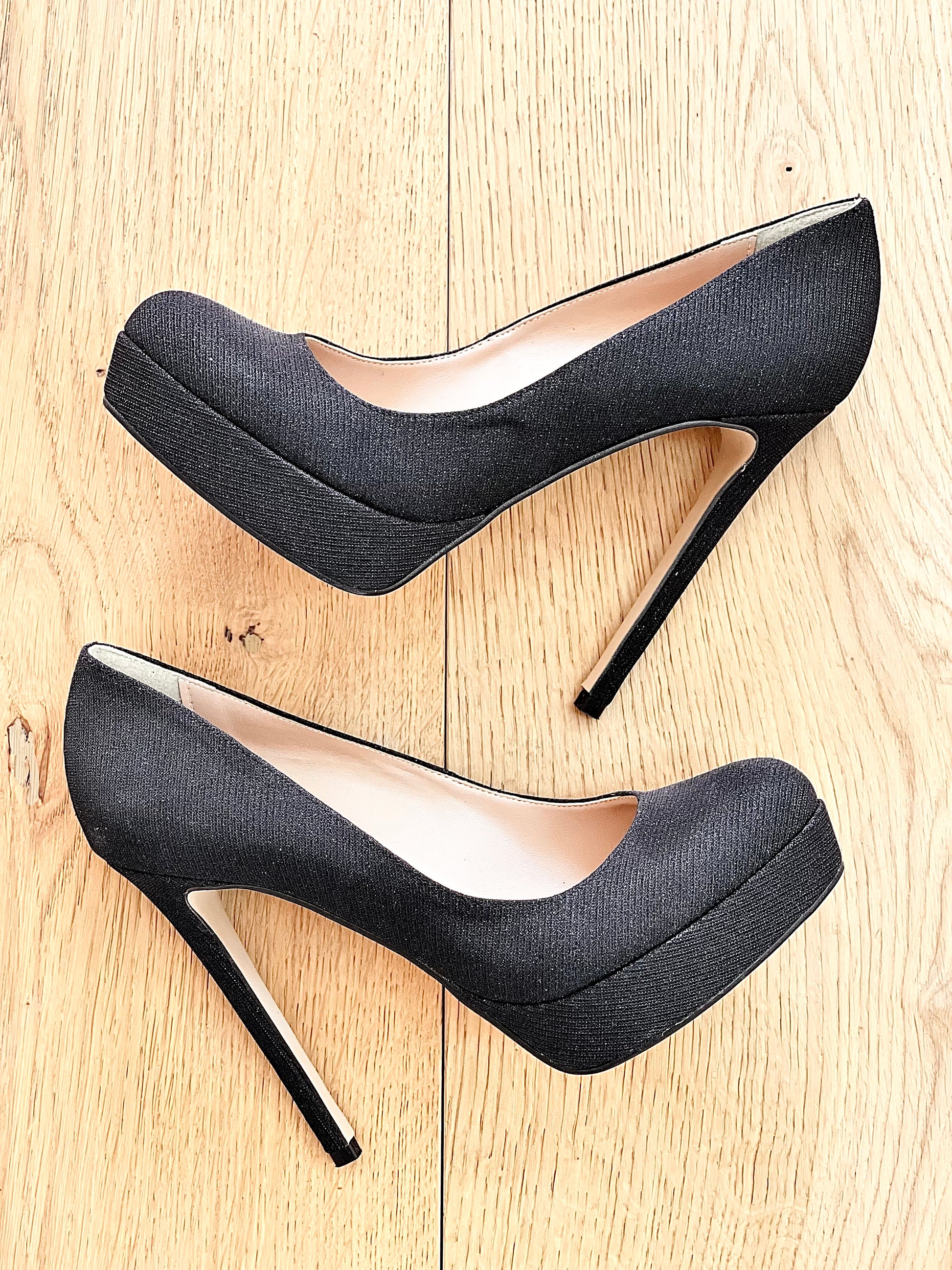 Élégants escarpins hauts à bouts ronds en paillettes, avec un talon de 12 cm et une plateforme de 2 cm.