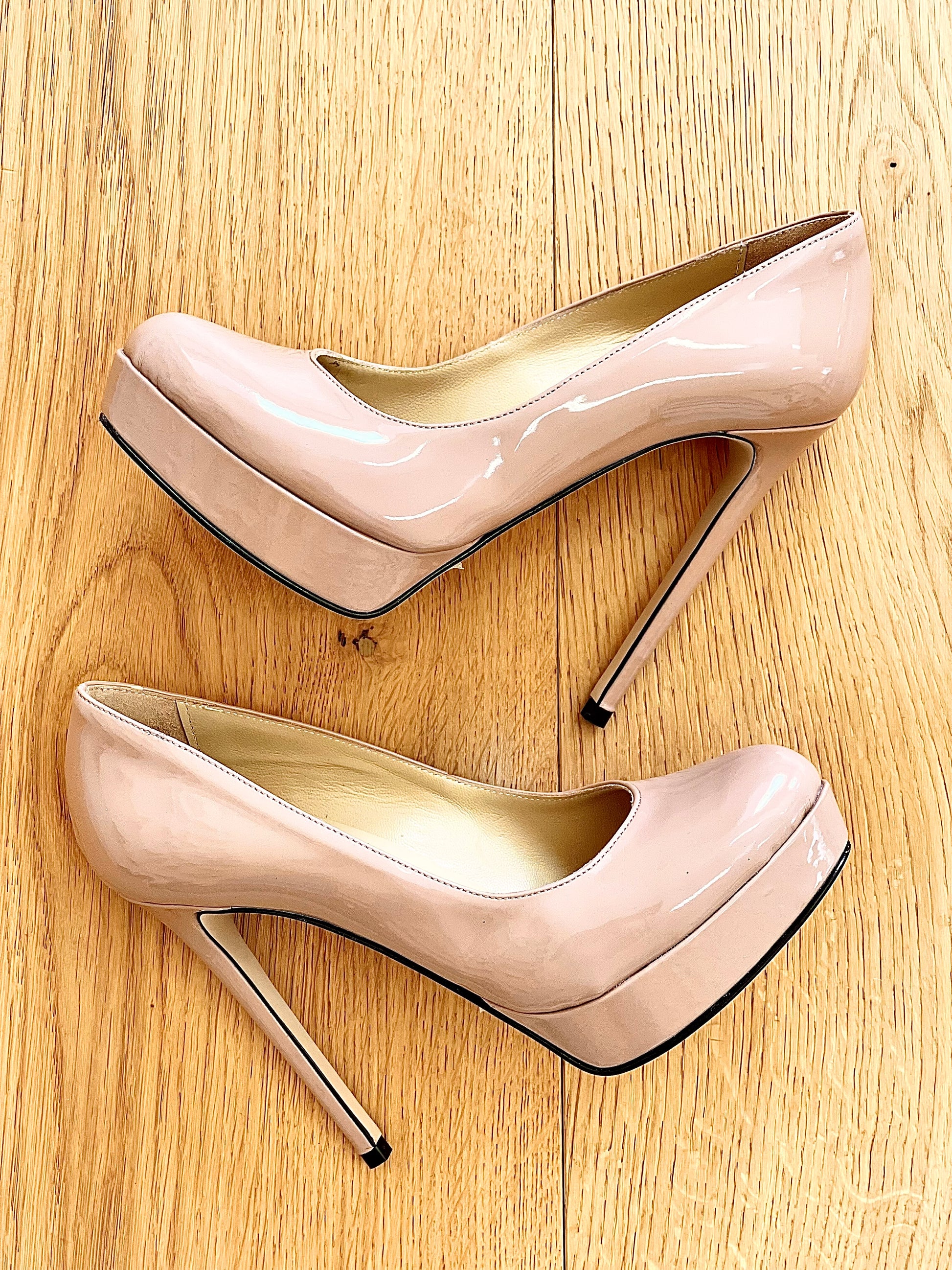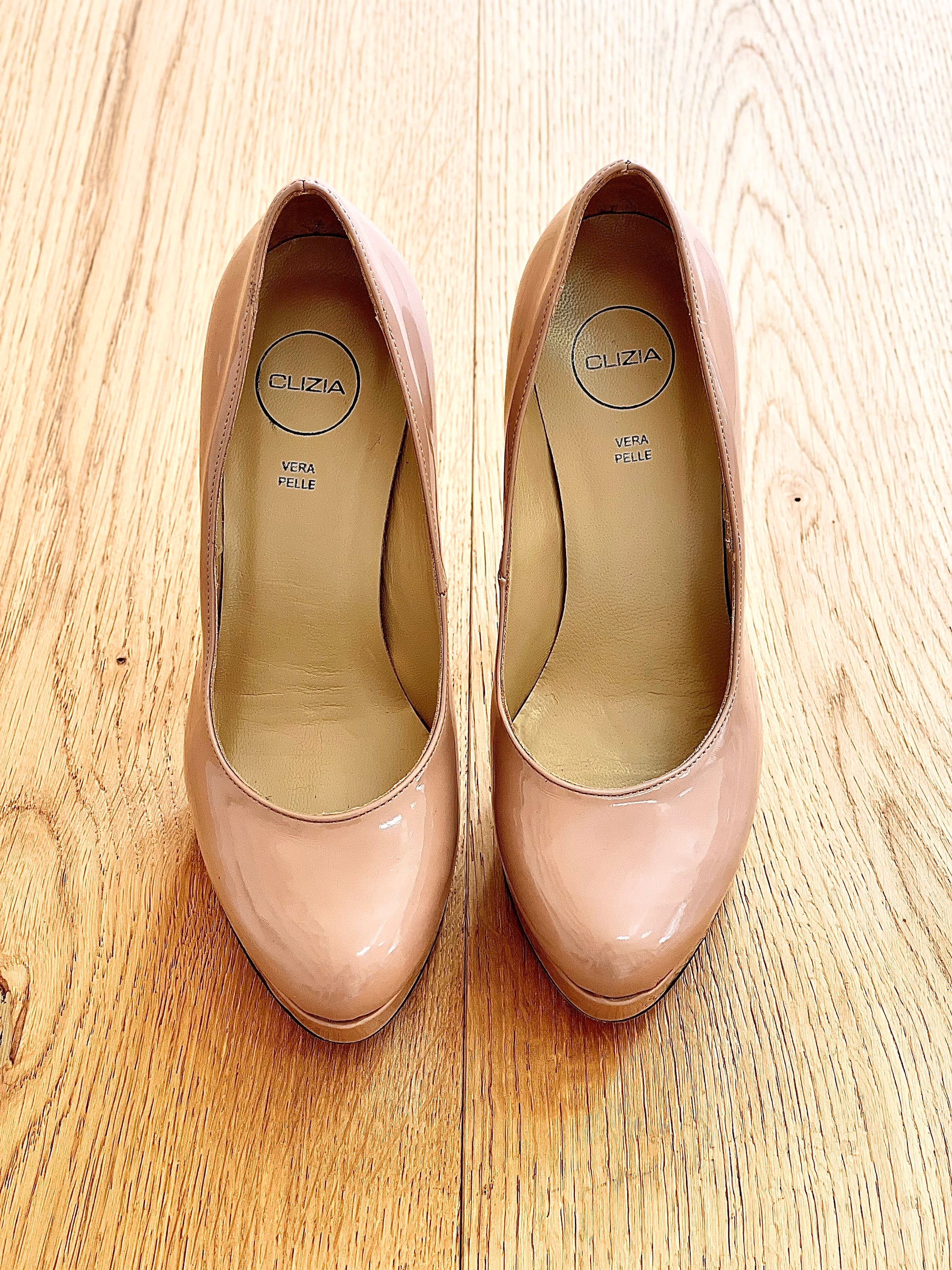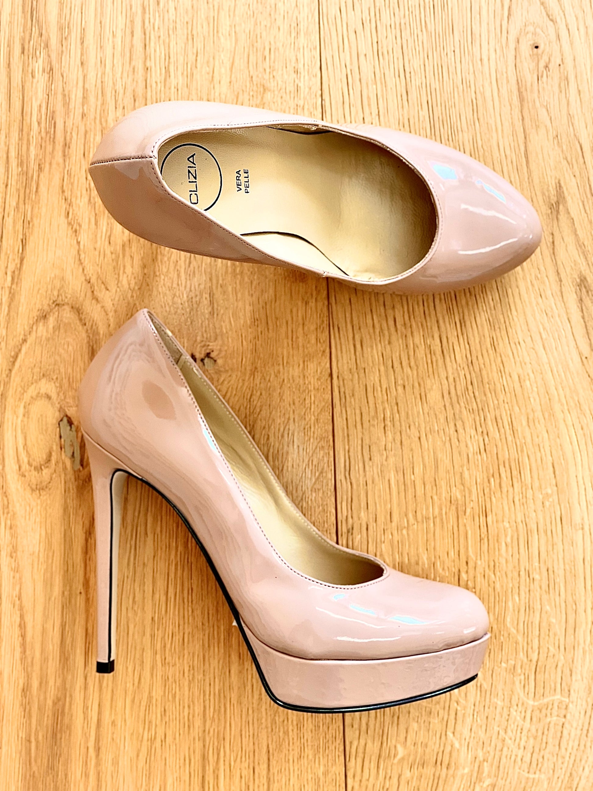 Escarpin à bout rond en cuir verni avec un talon de 12 cm et une plateforme de 2 cm.