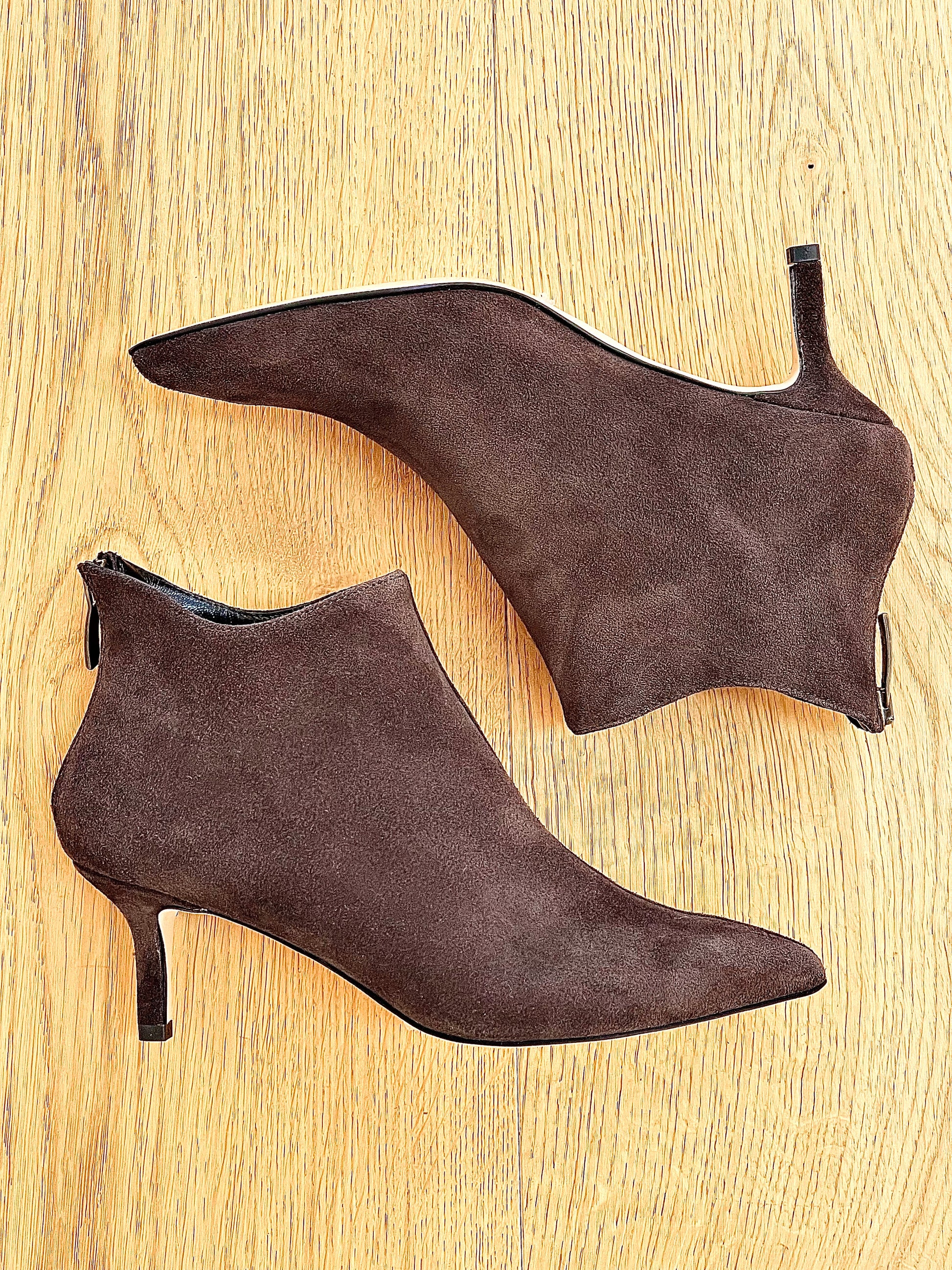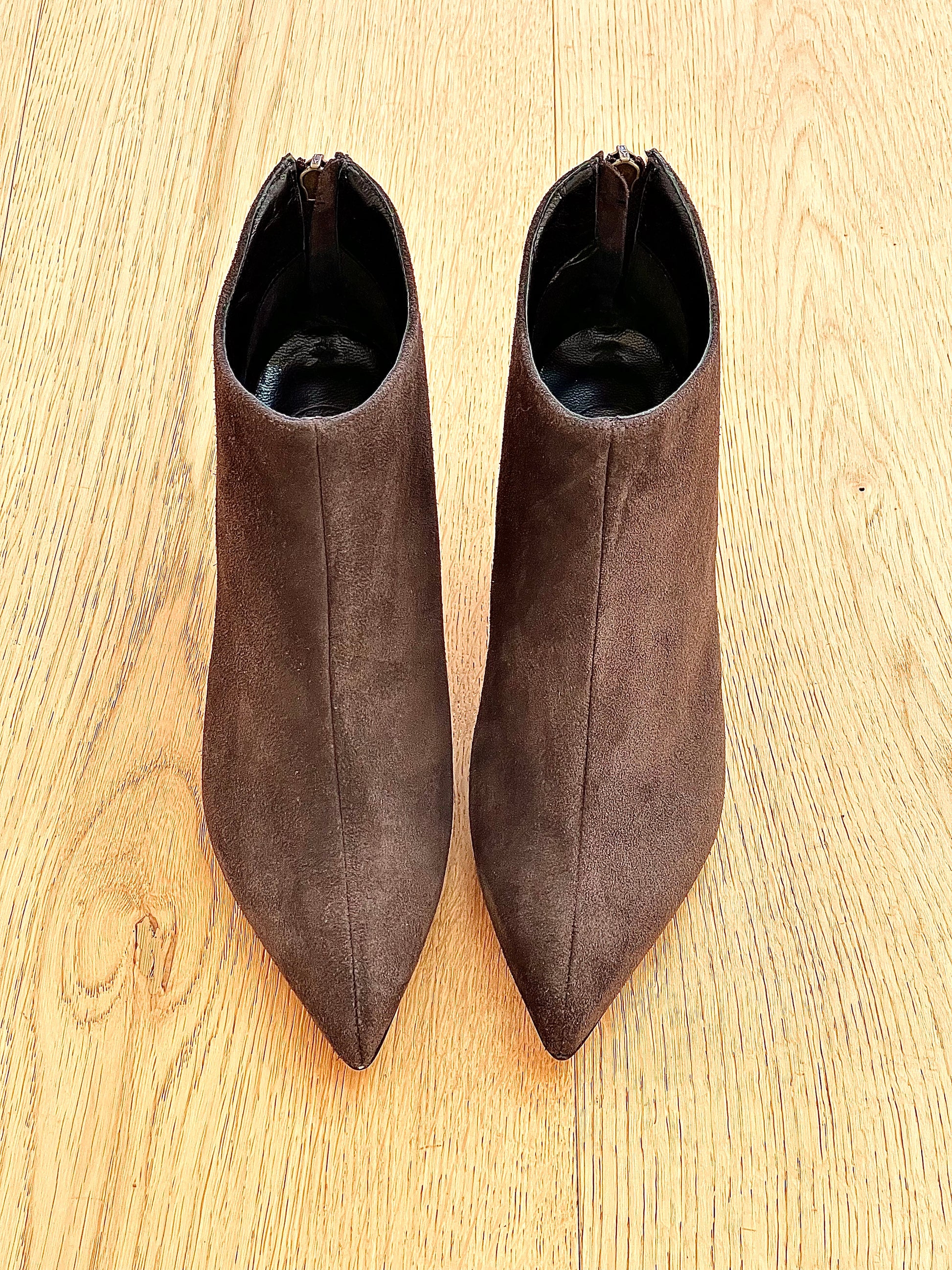 Bottines en daim à bout pointu avec fermeture éclair à l'arrière.