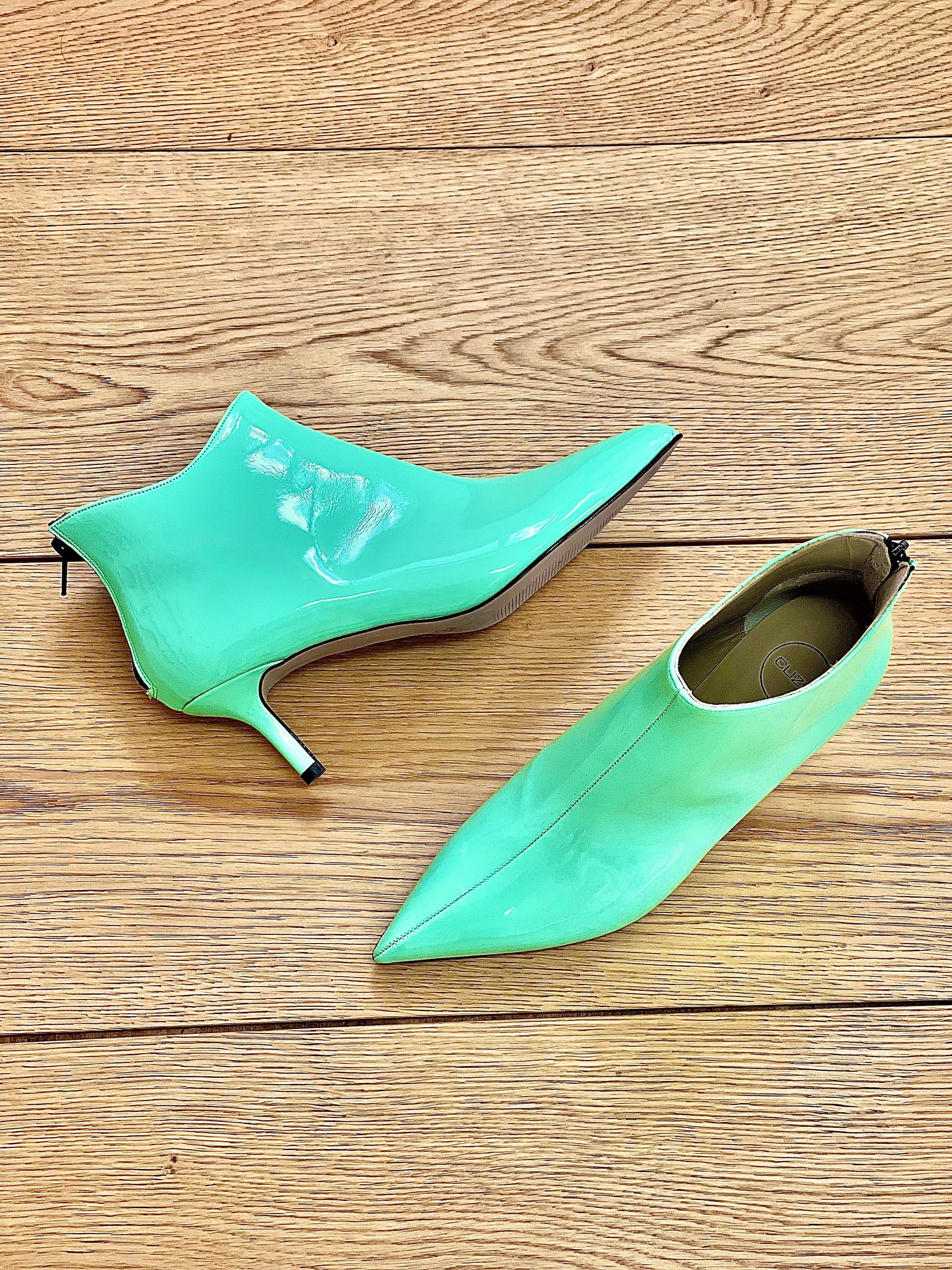 Bottines en cuir verni avec talon de 6 cm et fermeture éclair à l'arrière.
