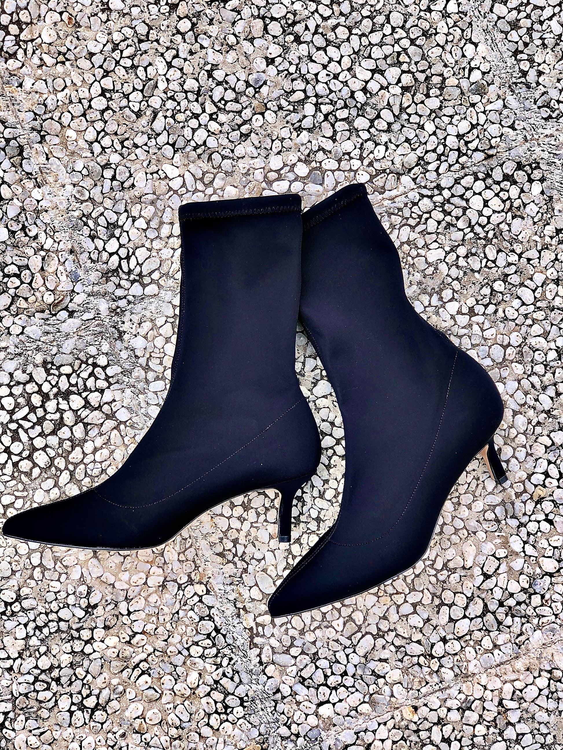 Botte à cheville élastique avec bout pointu et talon de 6 cm.