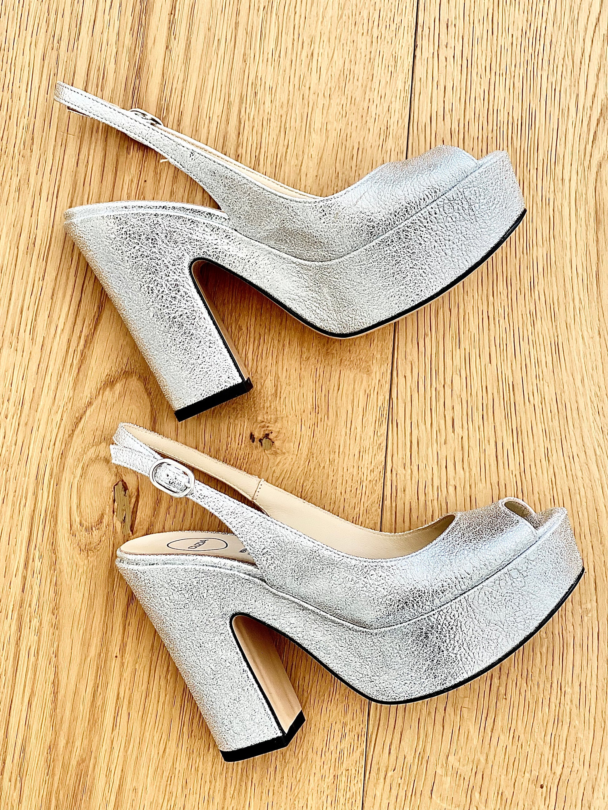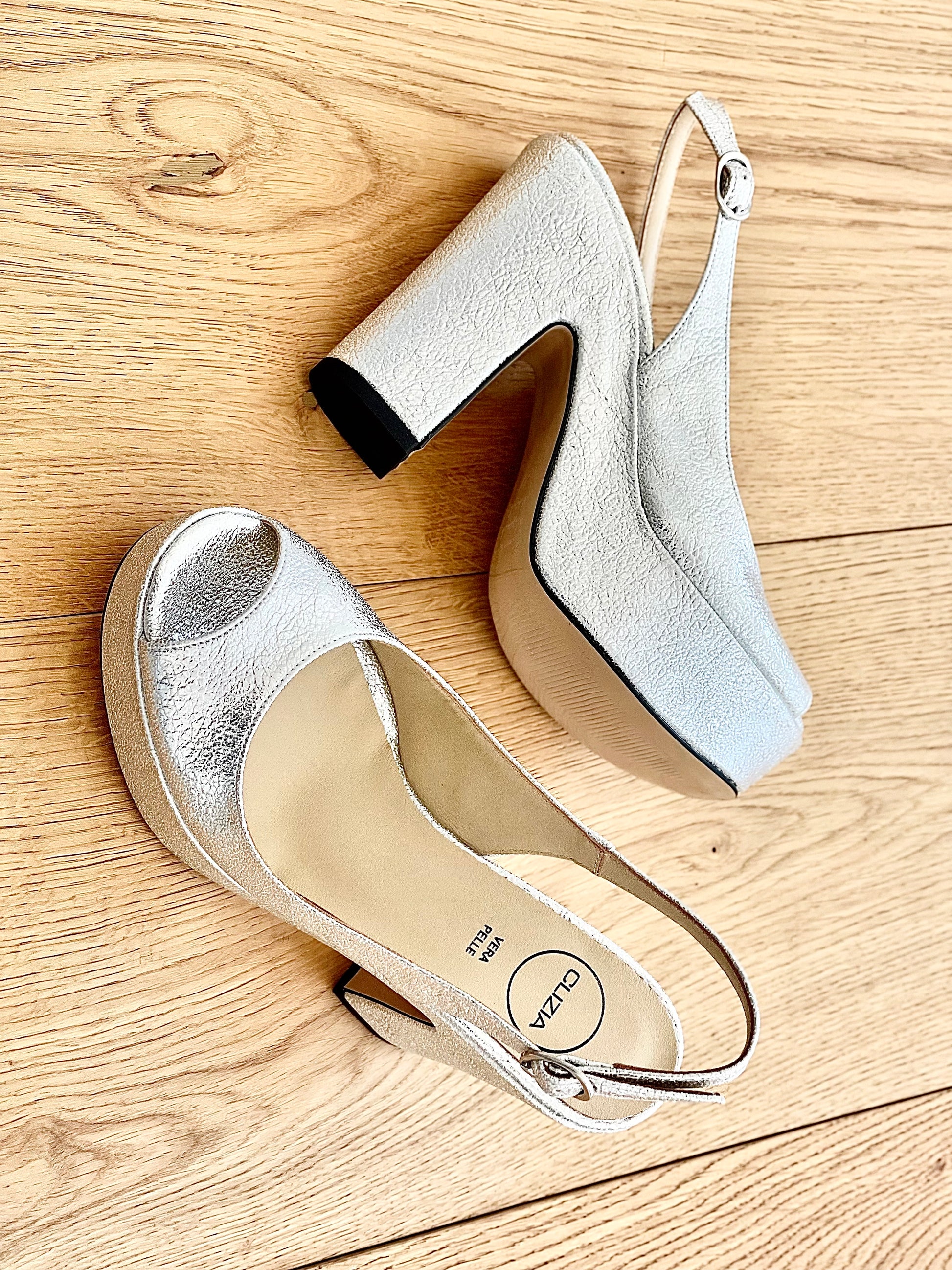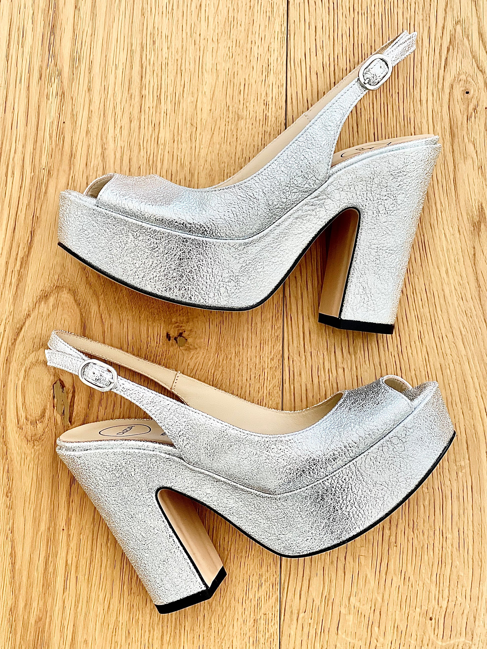 Escarpins laminés à bout ouvert sur un talon compensé de 11,5 cm et une plateforme de 4 cm.
