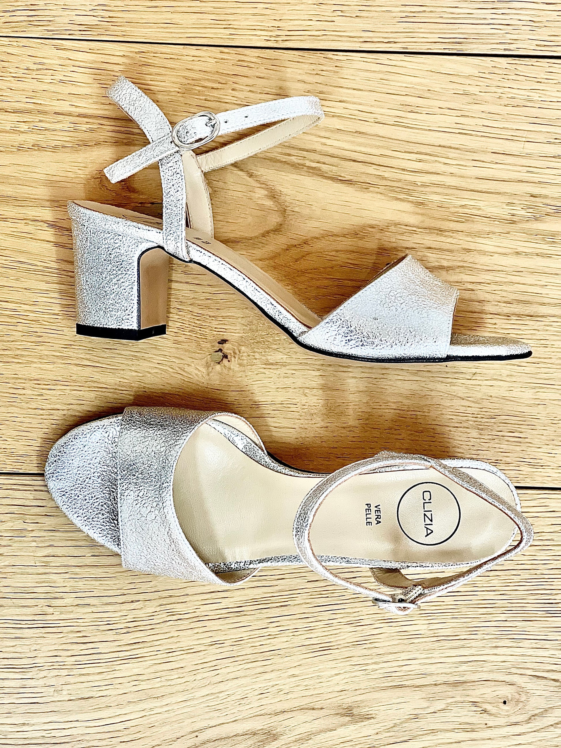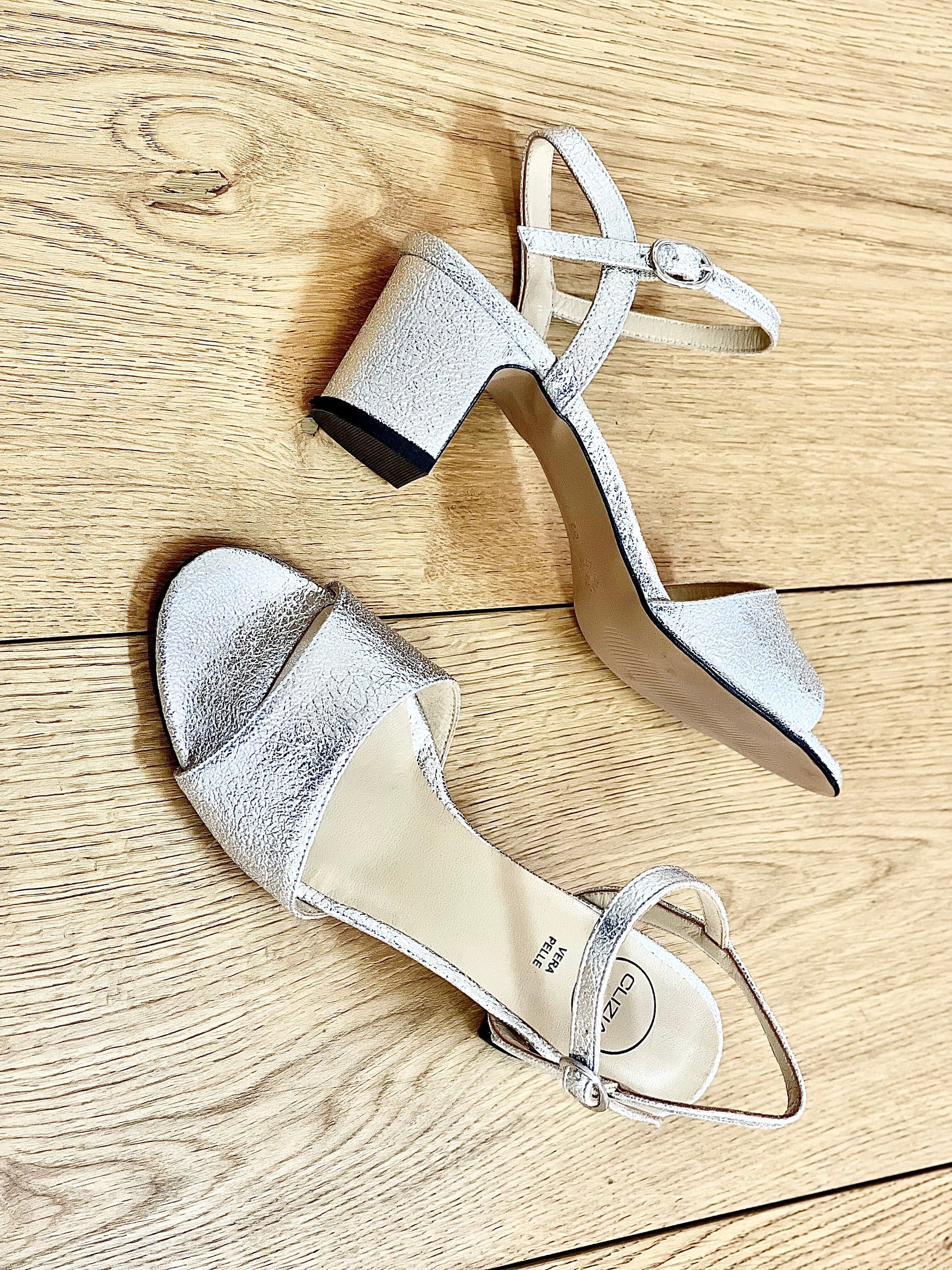 Sandales laminées à talon de 5 cm avec lanière.