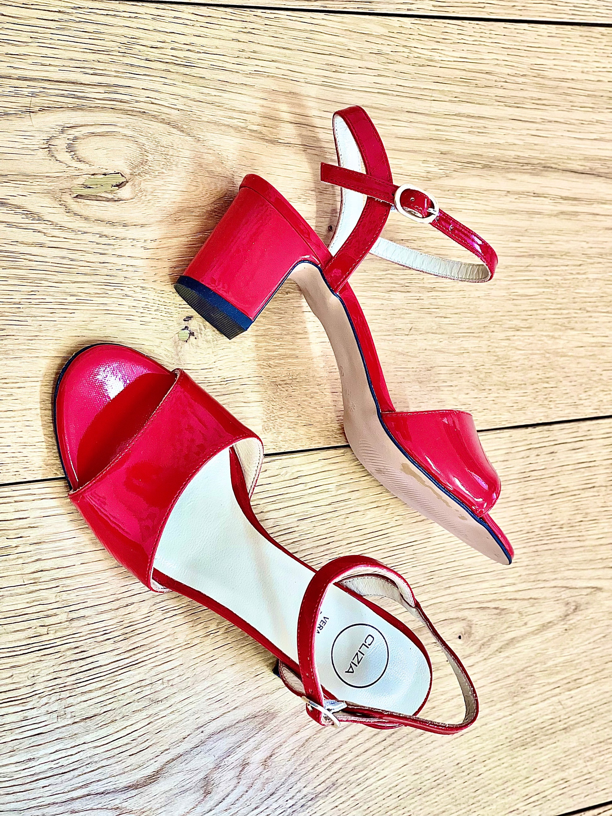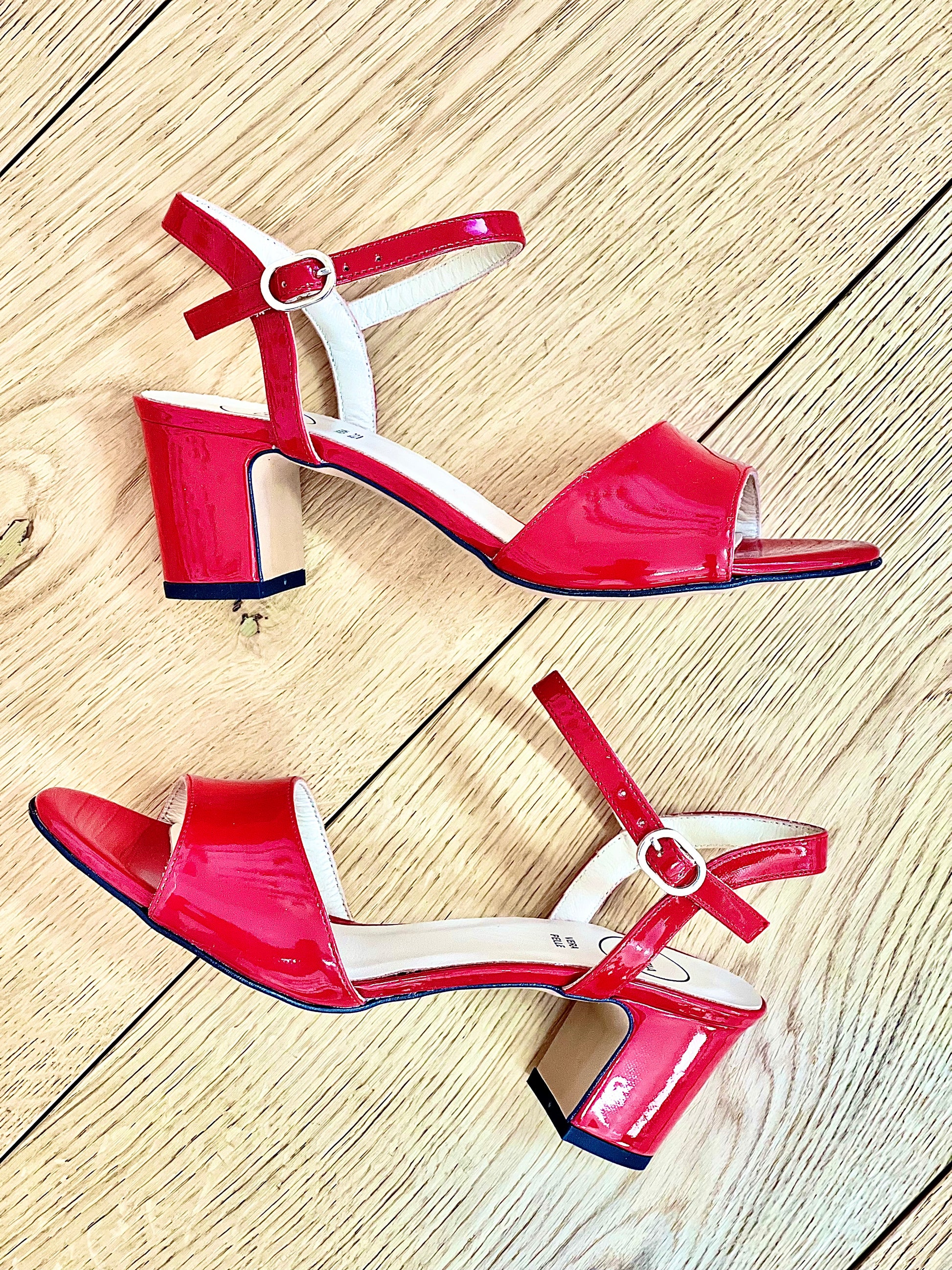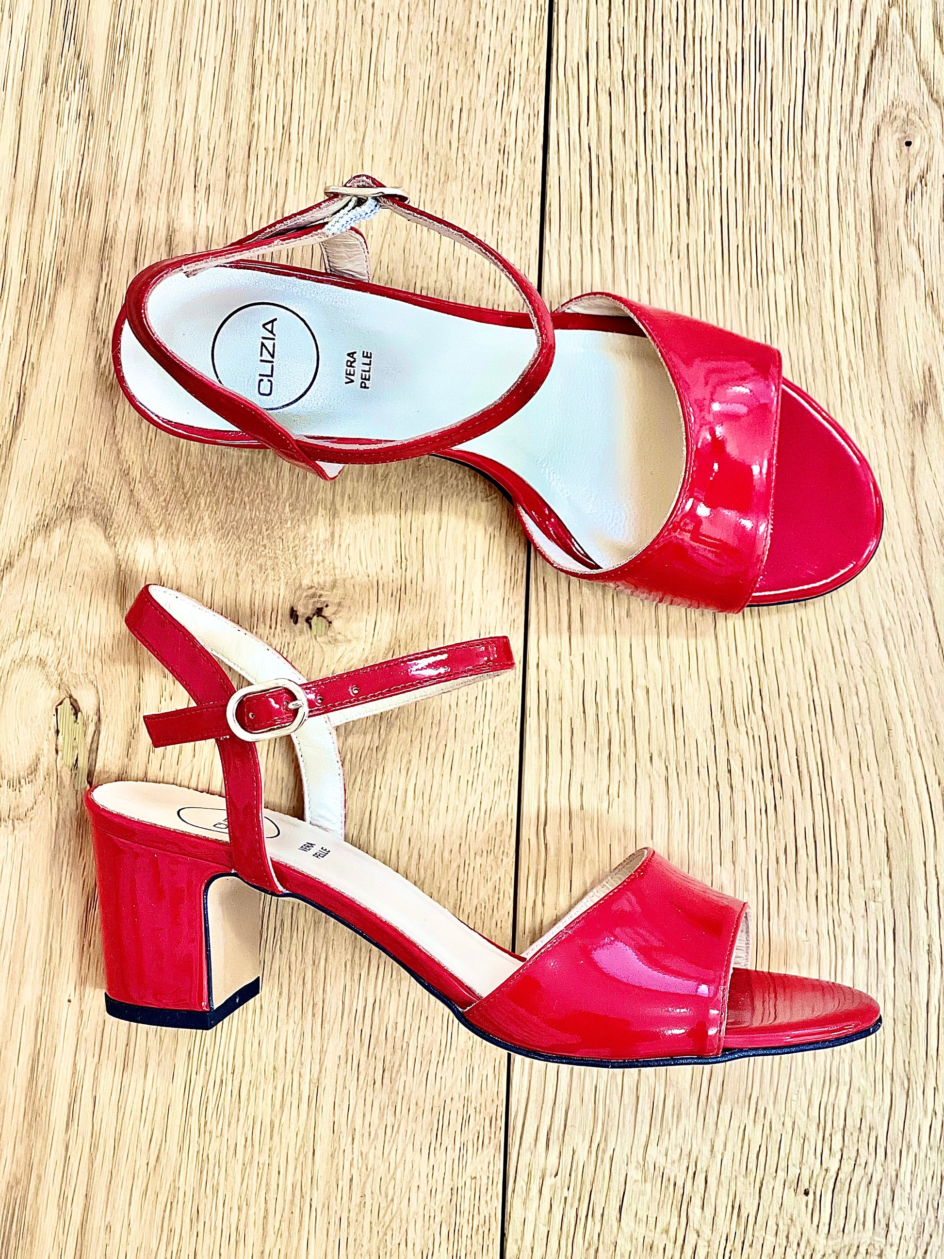 Sandales à talon de 5 cm en cuir verni avec lanière.