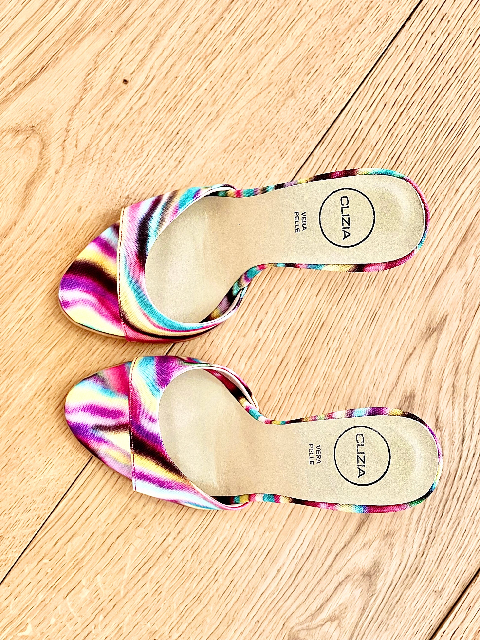 Sandales mules hautes multicolores avec un talon de 10 cm.