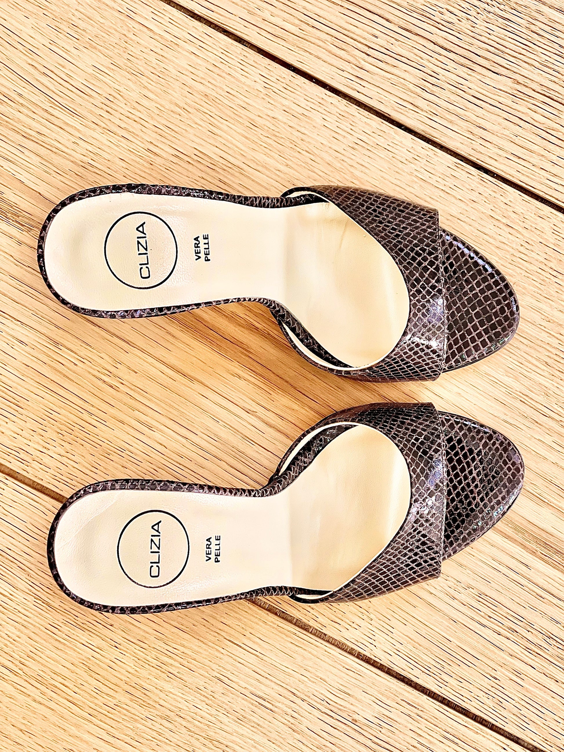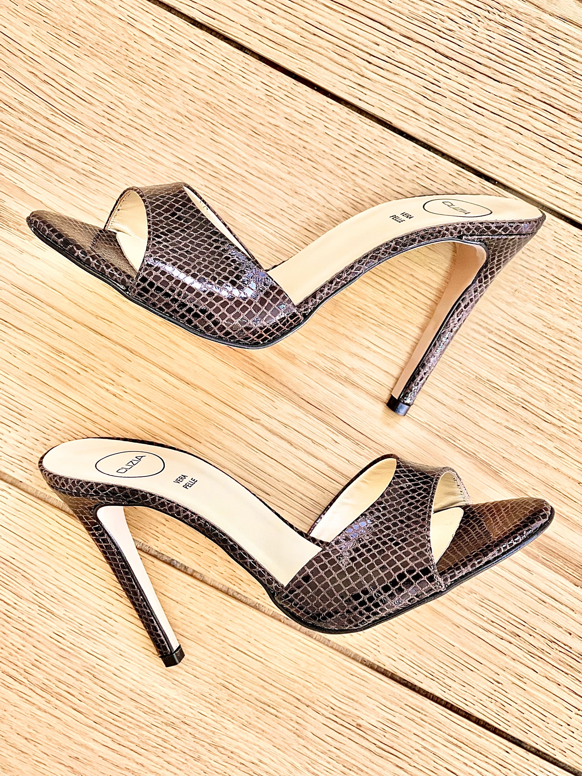 Sandales hautes mules, chausson animal, talon de 10cm.