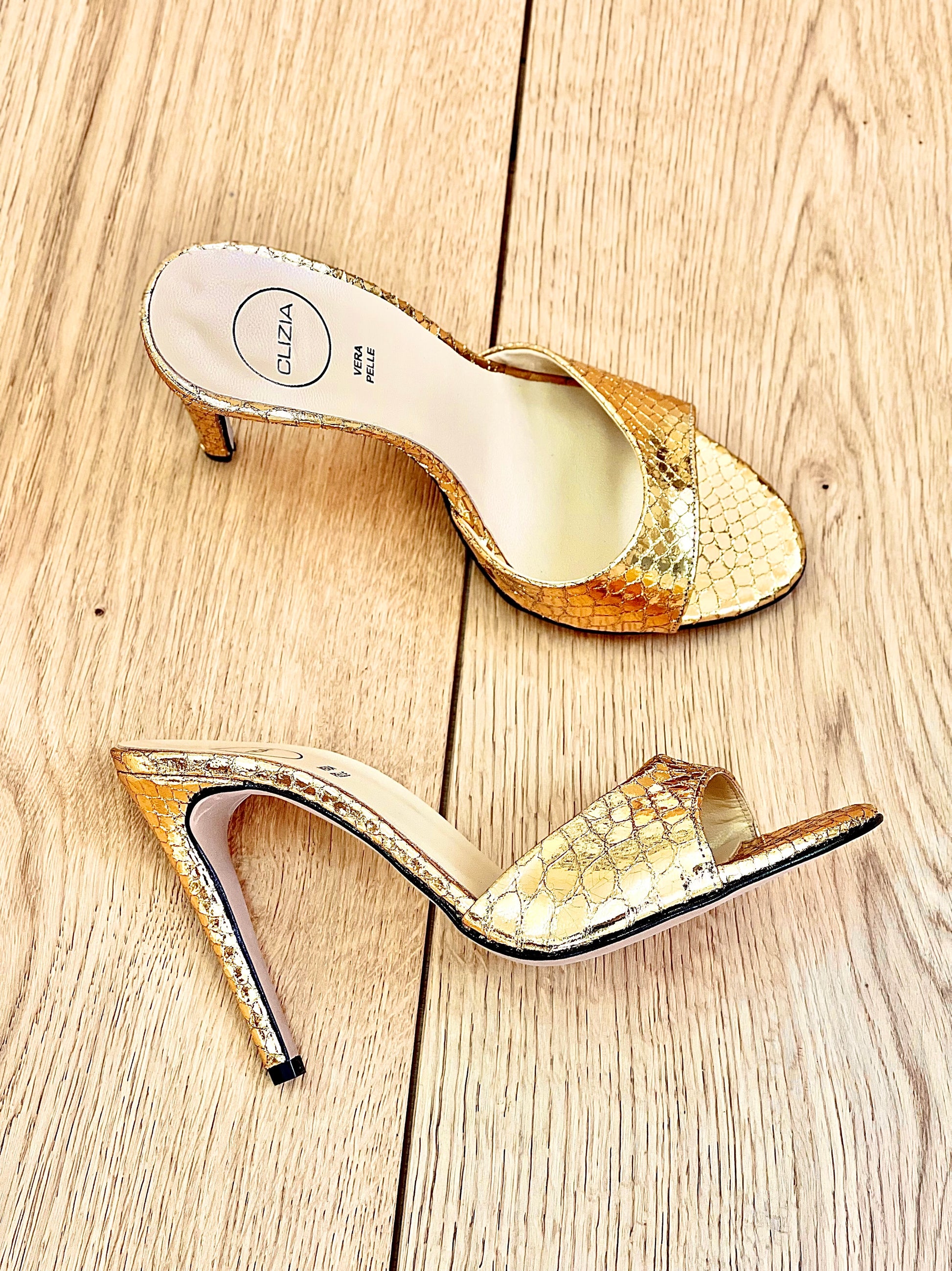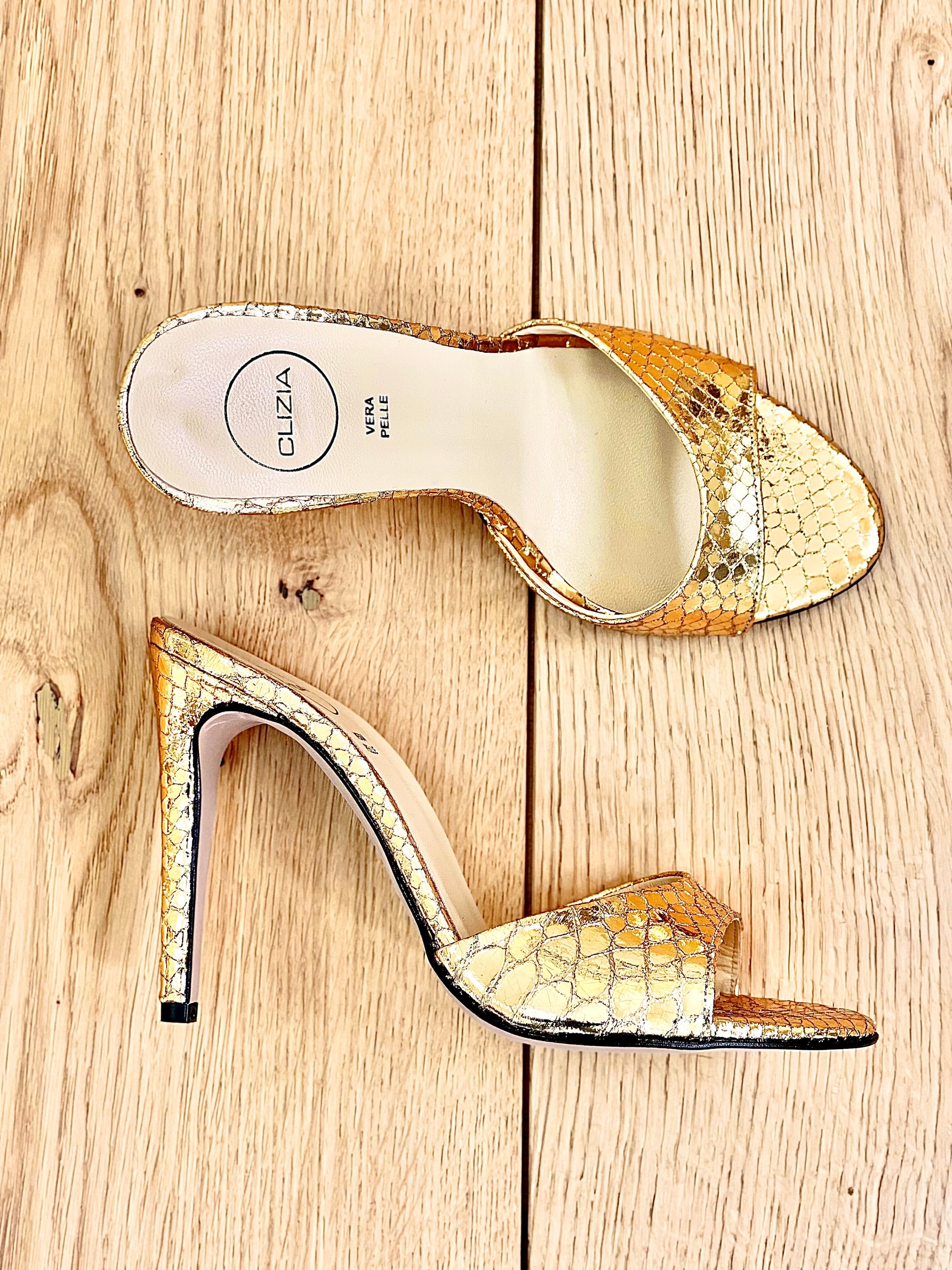 Sandales hautes mules en laminé doré, talon à pointes de 10 cm.