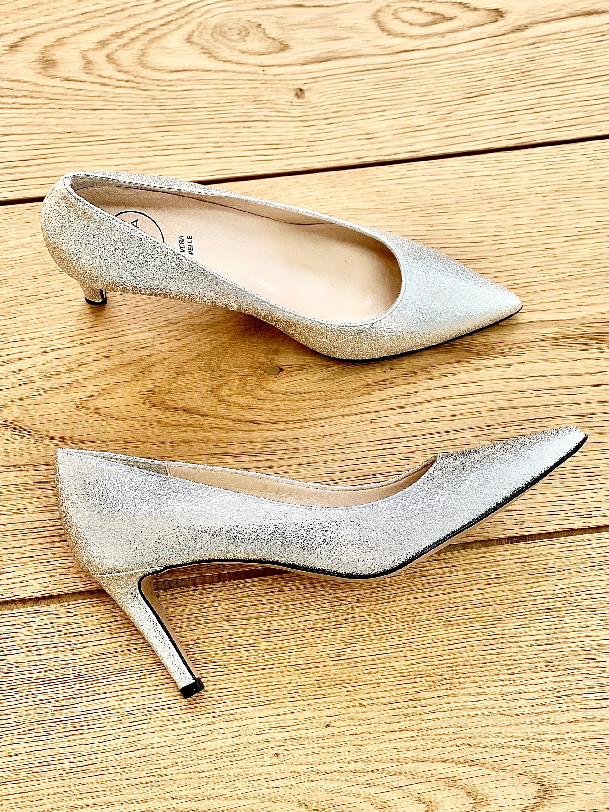 Escarpin à bout pointu en laminé avec un talon à pointes de 7,5 cm.
