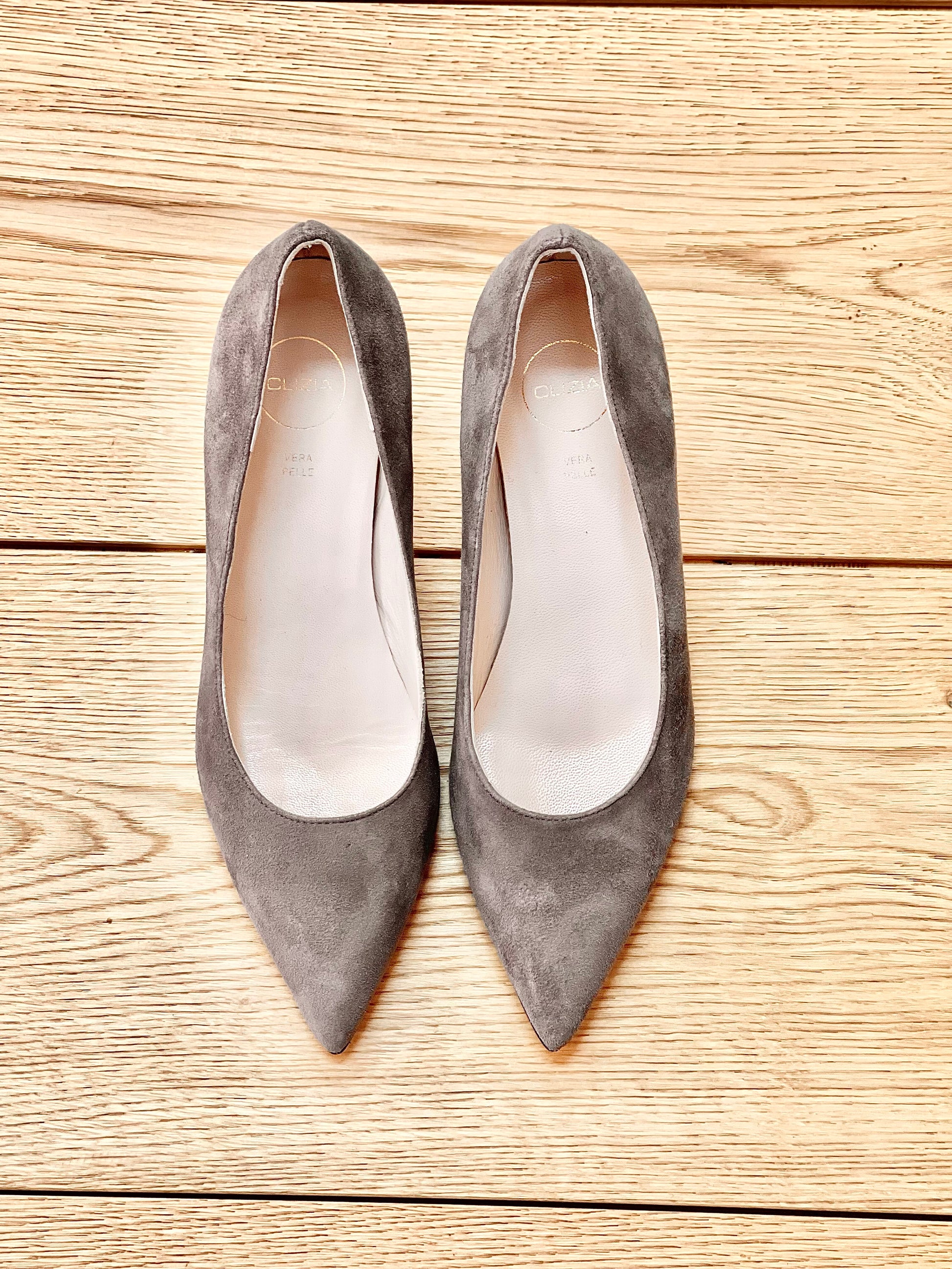 Escarpin à bout pointu en daim avec talon aiguille de 75 mm.
