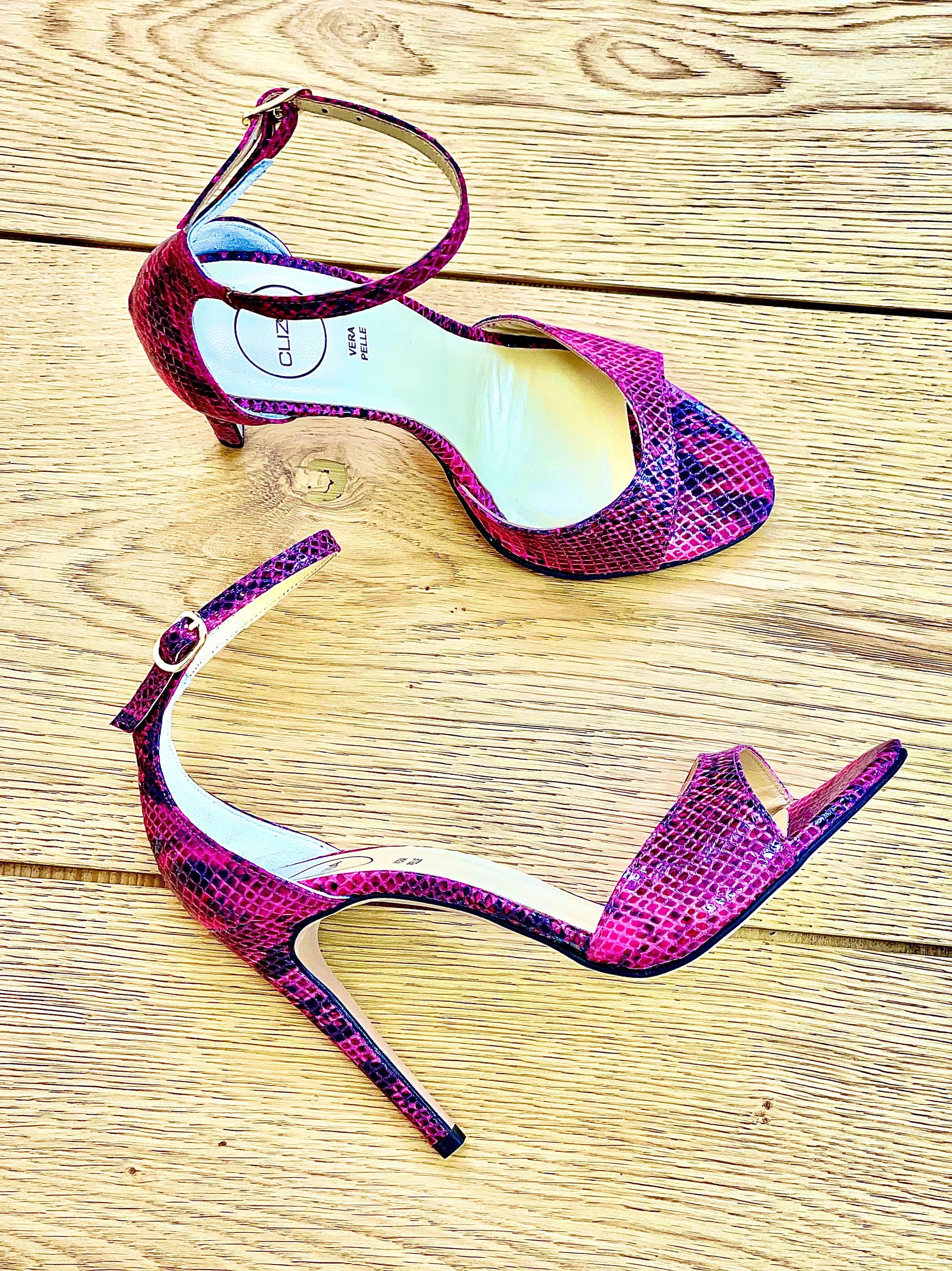 Sandales à talon haut en imprimé animal avec un talon à pointes de 10 cm.