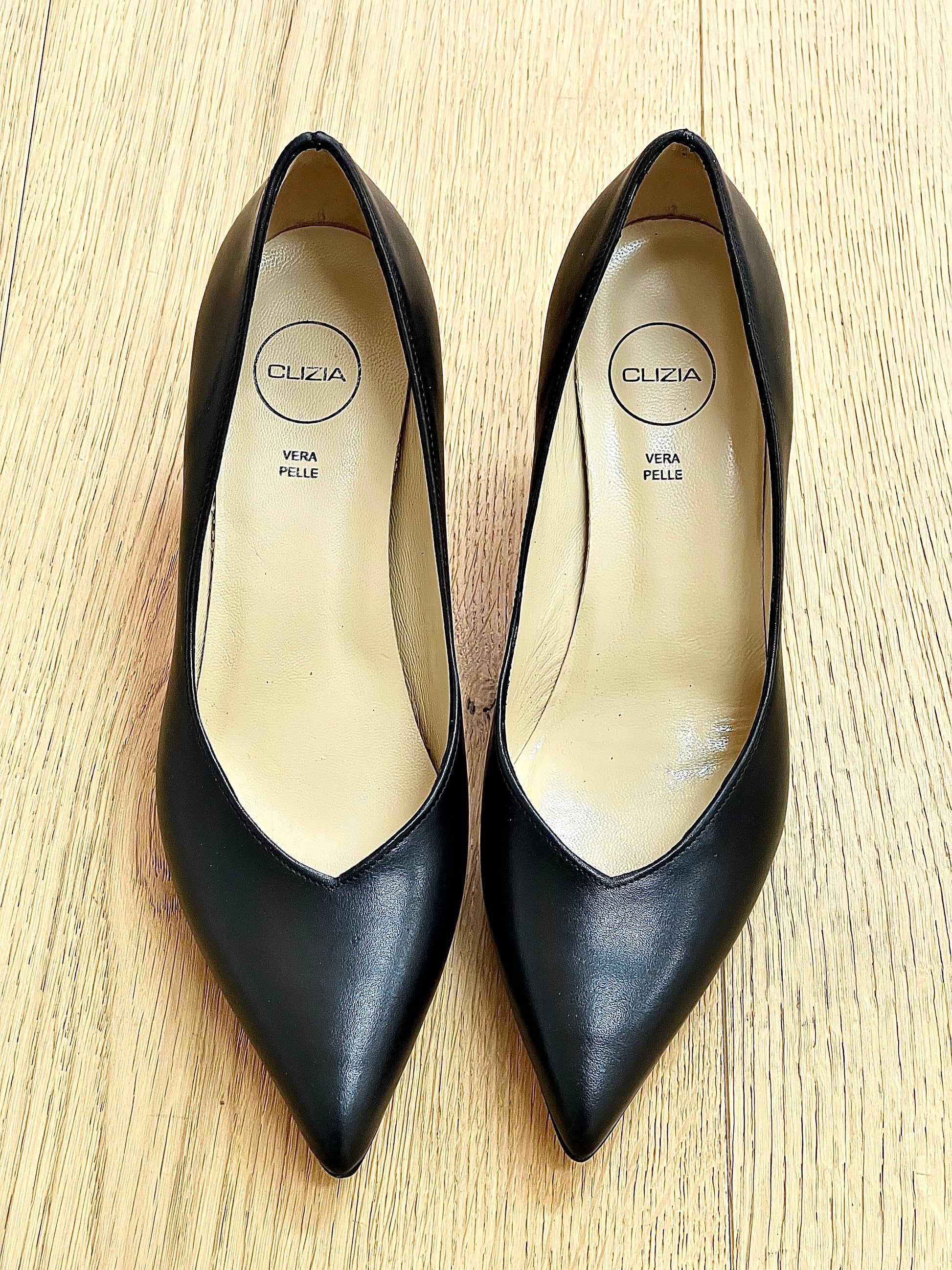 Escarpin en cuir à bout pointu avec col en V et talon bobine de 6 cm.