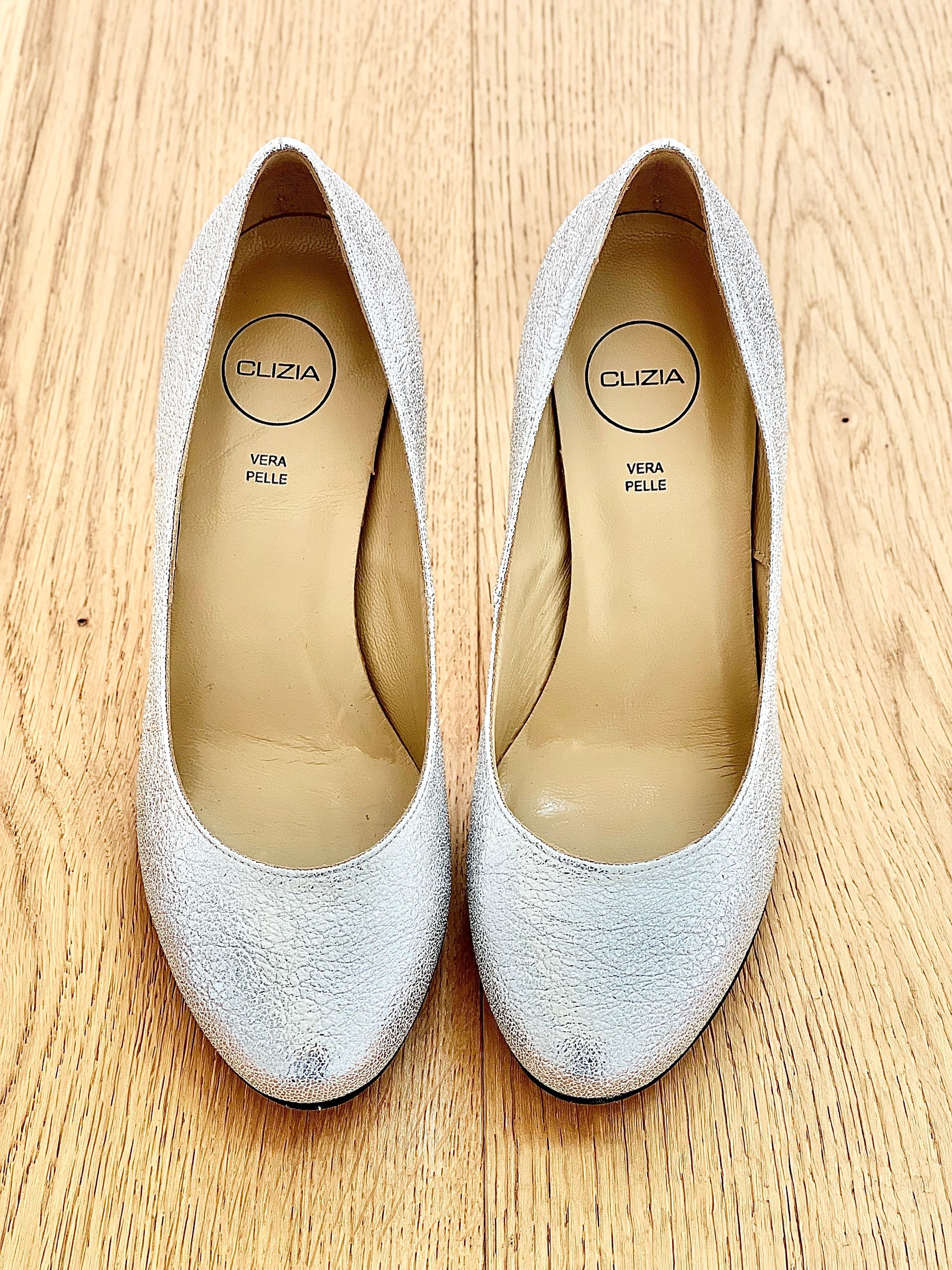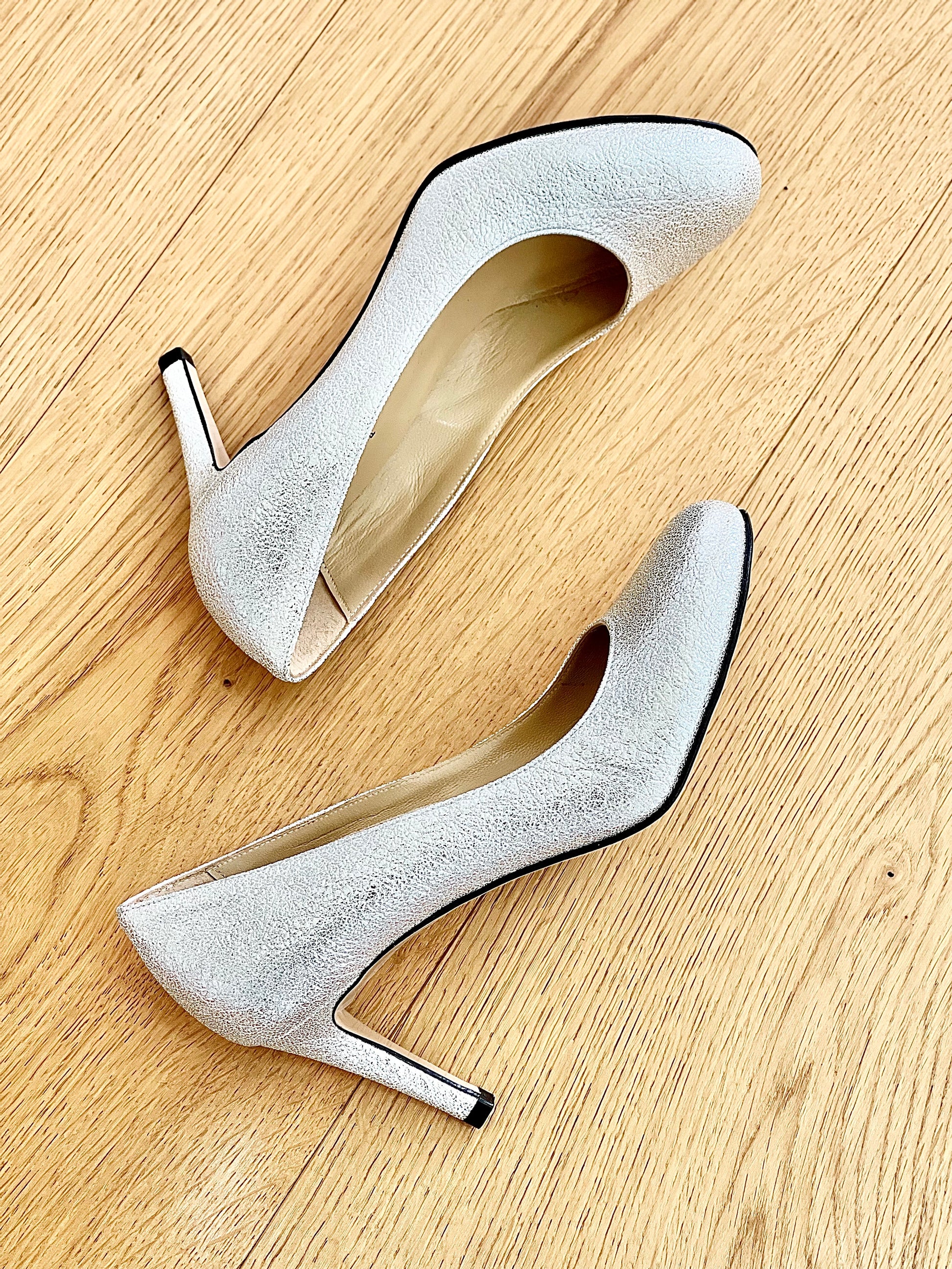 Escarpins à bout rond avec un talon aiguille de 8 cm laminé.