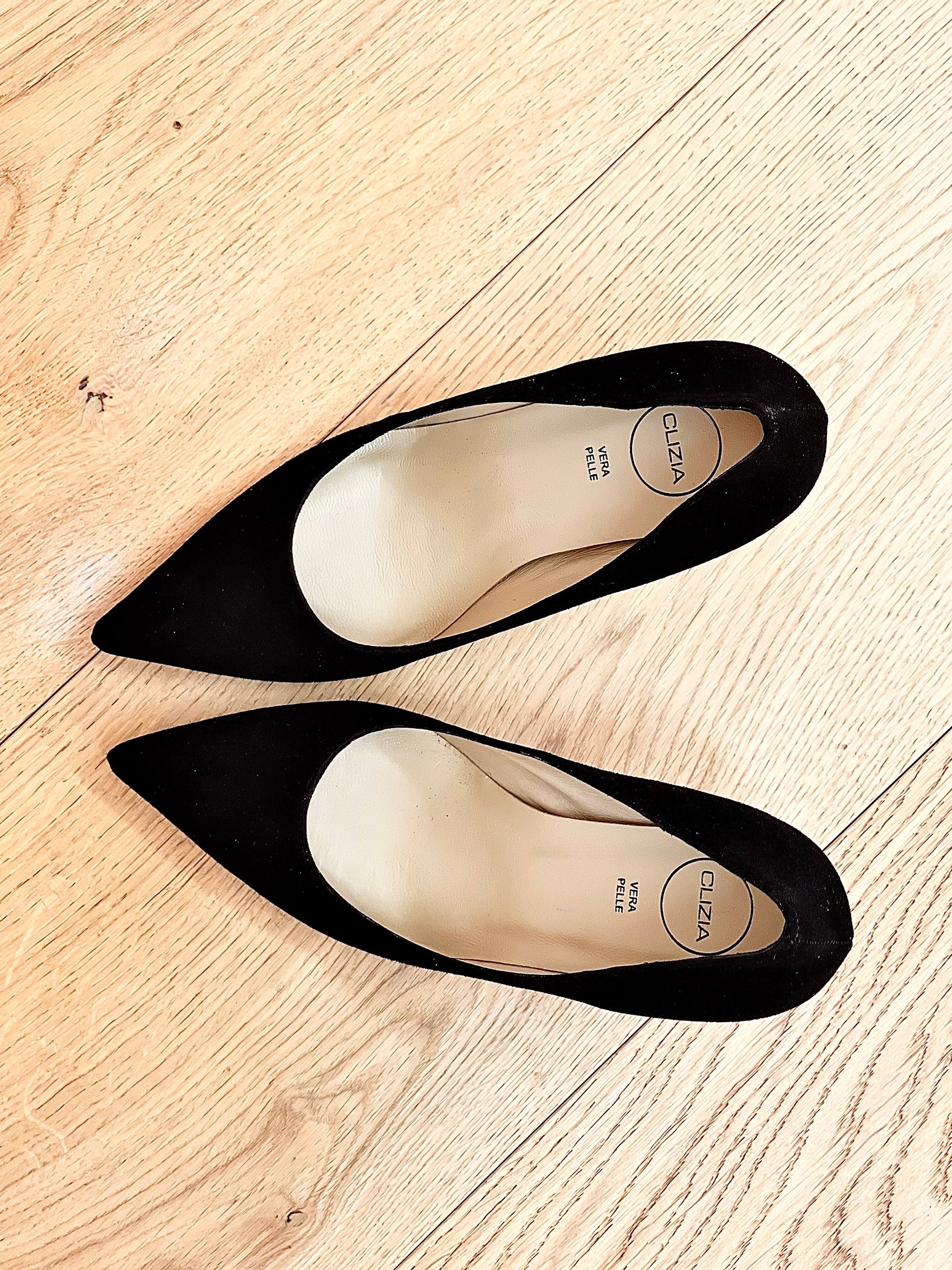 Escarpins en daim à bout pointu avec talon bobine de 8 cm.