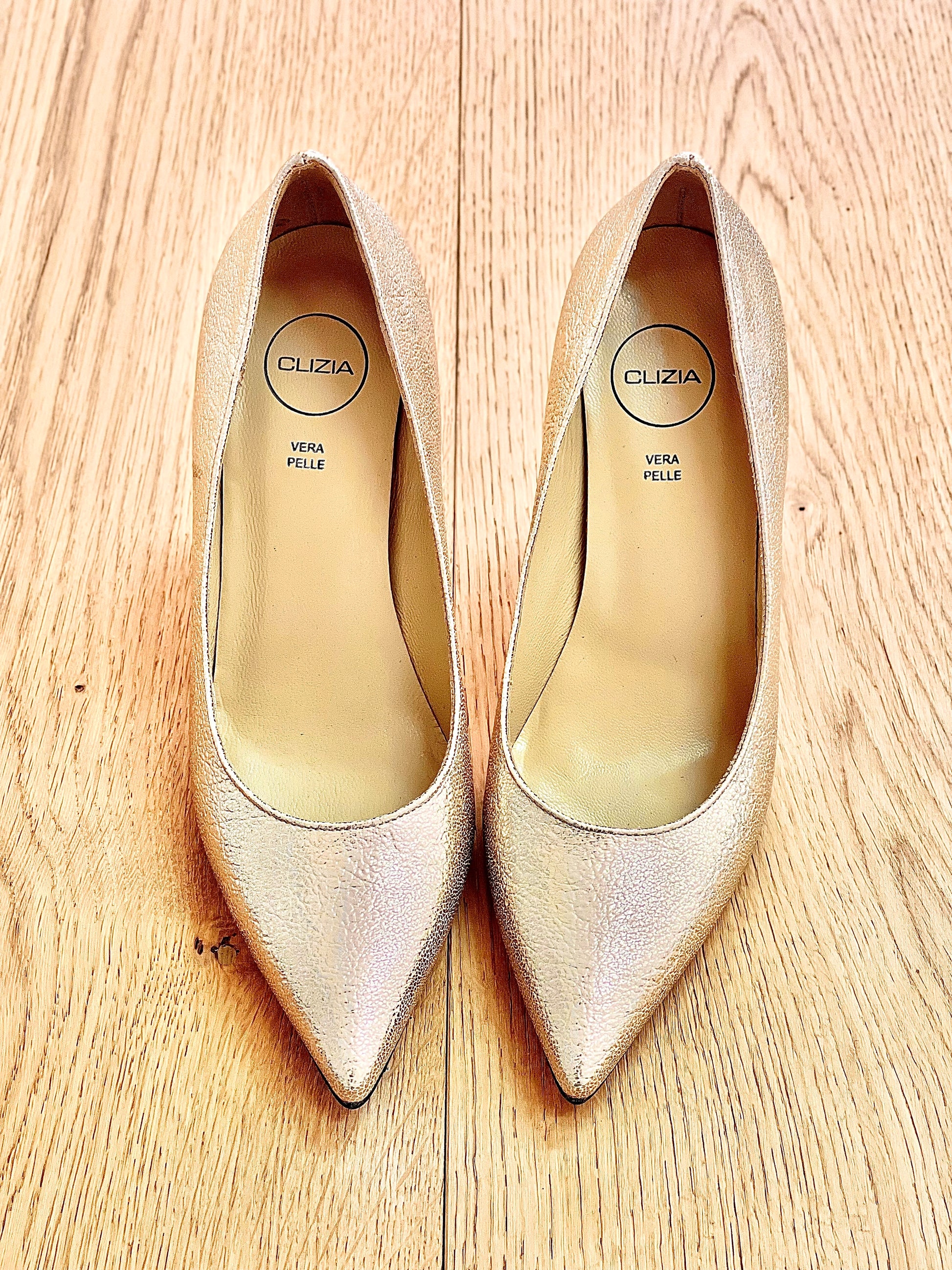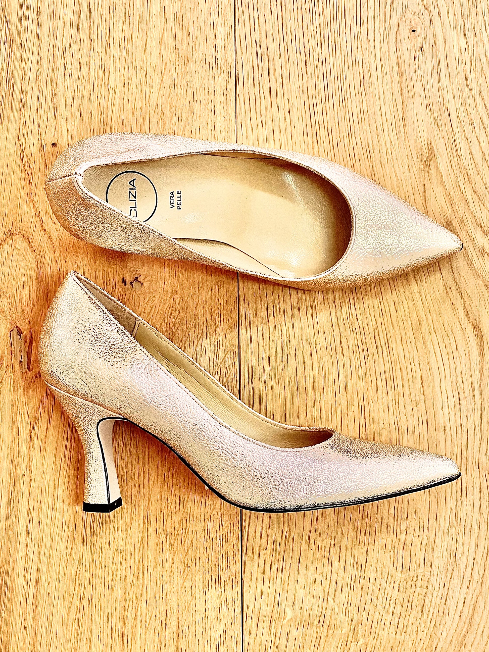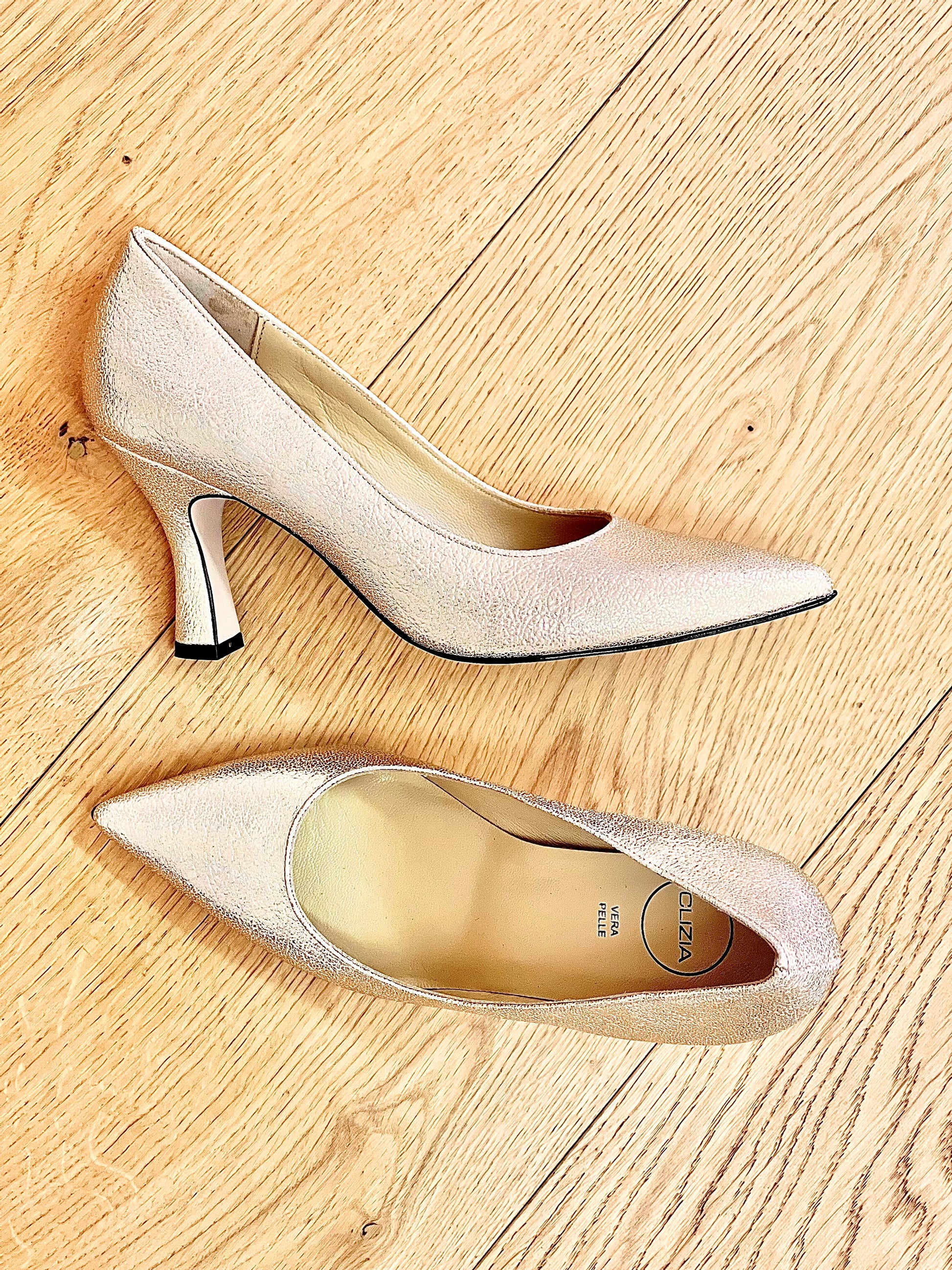 Escarpins laminés à bout pointu avec talon bobine de 8 cm.