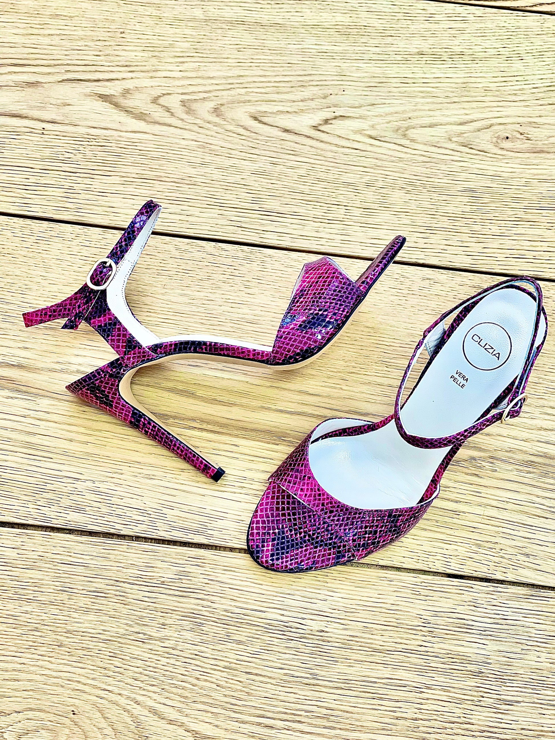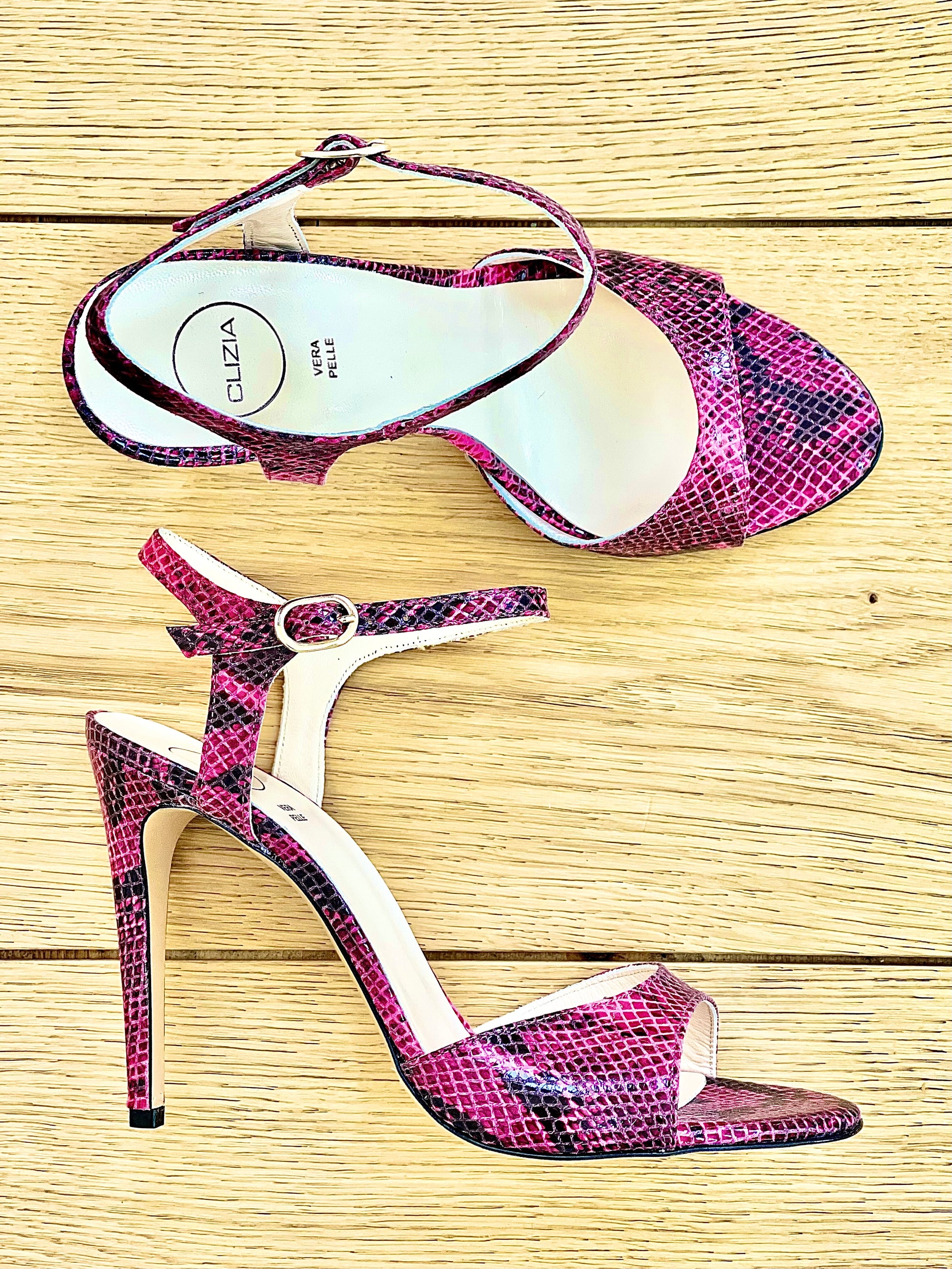 Sandales à talon haut à imprimé animal avec bande et sangle.