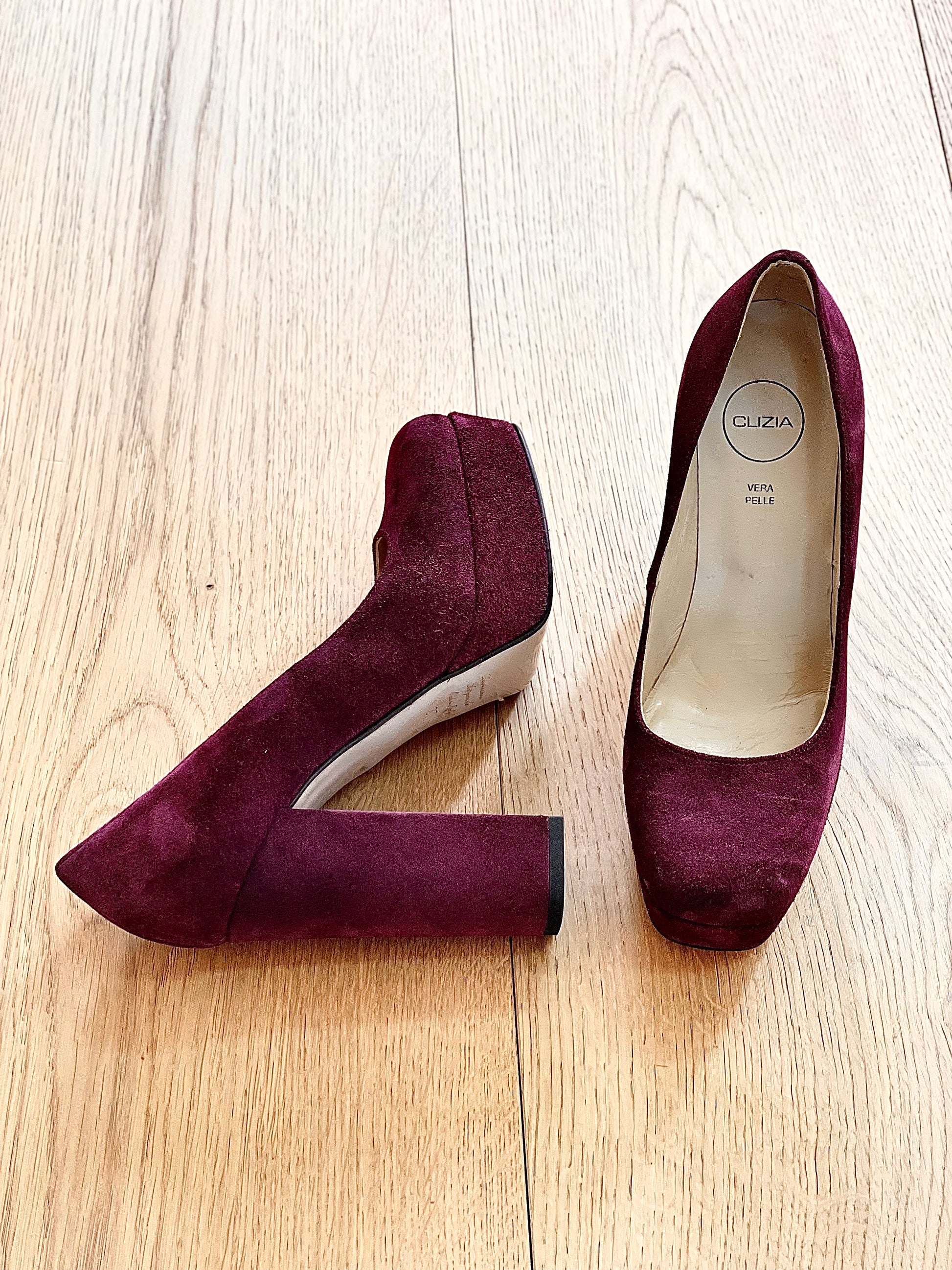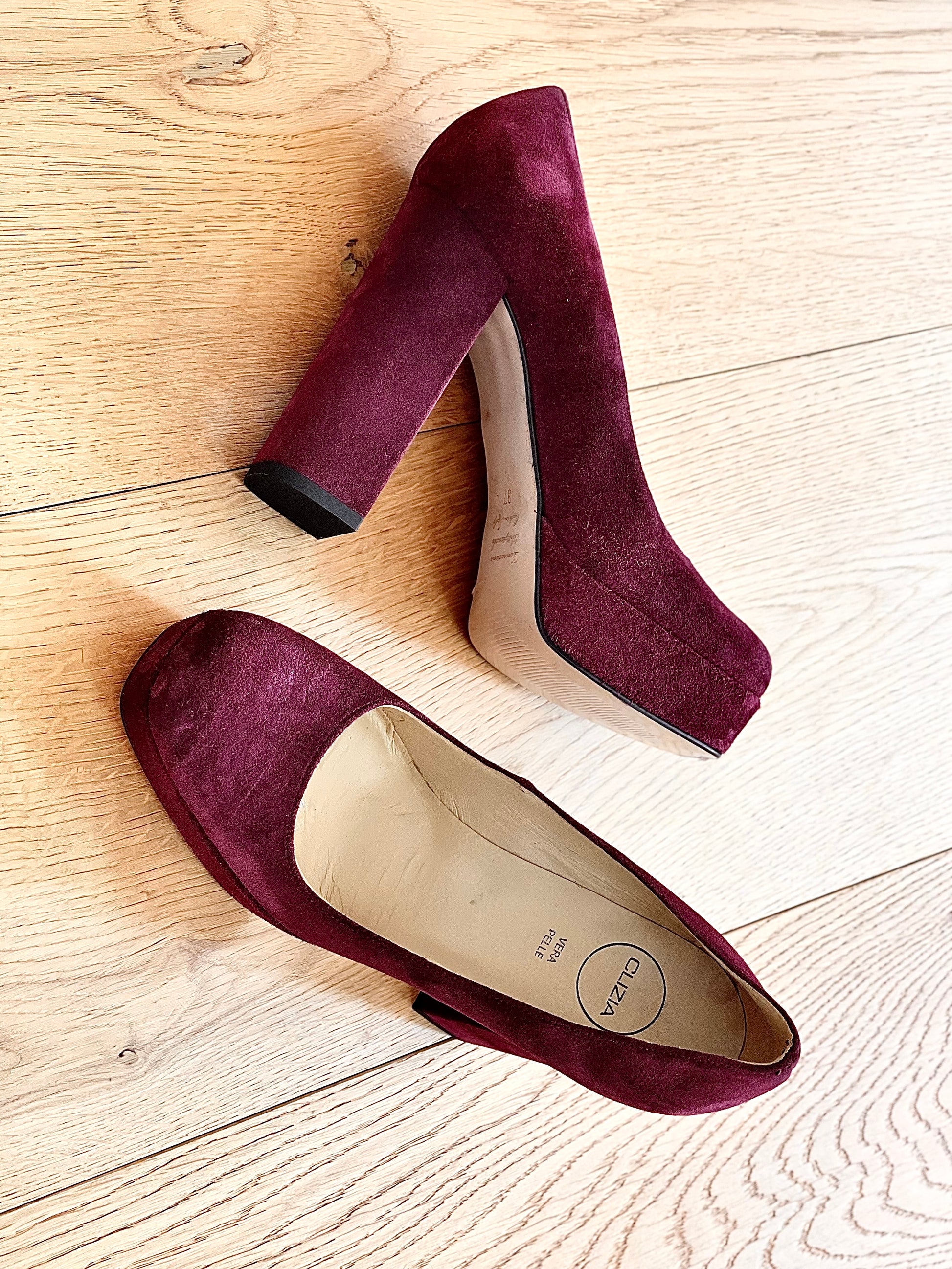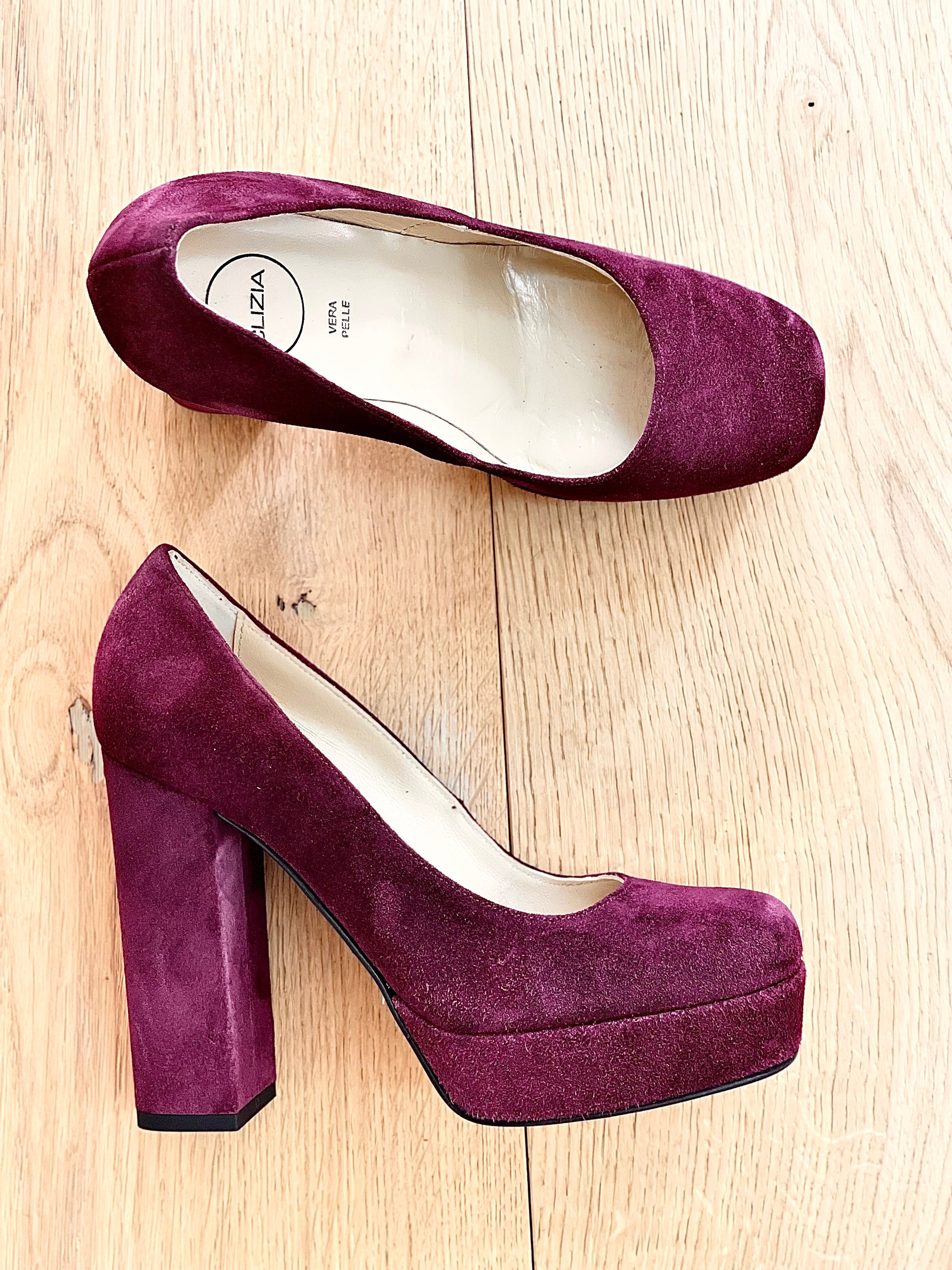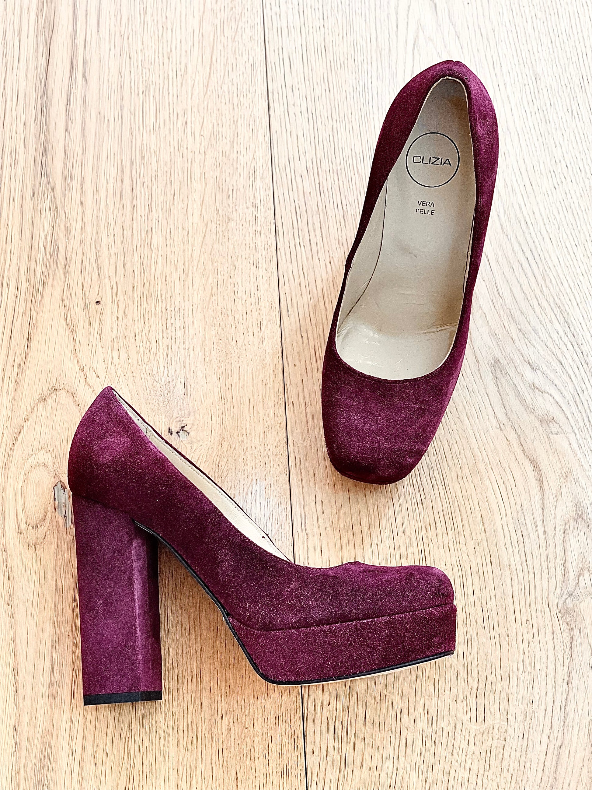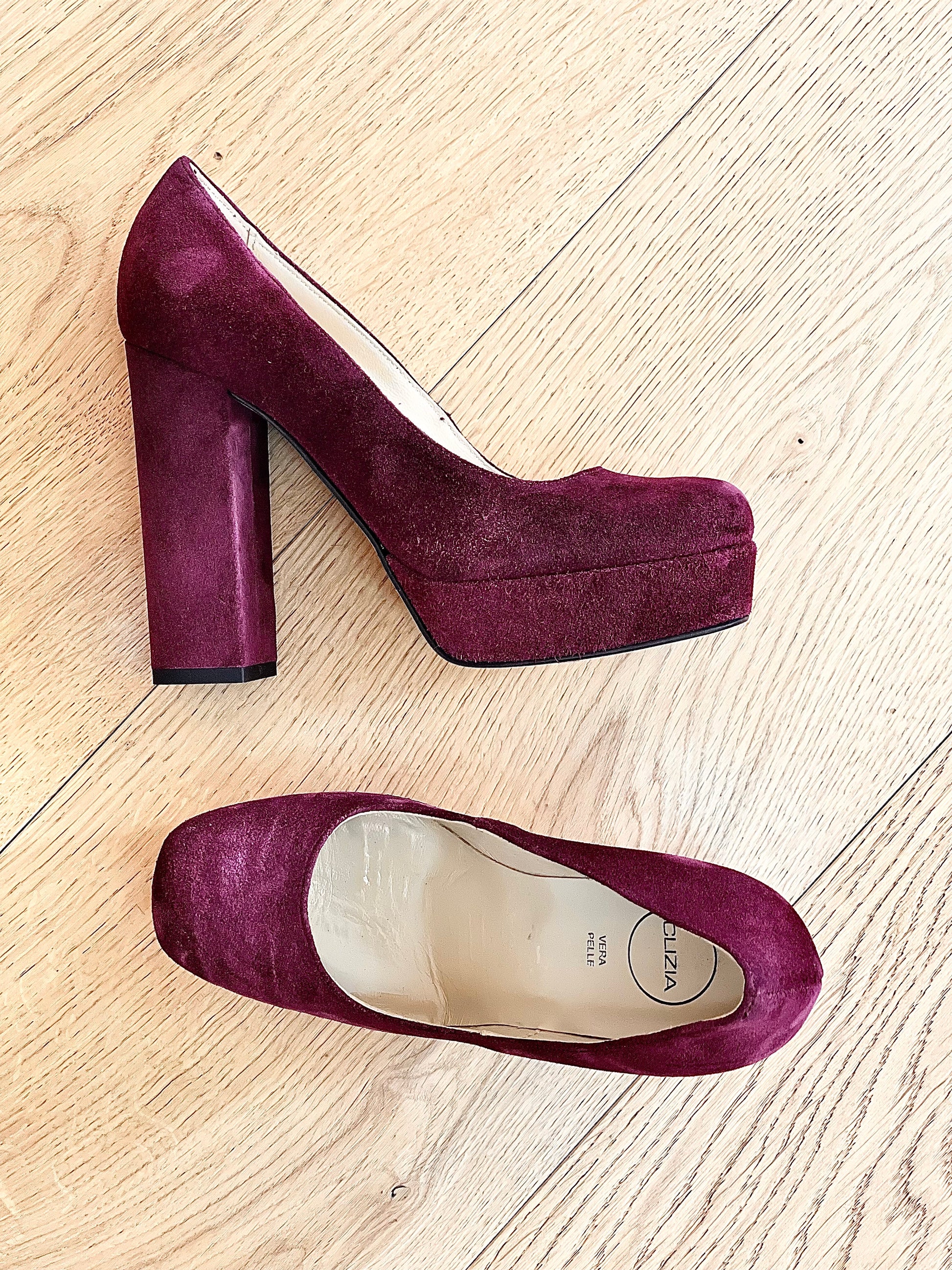 Escarpins hauts en daim à talon large et à plateforme semi-carrée.