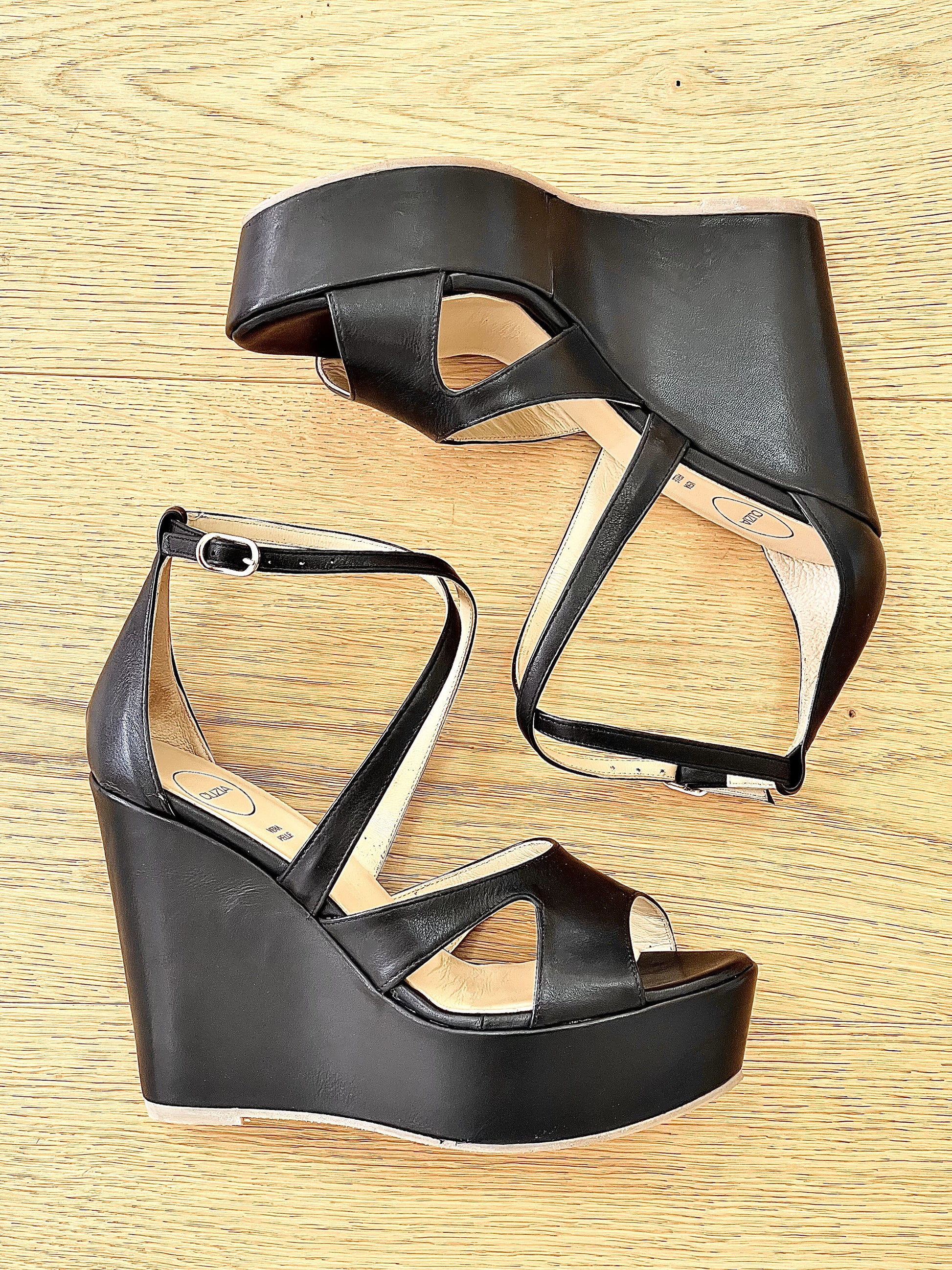 Sandales hautes à lanières en cuir avec talon compensé de 11,5 cm.