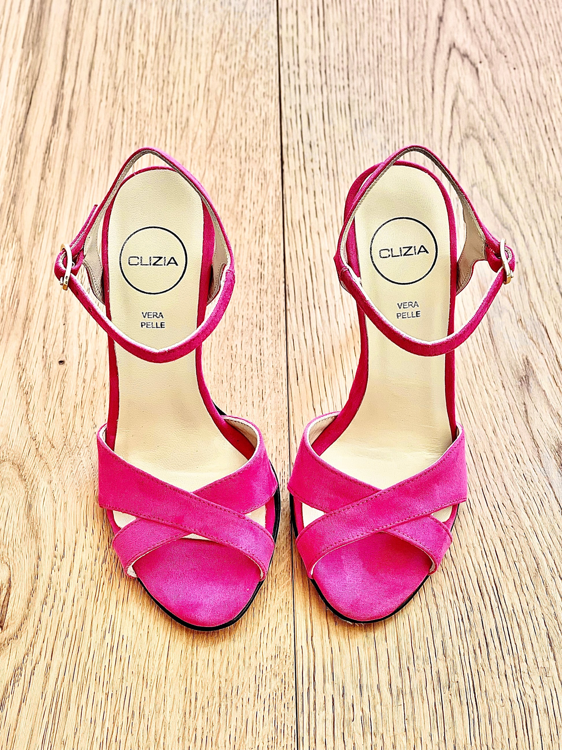 Sandales hautes en daim, croisées et à lanières, à talon de 10 cm.