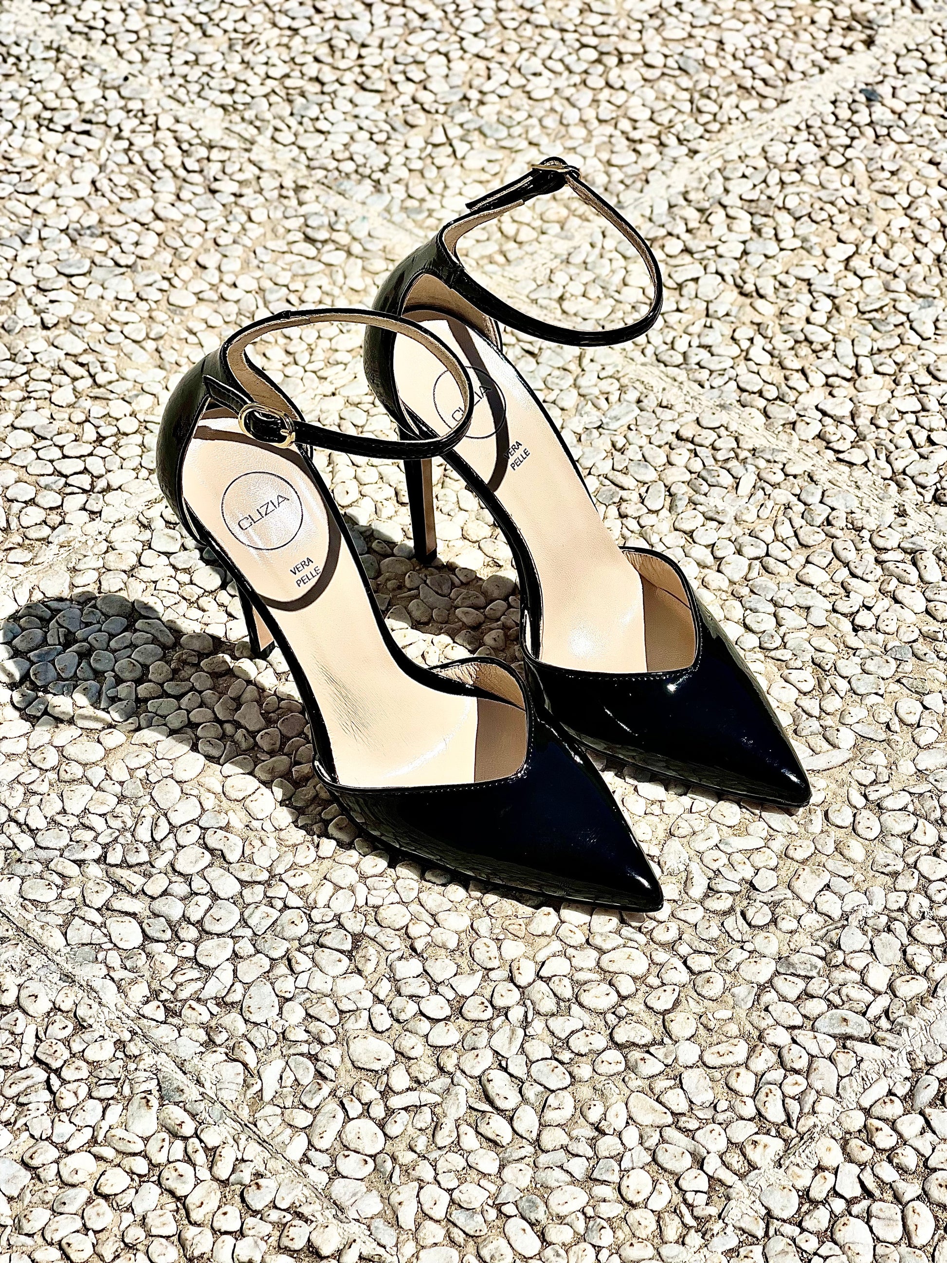 Escarpin à bout pointu et à talon de 10 cm avec col en V.