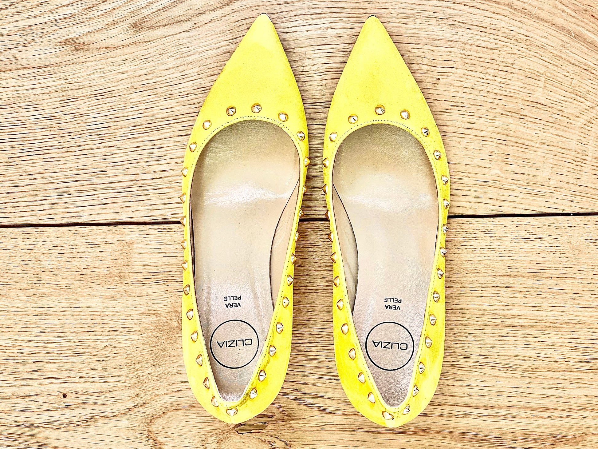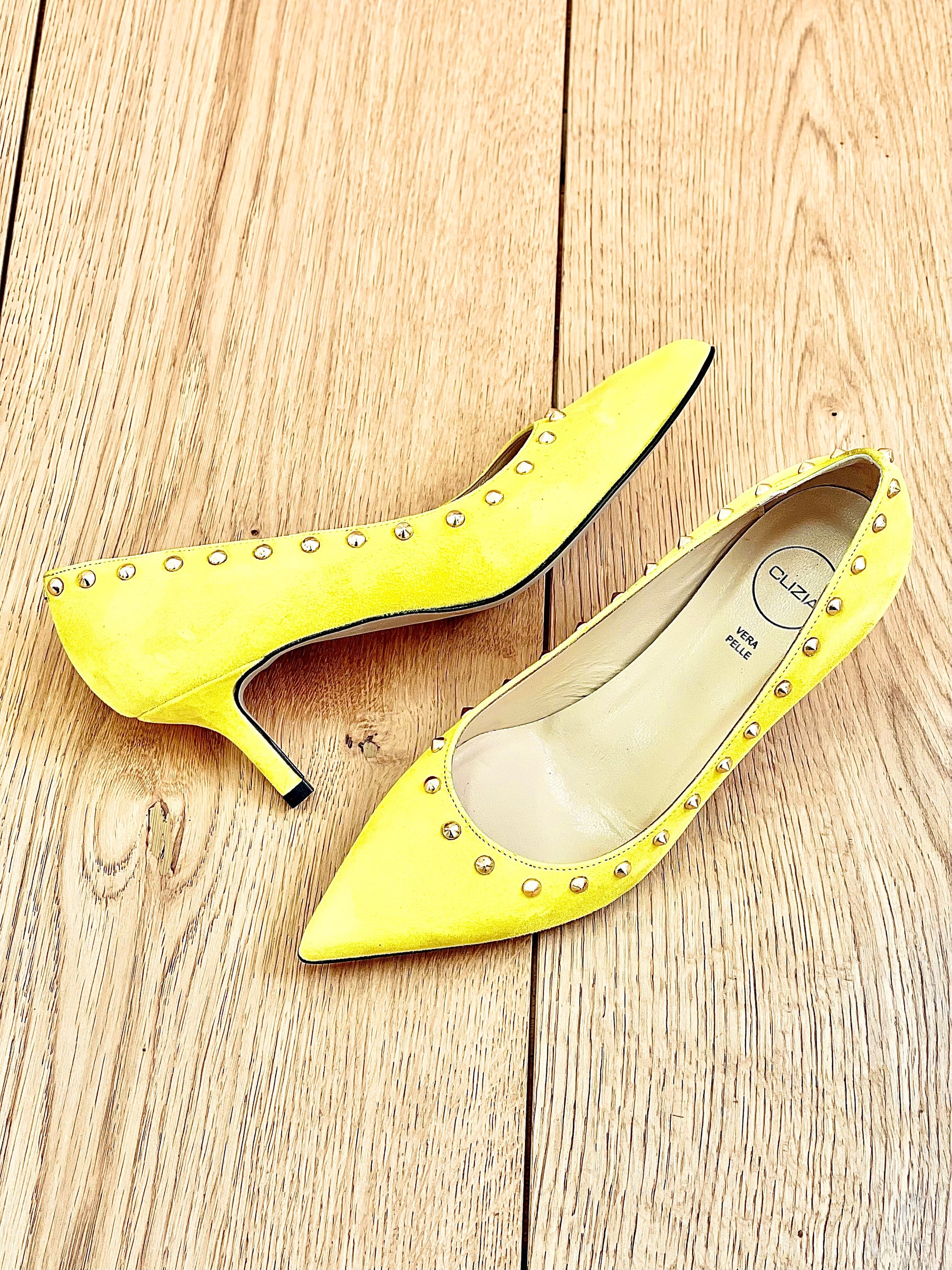 Décolleté à bout pointu en daim avec clous et talon de 6 cm.
