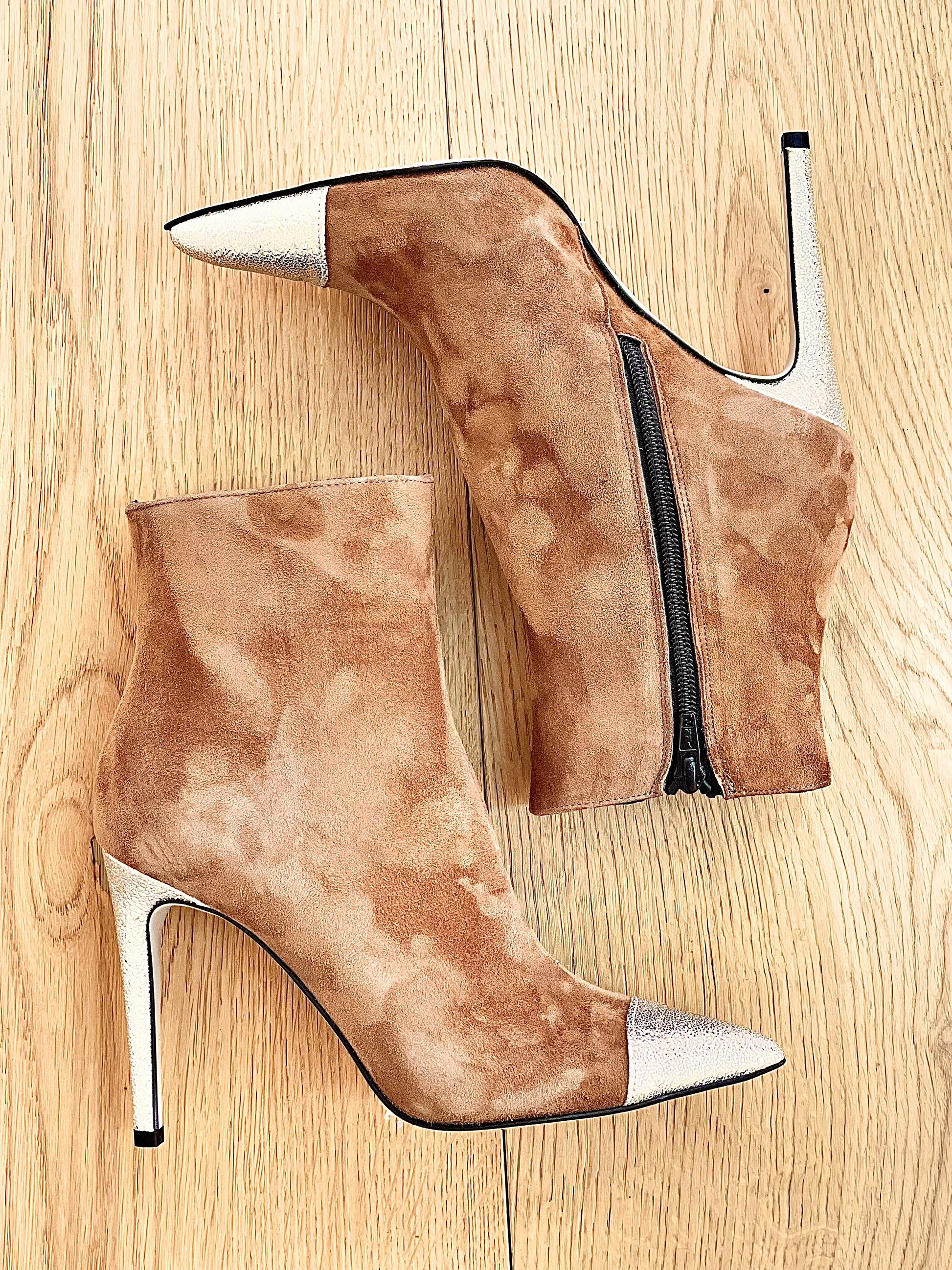 Bottines hautes en cuir suédé avec talon à pointes dorées.