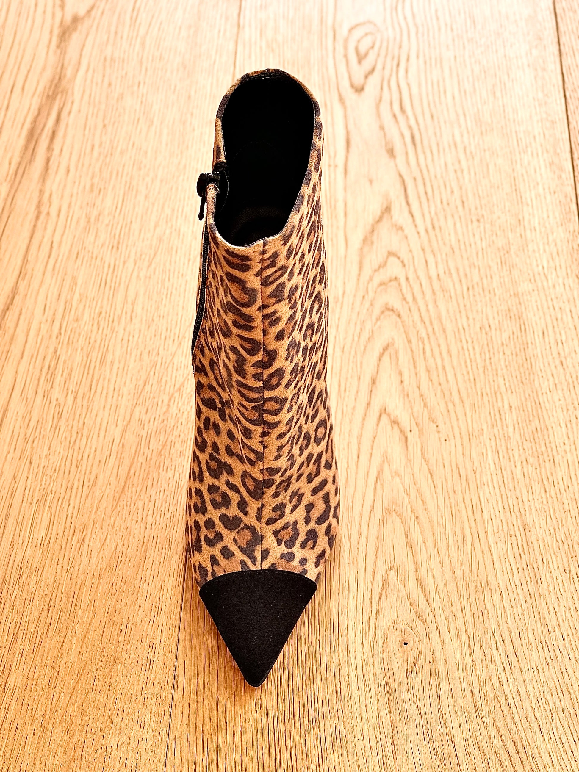 Bottines à talon haut en animalier, talon aiguille de 10 cm.