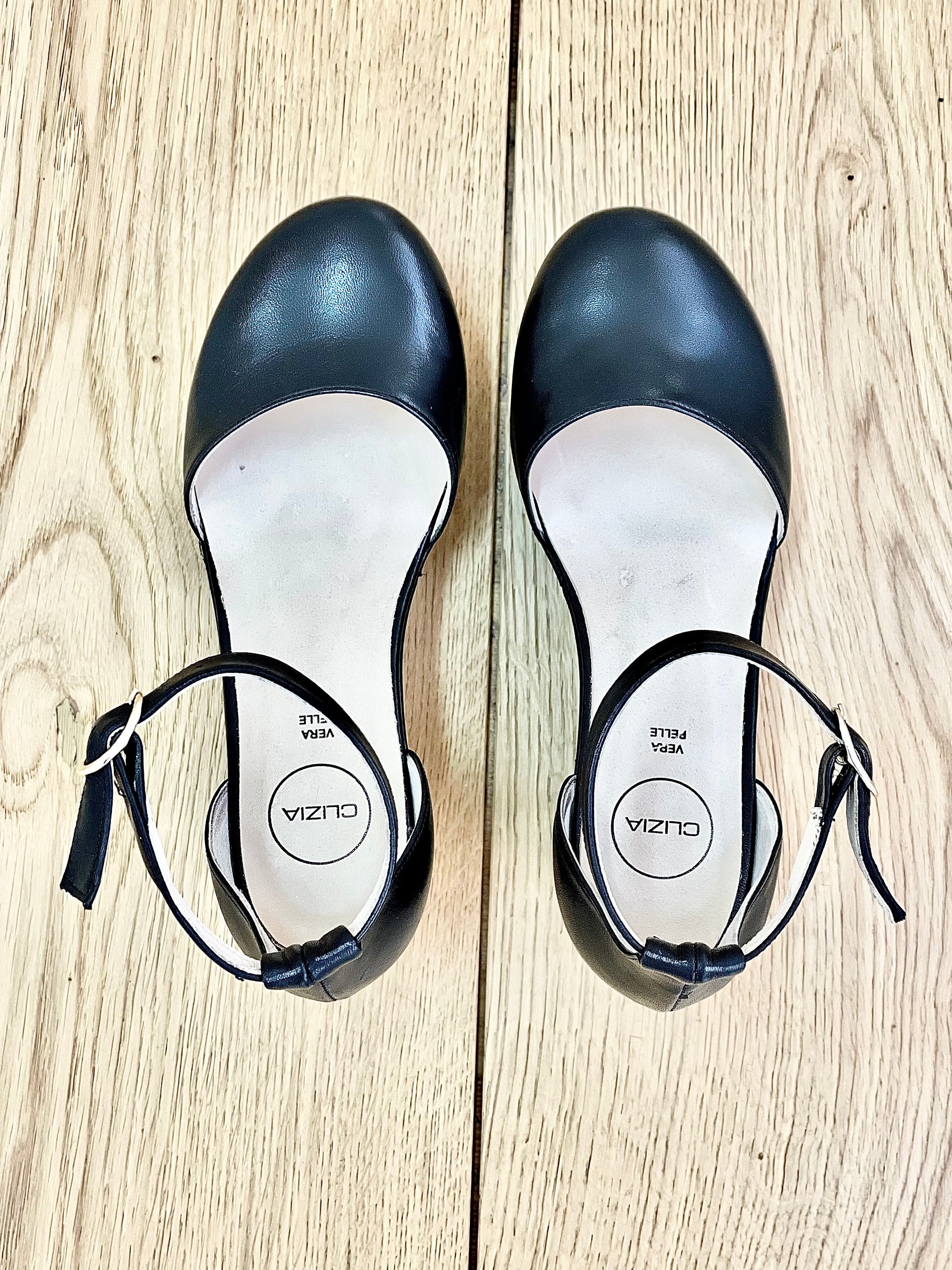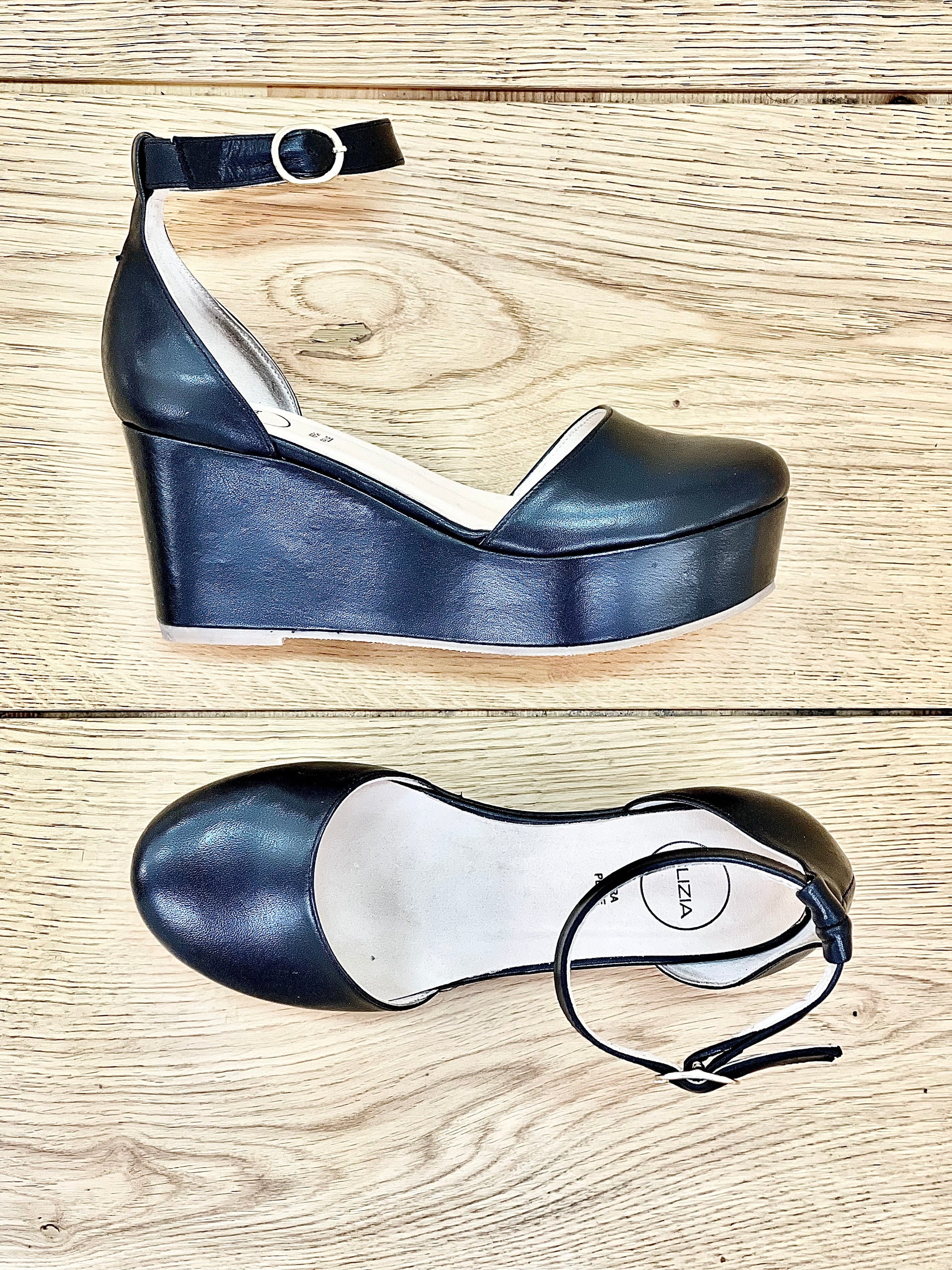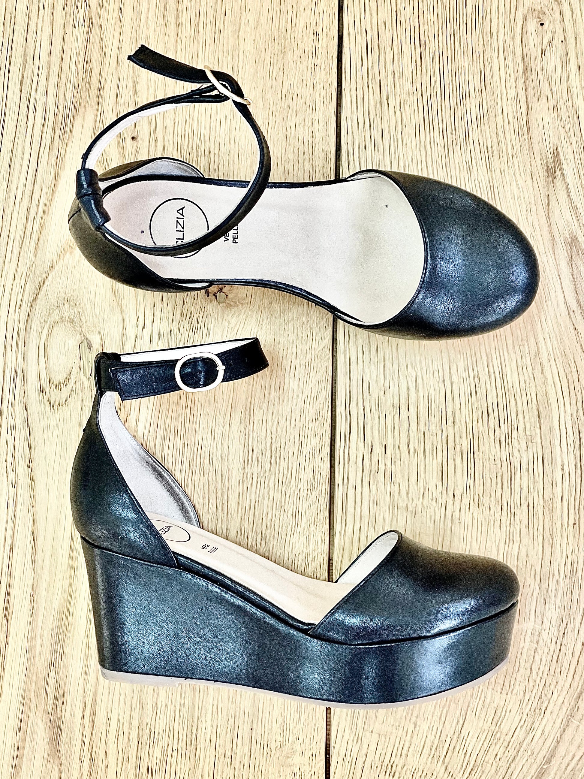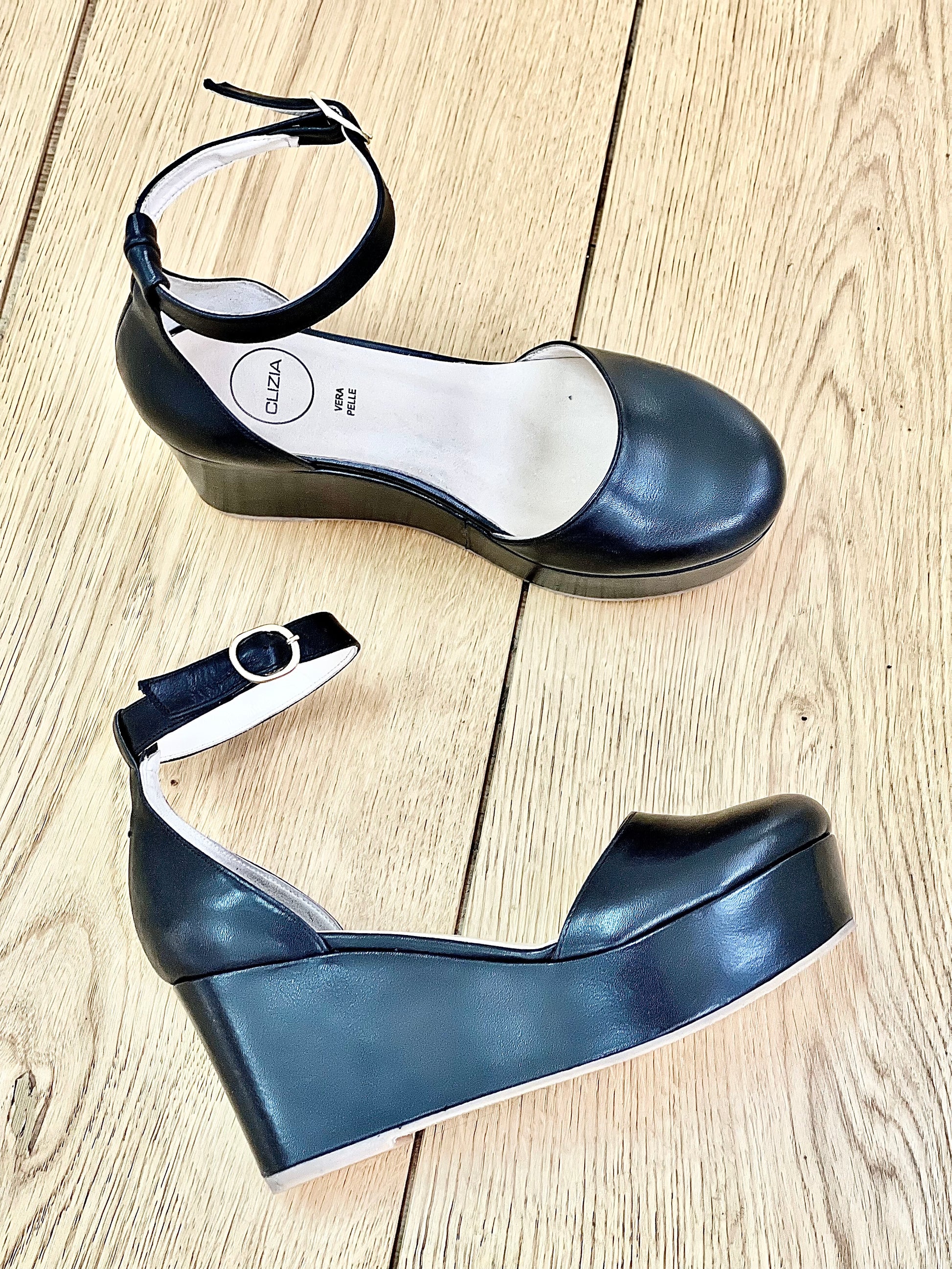 Bout et talon en cuir décolletés sur une cale de 8 cm.