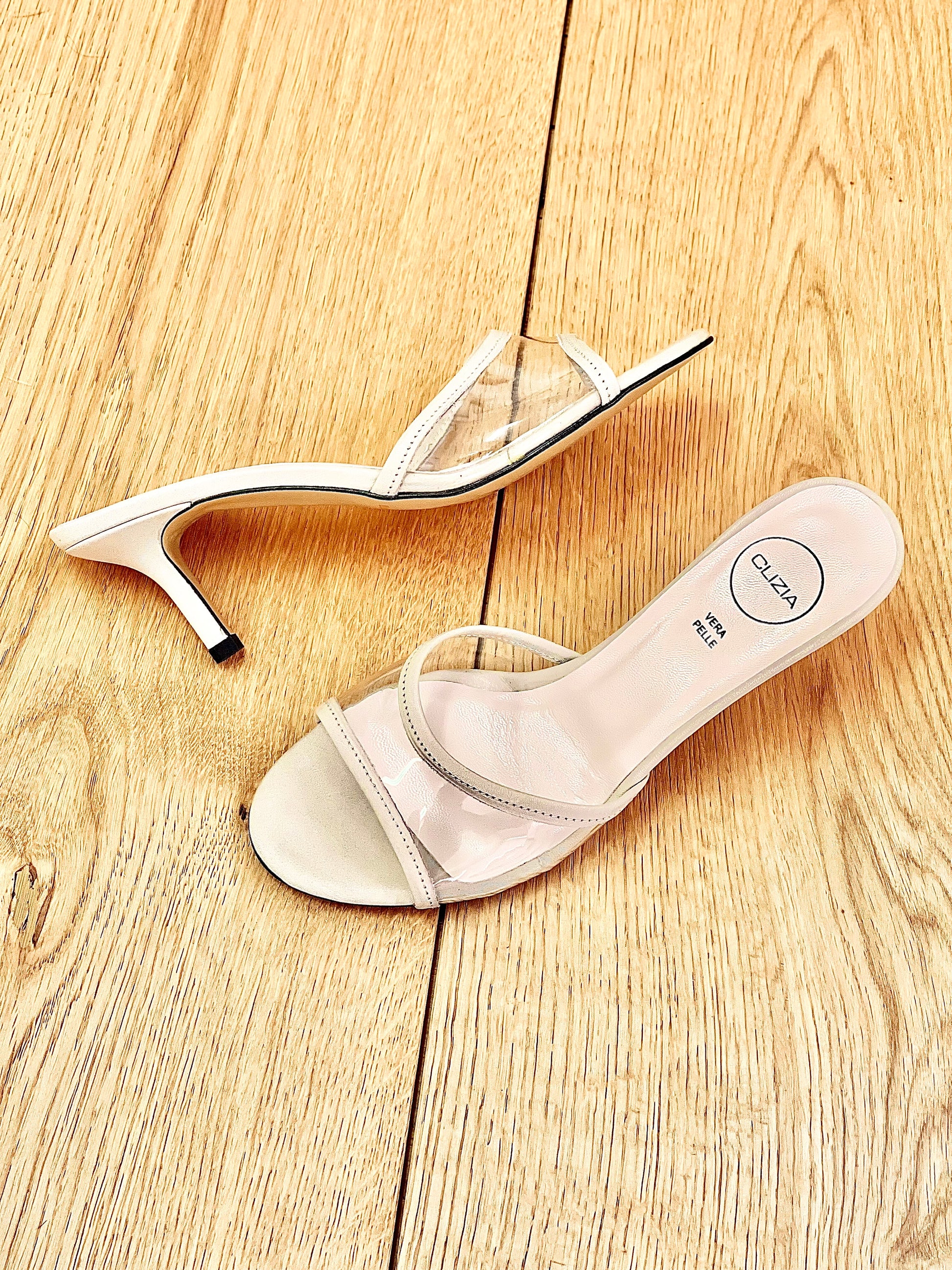 Sandales mules en pvc transparent et cuir avec talon de 6cm.