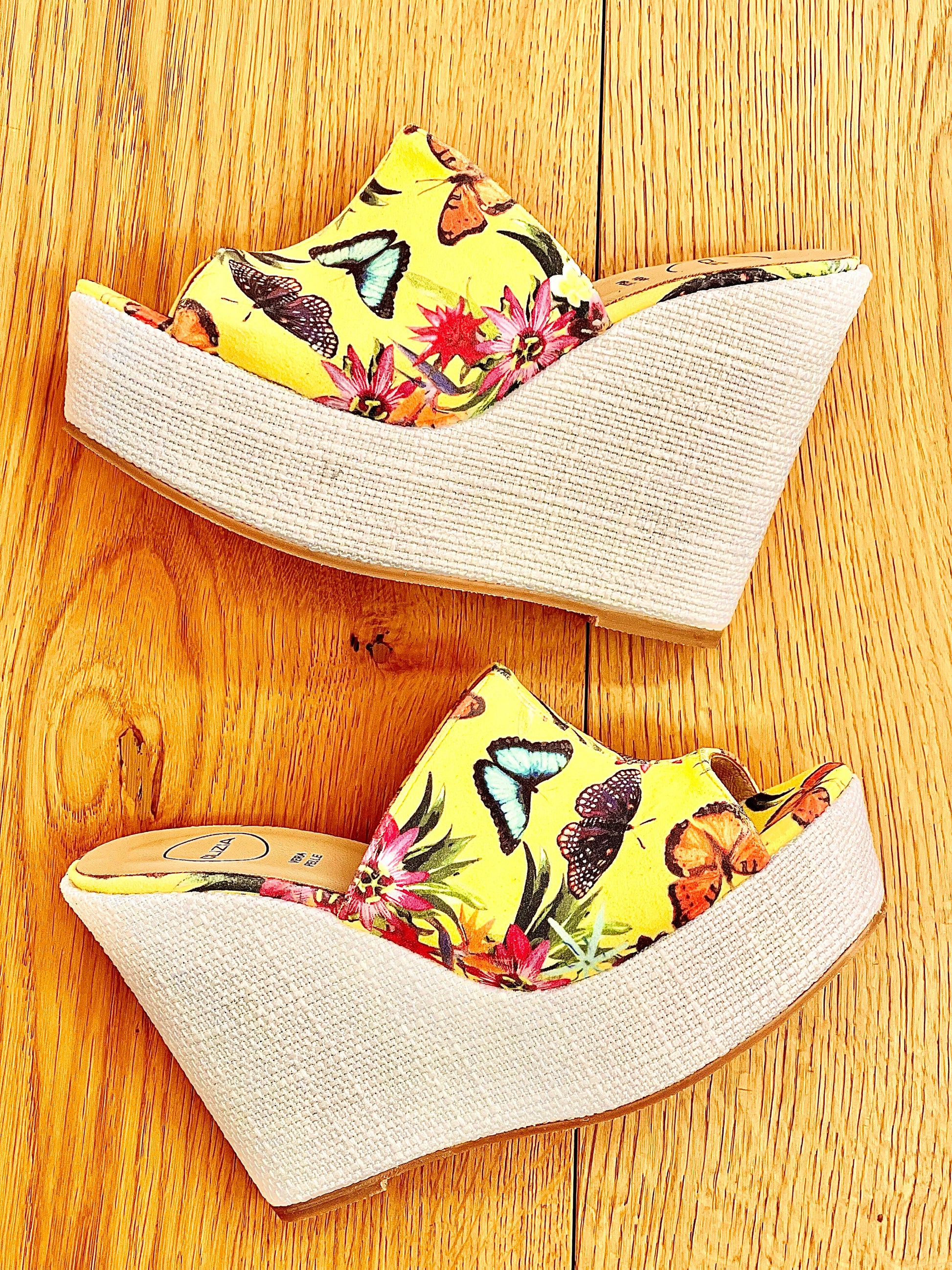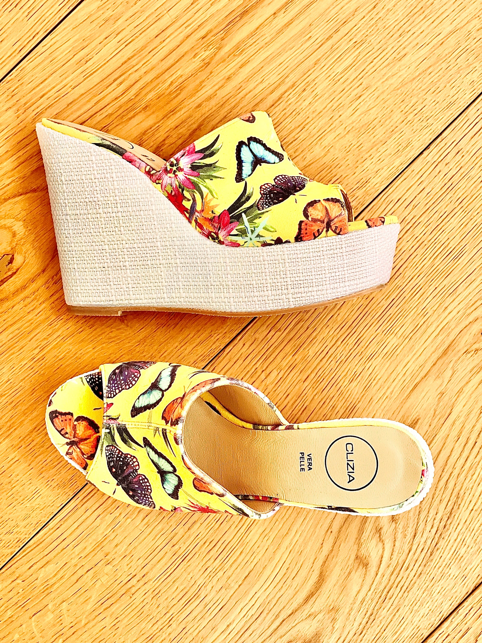 Sandales hautes en toile sur talon compensé de 11,5 cm.
