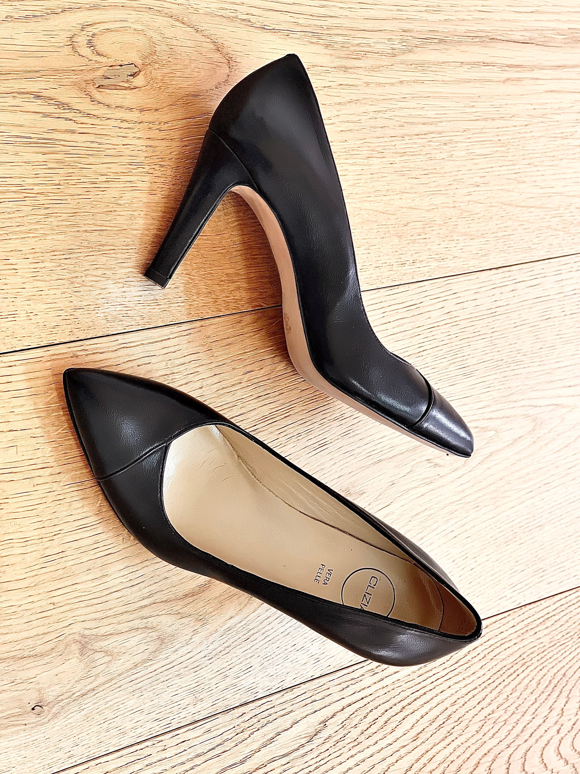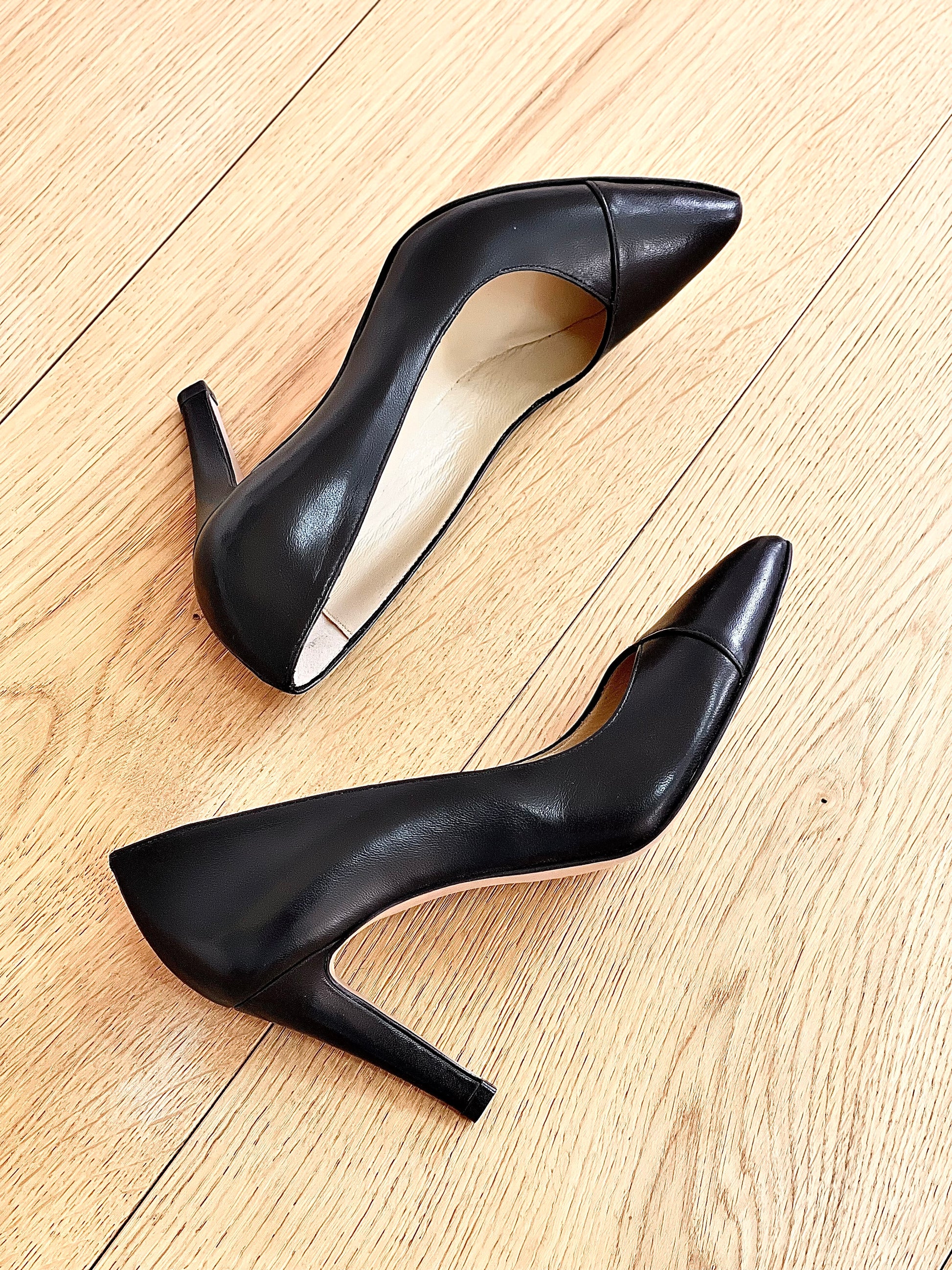 Escarpin à bout pointu et col en V en cuir à talon de 8 cm.