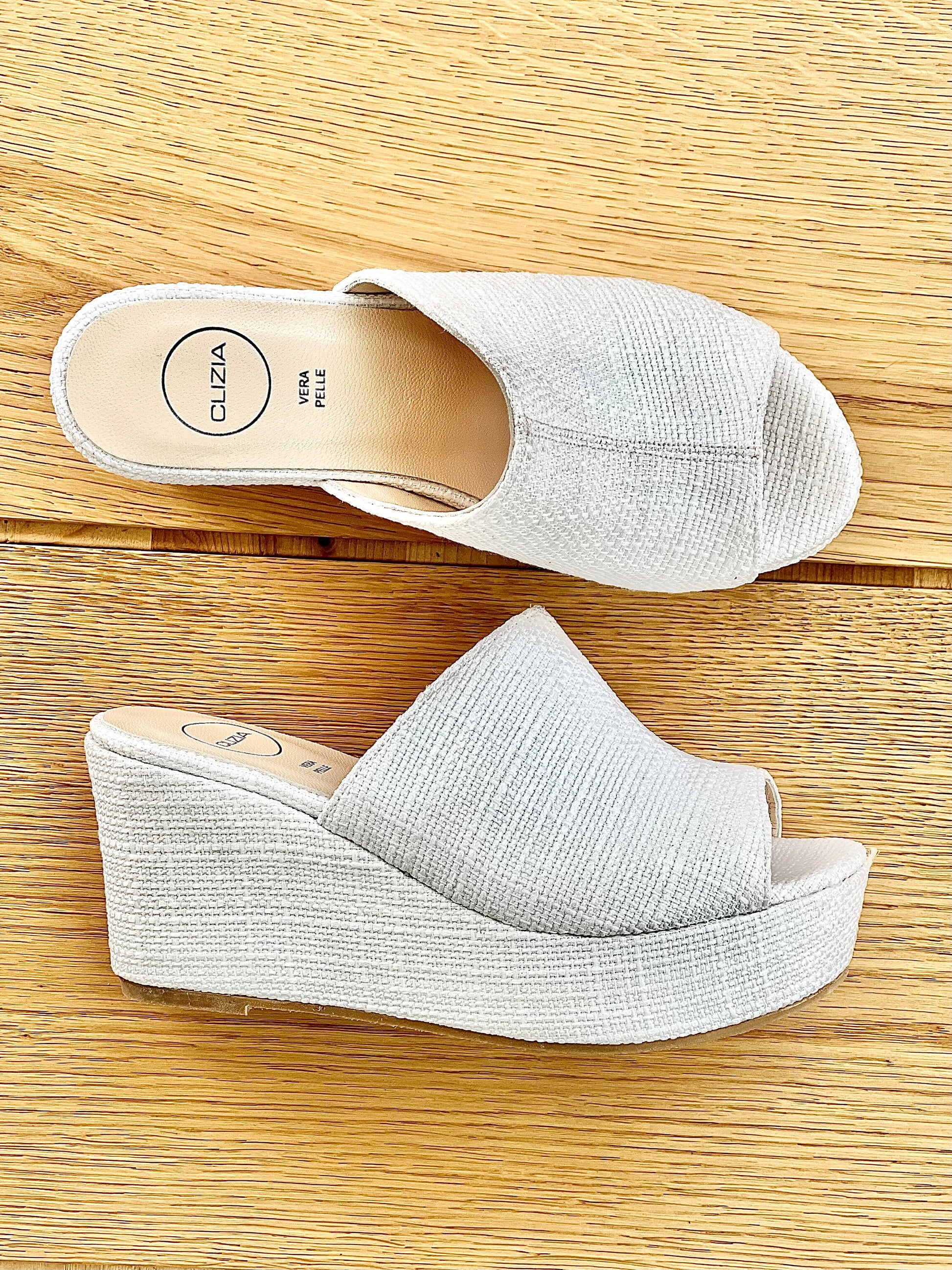 Sandales sabots en toile blanche sur talon compensé de 8 cm.